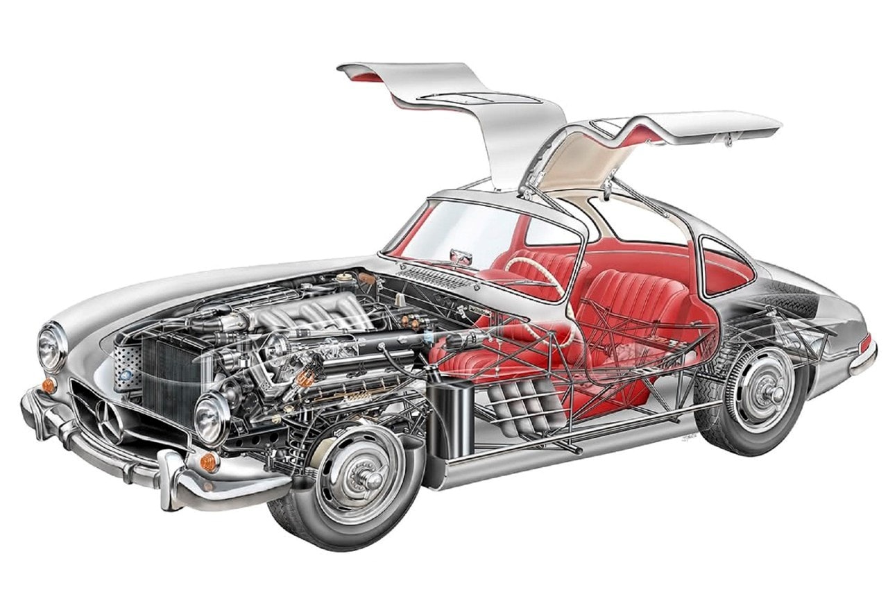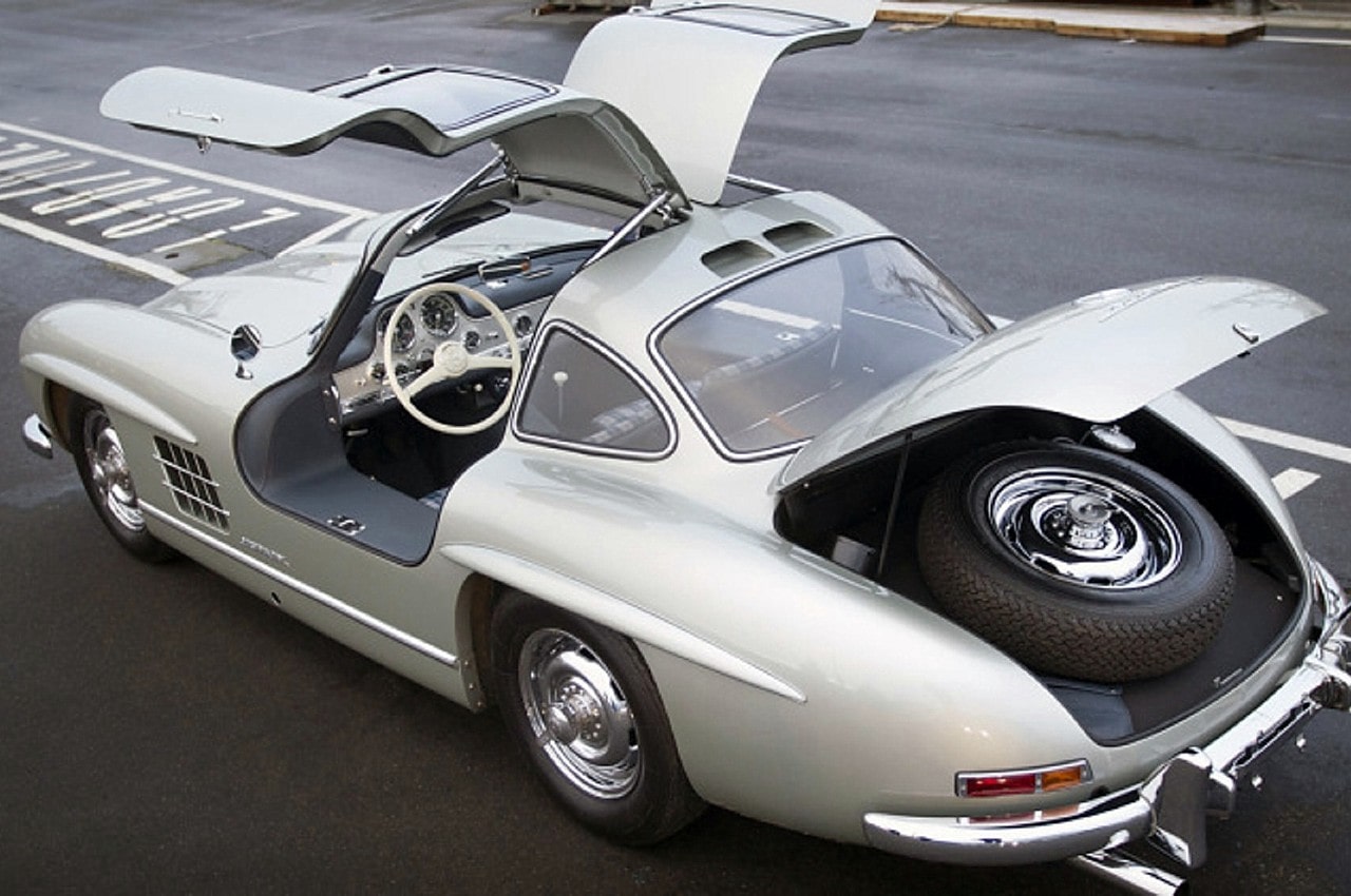 Avec son châssis tubulaire en acier mais avec un capot moteur, des portes ainsi qu’un couvercle de coffre réalisés en aluminium, cette 300 SL ( 300 indiquant la cylindrée de 3 l du moteur, SL pour « super leicht », super léger mais avec les pleins)…, ce coupé deux places qui pesait tout de même 1310 kg, étonnait également par ses portières qui s’ouvraient et se déployaient telles des « ailes de mouettes » : les « portes papillon » vont cependant rester dans la langue française.