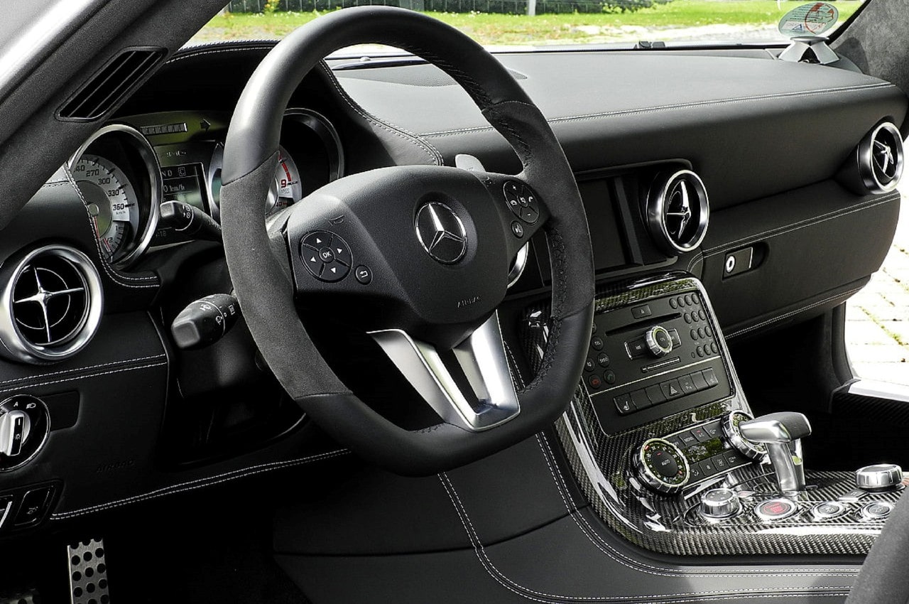 Intérieur sobre mais distingué, utilisation de carbone rappelant la compétition, présence de deux gros compteurs analogiques, un ordinateur multifonction s’occupe du reste…, la finition frappée de cuir et d’alcantara s’avère impeccable mais de nombreuses commandes auxiliaires sont reprises de la gamme Mercedes.