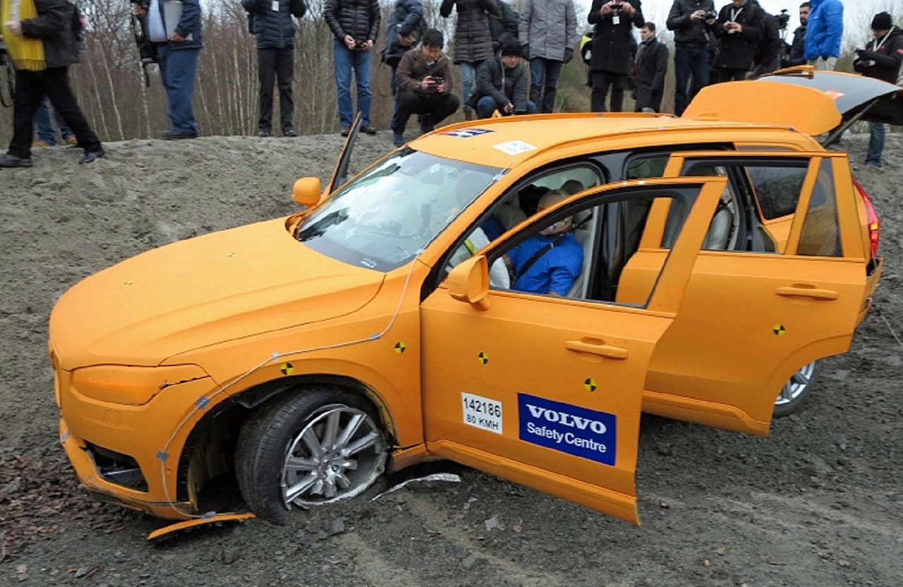 Imaginez un XC90 bardé d’appareils électroniques avec quatre mannequins à bord qui «quitte volontairement la route» à 80 km/h pour atterrir dans un fossé de 80 cm qui le catapulte en faisant un beau vol plané pour atterrir un peu plus loin, s’immobilisant sans le moindre dommage corporel pour les occupants, deux adultes et les deux enfants situés à l’arrière.