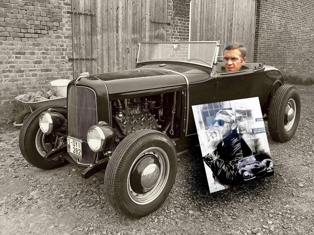 – Salut Patrice, j’espère que tout va bien pour toi. Je te réserve prioritairement le Hot-Rod que j’ai acheté, mais si tu ne suis pas, peux-tu me faire un petit montage photo ? En fait, j’ai l’occasion de vendre mon Hot-Rod à un fan de Steve McQueen… et j’aimerais une chouette photo de lui dans le Hot-Rod…