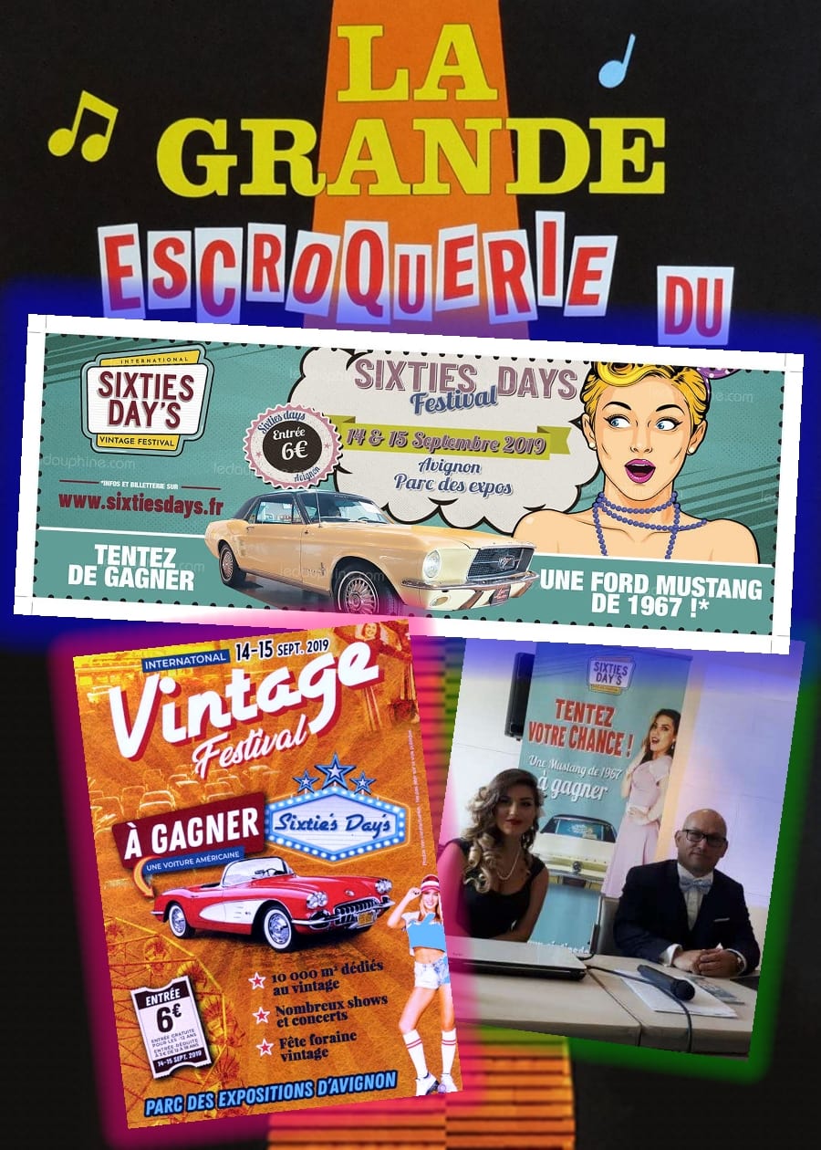 Le surlendemain de ce même évènement, le mardi 17/09/2019 à 09h11 toujours dans la rubrique “Faits divers/Justice/Avignon”, le journal “La Provence” titrait : “L’organisateur du festival Sixties Day’s a été interpellé et placé en garde à vue. Dimanche, il aurait quitté les lieux précipitamment au volant d’une Mustang destinée à la tombola qu’il organisait…, l’organisateur s’est-il enfui avec la caisse ? Après le salon consacré ce week-end aux années 60, le promoteur n’aurait pas payé ses prestataires. Des plaintes ont été déposées. Il a été arrêté Une Mustang jaune des années 60 qui disparaît au loin dans un coucher de soleil… Voilà une scène qui clôturerait à merveille un film d’aventures hollywoodien. Sauf que cette fois, l’action ne se déroule pas à Los Angeles mais bien à Avignon, qu’elle n’appartient en aucun cas au septième art, mais bien à la réalité. Cette scène, c’est celle à laquelle des prestataires et visiteurs du festival vintage “Sixties Day’s”, qui se déroulait ce week-end au Parc des expositions de Châteaublanc, disent avoir assisté. Hier, dès le début de matinée, le bruit se répandait comme une traînée de poudre sur les réseaux sociaux : “l’organisateur de l’événement est parti avec la caisse, sans prendre le soin de régler la plupart de ses prestataires”… Et cerise sur le gâteau, c’est au volant de la très belle Mustang de 1967, premier prix de la grande tombola, qu’il aurait mis les voiles. Très vite, le groupe “Arnaque Sixties Day’s Avignon” a vu le jour sur Facebook https://www.facebook.com/Arnaque-Sixties-Days-Avignon-112035200186387/ et les témoignages se sont enchaînés : Plusieurs milliers d’euros non payés !”…