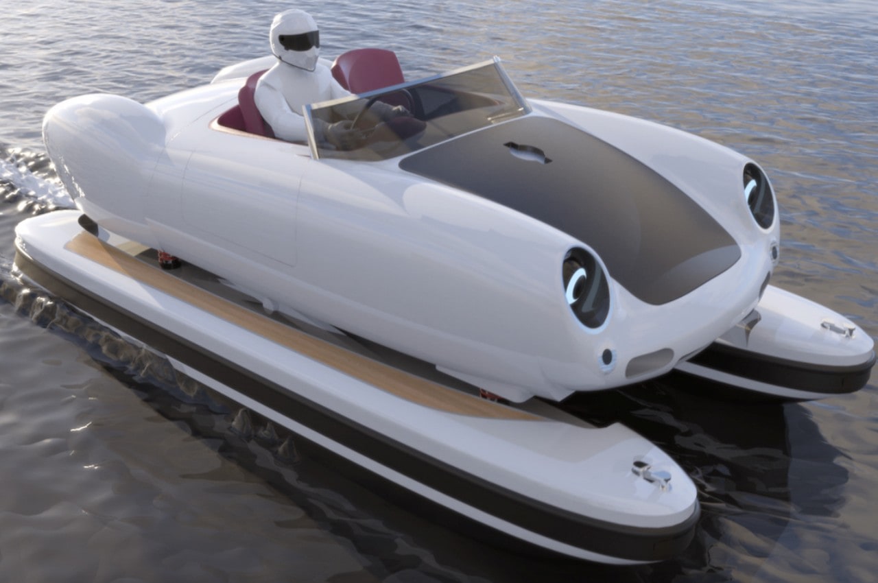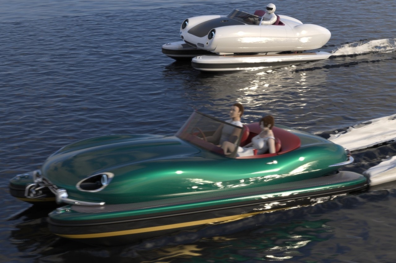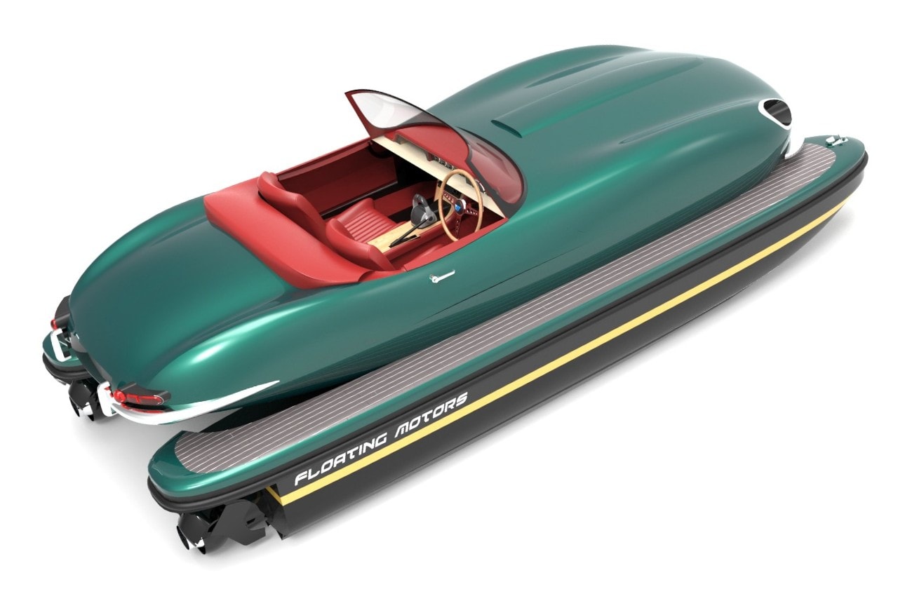 C’est pourtant là toute l’activité de la société Floating Motors (Moteurs flottants). Sa mission : s’accaparer du look d’automobiles emblématiques dites “de collection” pour en créer des copies/évocations destinées à devenir des supers pédalos originaux ! Connu pour ses concepts de motomarines innovants (comme le scooter de mer Vespa), ce génial créateur a ainsi souhaité poursuivre sur sa lancée visant un usage de loisirs nautiques, privilégiant les bords de mer ou de lacs plutôt que les croisières océaniques, d’engins “flottatoires” conçus pour divers moments de loisirs et de détente mais aussi comme annexes pour un yacht (par exemple).