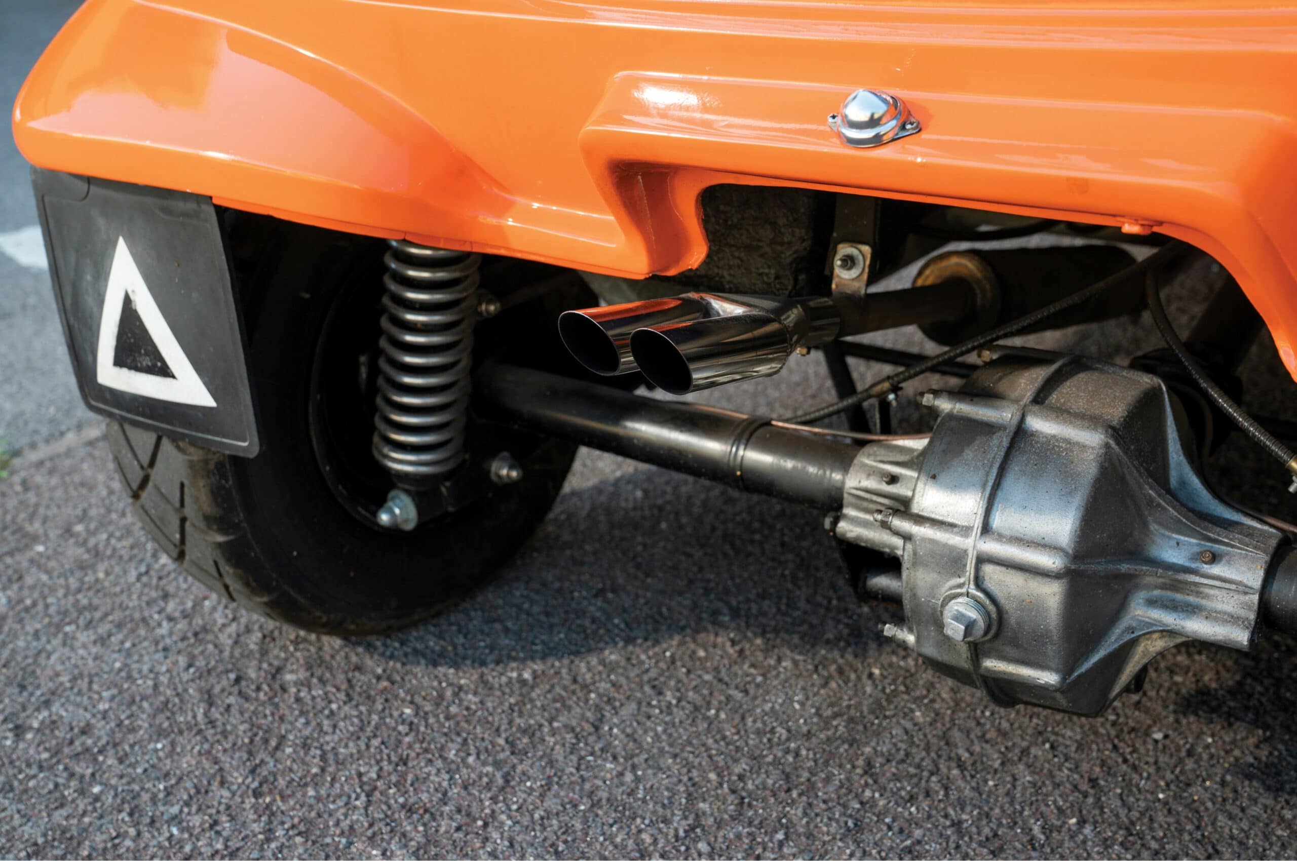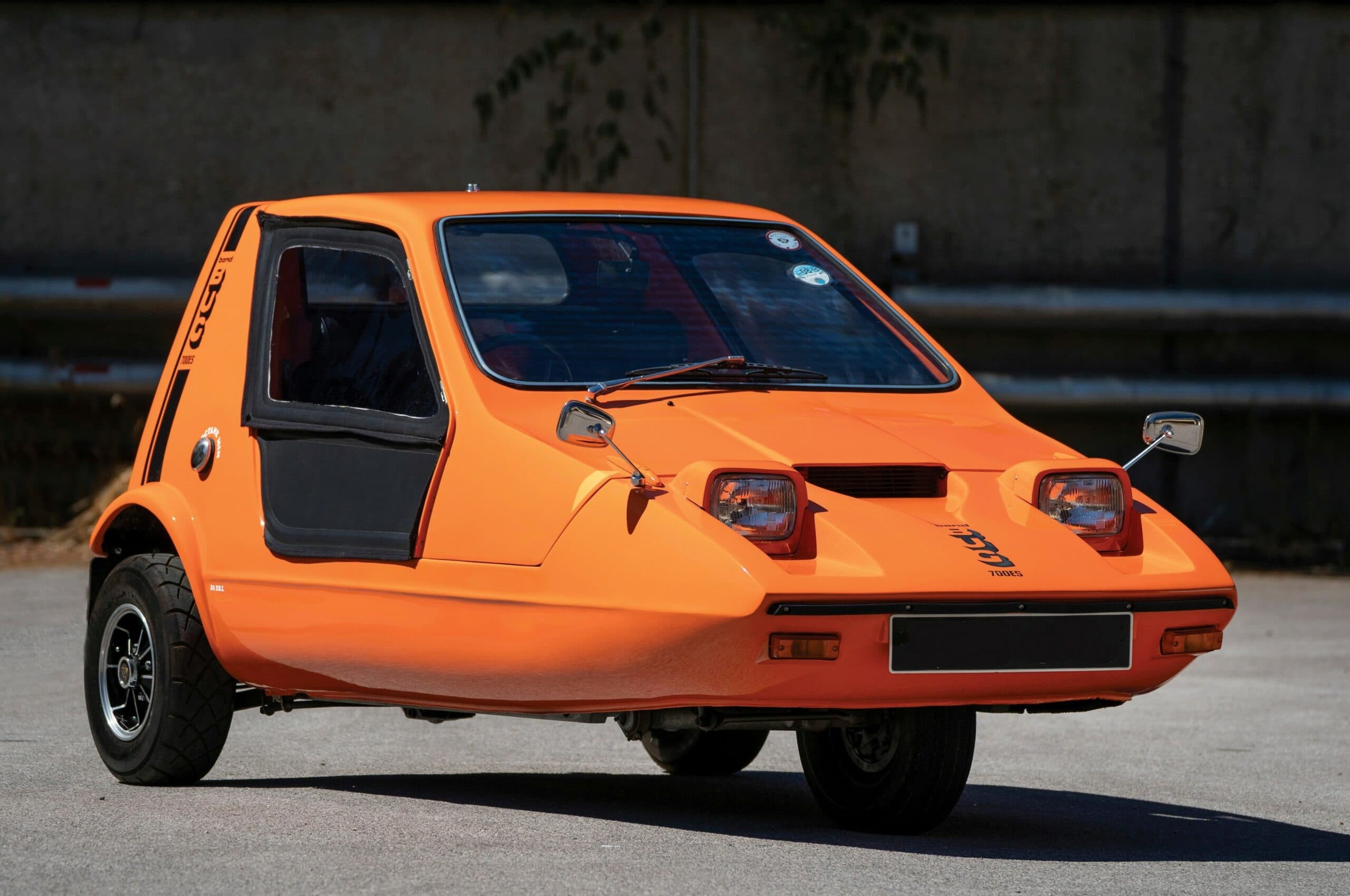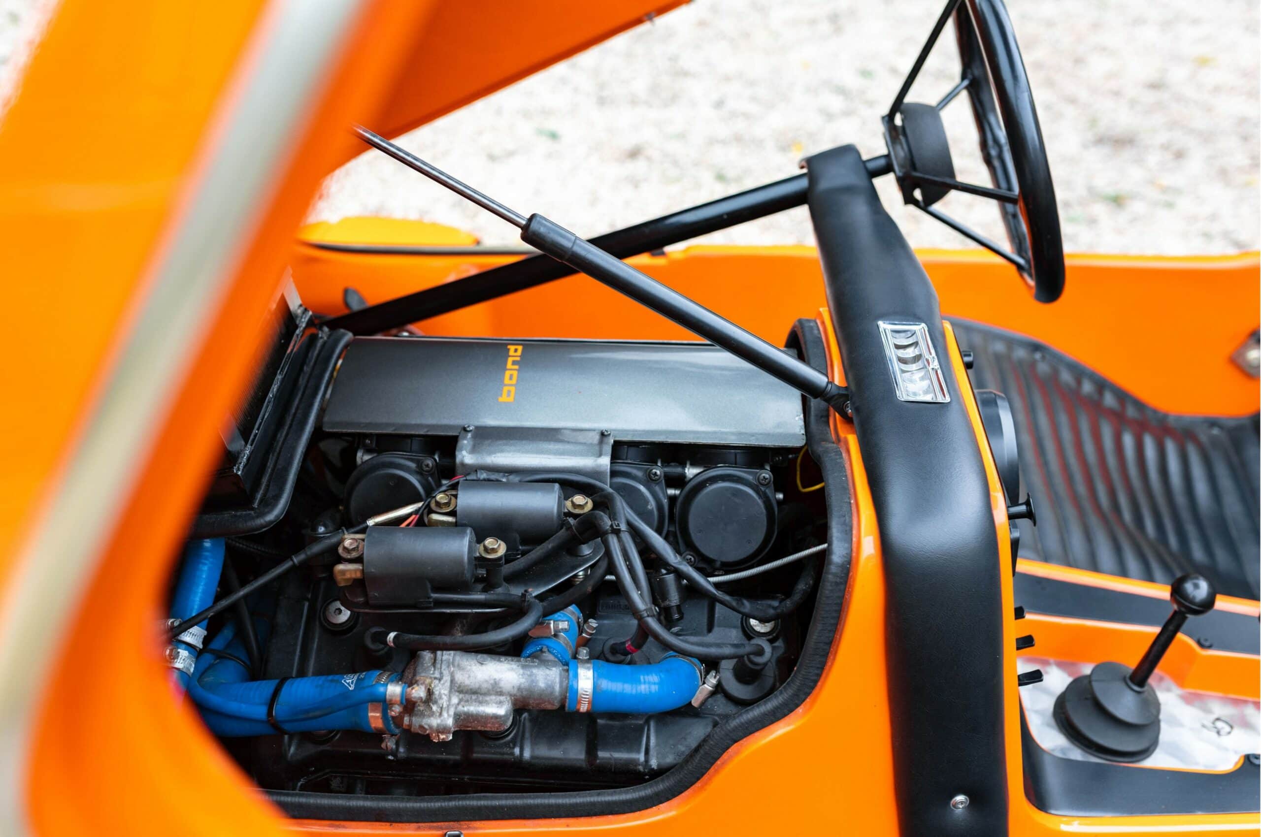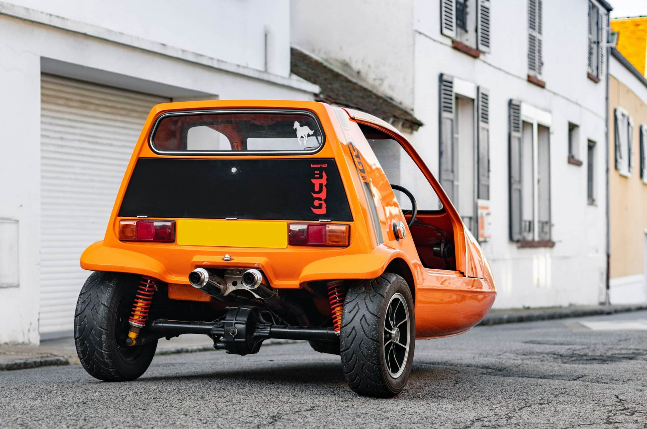 Une Bond Bug sort du lot car elle a été améliorée et réalise le 0 à 100 km/h en 3,5s et culmine à 200km/h ! Une Bond Bug supercar ? Oui ! Evidemment à l’origine, il s’agissait d’une Bond Bug 700 ES se positionnant comme un cyclecar-tricyle “sportif”. Le précédent propriétaire, un franco-anglais avait décidé de modifier le moteur d’origine par un Yamaha YZF-R1 de 1000 cc, 4 cylindres, 4 temps avec une boîte 6 vitesses ! Les trains roulants ont été revus pour supporter la puissance. Le tableau de bord de la moto a été également placé sur la Bond Bug qui est devenue une véritable fusée, immatriculée en carte grise française tricycle.