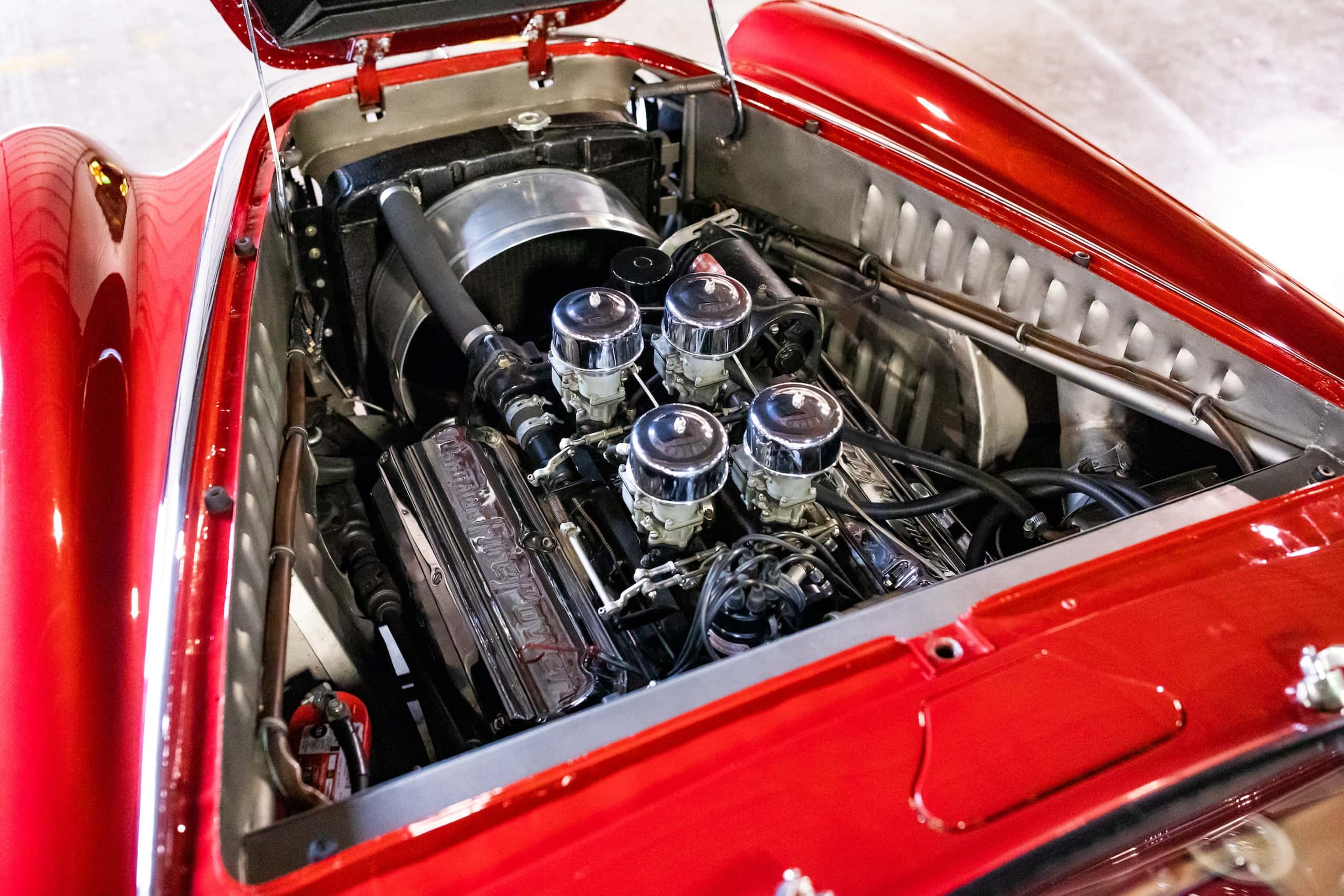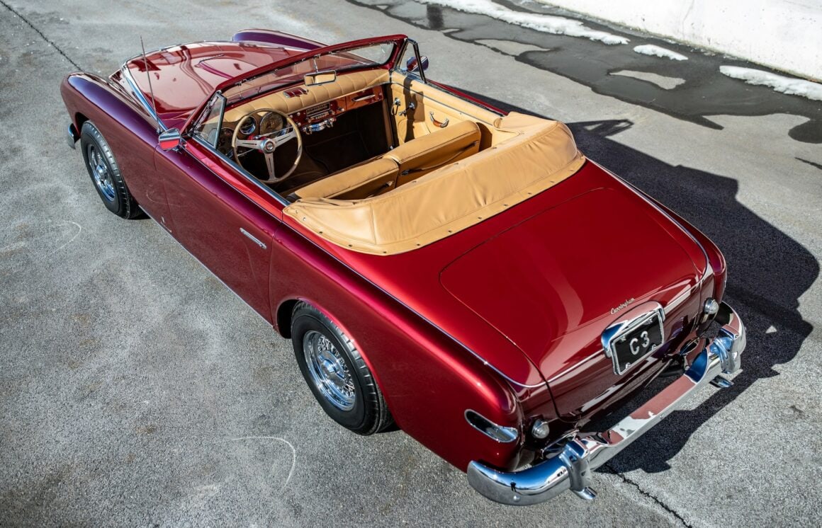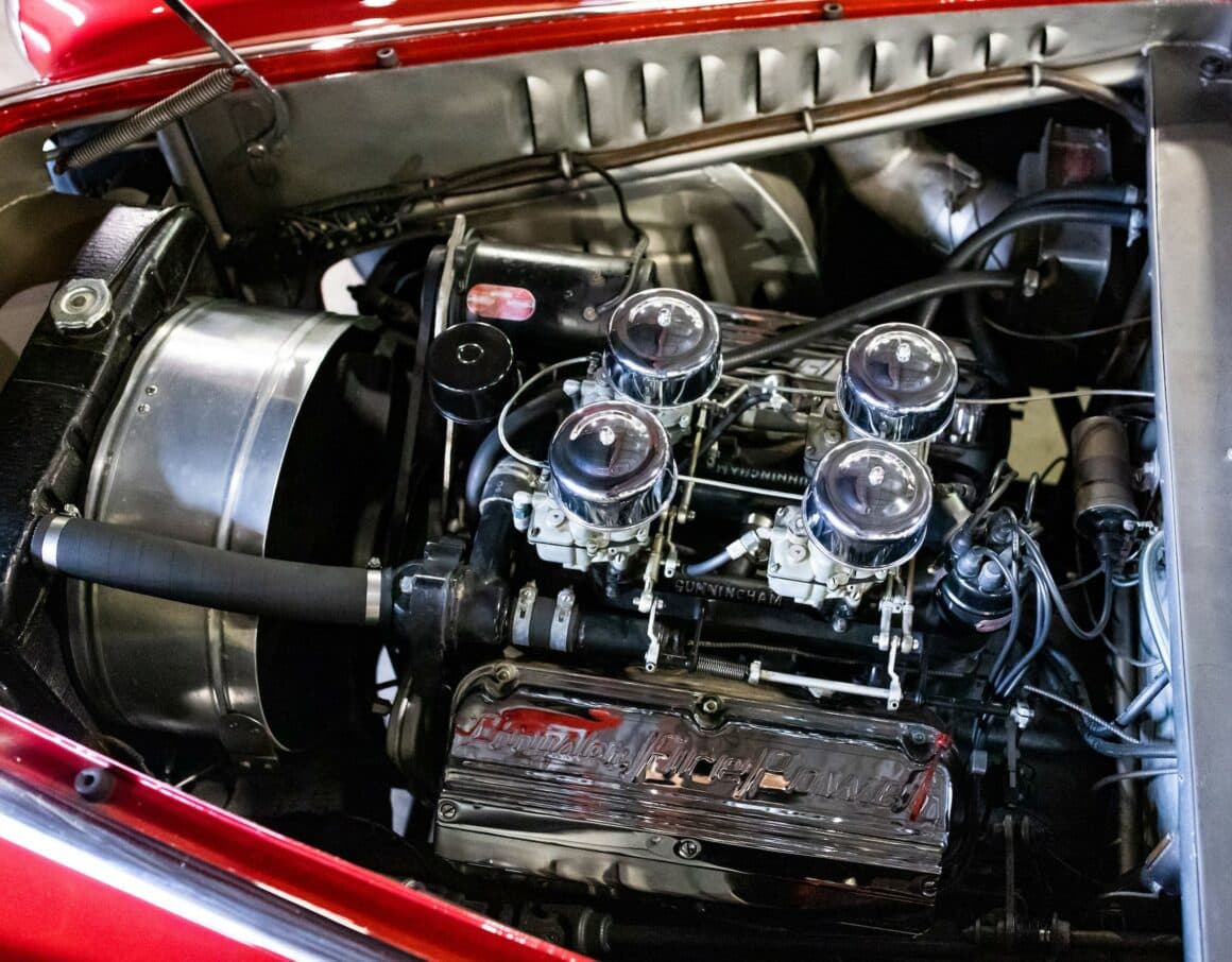 La C-3 a été construite sur un châssis “maison” de fabrication américaine, équipé de nombreux composants de voitures de production américaines d’époque, comme des pièces de suspension et de frein, des moteurs, des essieux et des transmissions. Cunningham a choisi d’utiliser le puissant nouveau V8 FirePower Hemi 331ci de Chrysler surmonté de quatre carburateurs Zenith à un seul corps. Dans la version de série de Chrysler, ce moteur produisait 180 chevaux, mais après une certaine attention des hommes de Cunningham, il produisait 220 chevaux avec 300 pi lb de couple, un chiffre de puissance prodigieux pour les années 1950. Une fois le châssis roulant terminé, celui-ci a été expédié chez Vignale en Italie, une entreprise de carrosserie qui avait également construit de nombreuses Ferrari dans les années 1950. Vous avez noté les similitudes entre les carrosseries de la Cunningham C-3 et de la Ferrari 212 Inter !