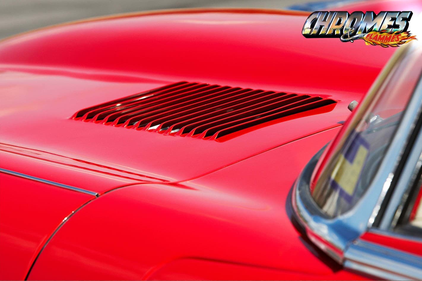 Ni plus une automobile classique qu’un Hot-Rod-Kustom, cette Jaguar E-Type est dans la lignée typique des Street-Machines des années’70, et avec raison. Véritables classiques britanniques, les Jaguar E-Type sont le plus souvent fidèlement restaurées dans leur état primal en conservant leurs spécifications d’origine pour être conduites (et non pilotées) aussi calmement que possible aux normes de la Gentry. Etant iconoclaste par vocation, ce n’est pas vraiment mon affaire, mais chacun fait ce qu’il veut dans les limites de plus en plus restrictives de la vie en société, ce qui nous mène à faire le pas en avant exigé alors que nous sommes au bord du gouffre du puits sans fond de la bêtise humaine. Les évènement d’Ukraine que je ne commenterai pas ici, laissent présager le pire… Cependant, quoiqu’un ras-le-bol me submerge, c’est l’aspect ludique de réaliser un article “autre” qui m’amène à le tapoter avec le bonheur de déranger à la fois les purs et durs des Muscle-cars Yankees ET les inconditionnels des Anglaises de “bon-ton”.