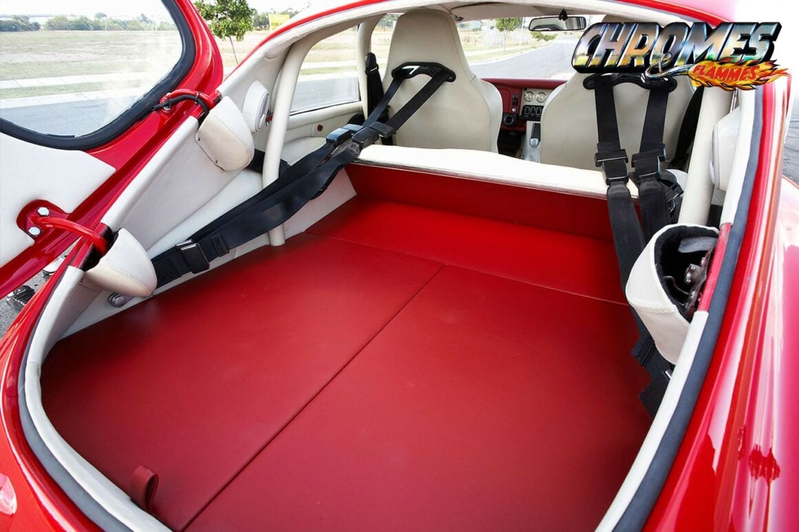 La version V12 de la E-Type Coupé 4 places fut le début de la fin. Avec le temps passant inexorablement, les versions E-Type en 6cyl comme en V12 ne sont pas les plus recherchées ni cotées. Le héros de l’aventure que je vous narre, prénommé Geoff, s’est donc senti libre et relativement à l’aise de la mettre en pièces pour en faire une hybridation avec la mécanique plus “Fun” d’une Corvette LS2, un V8 6L0 équipé d’une paire de turbos Garrett GT2876R amenant à une puissance de 700cv. Des jantes Mazzi en 20×8 habillées de pneumatiques en 245/30 ont été positionnées avec l’appoint de freins à disques de Jaguar XJSV12 à 4 pistons. Une autre conception (astucieuse) concerne le réservoir de carburant permettant que la roue de secours (en 20X8) est cachée sous le faux plancher. Les aménagements intérieurs comprenant un écran tactile avec caméra de recul, la voiture a été reconçue pour s’adapter au moteur, l’étape suivante consistant à s’assurer que le conducteur était apte à s’adapter à la voiture ! Il est donc parti pour recevoir des cours de conduite avancés individuels. Un plan intelligent en effet, surtout si l’on considère le rapport puissance/poids insensé de son chef-d’œuvre rétrotech magnifiquement conçu…