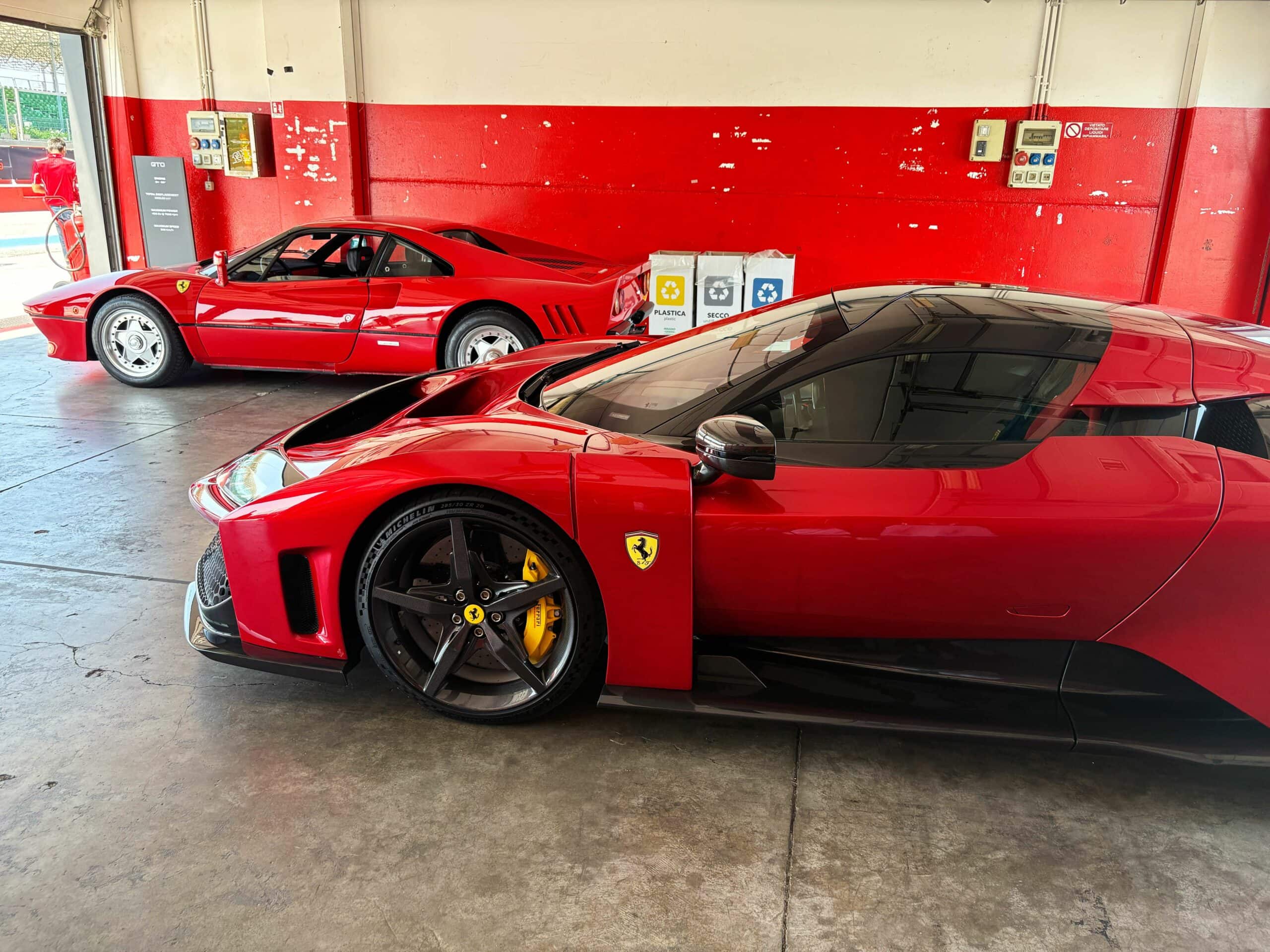 Hop on arrive, on est là, on zieute plutôt que regarder et on… Stop ! Je ne sais pas ce qu’en pensent les “on” que j’incorpore dans mon texte, mais me concernant en rapport à la Ferrari 288GTO qui semble être accidentellement là, entreposée dans le Box de la Ferrari F80 qui est la nouvelle icone à n’en écrire que des louanges, ce pour quoi les “on” sans moi, invité(e)s jacassent déjà entre-eux, je me dis que je ne dois pas oublier de tapoter en ouverture de texte que devoir “admirer” la vieille 288GTO avant de “tester” la F80 est une mise en condition psychologique mal pensée si pas mal venue…