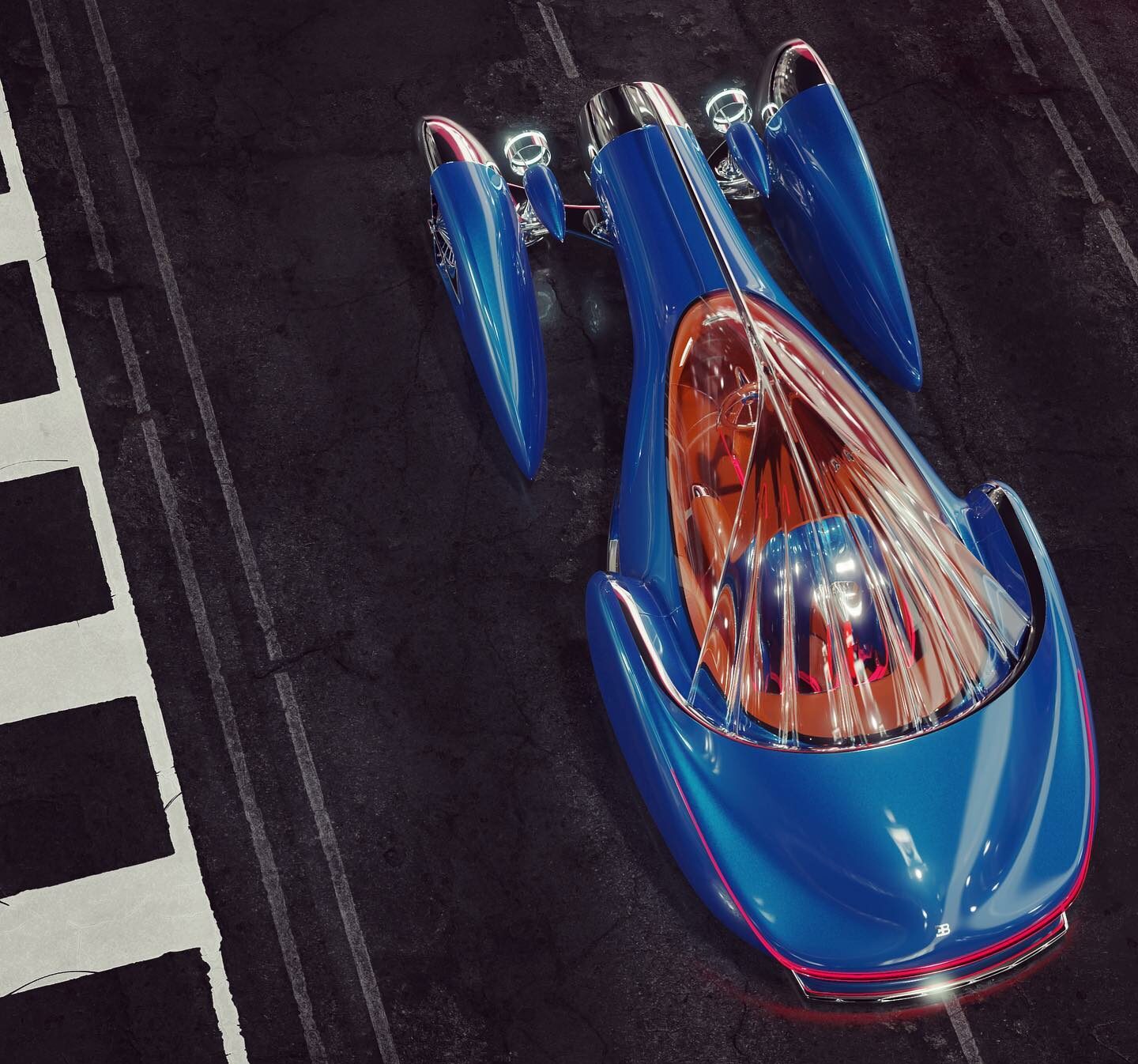 Quoi qu’il en soit en finale c’est bien loin des W16 utilisés par les modèles Bugatti/Rimac actuels… et la disposition de la voiture aussi. L’habitacle, recouvert d’un toit transparent en forme de coquille, ne cache pas que cette huitième merveille du monde (automobile) est une monoplace en position centrale de conduite avec le conducteur assis dans ce qui est d’évidence un trône Royal. On ne sait pas s’il y a un banc semi-circulaire à l’arrière pour y assoir quelques esclaves de l’Amour, somptueuses beautés carnivores et vénéneuses, ou si le trône central digne d’un empereur façon Donald Trump est le seul à l’intérieur.