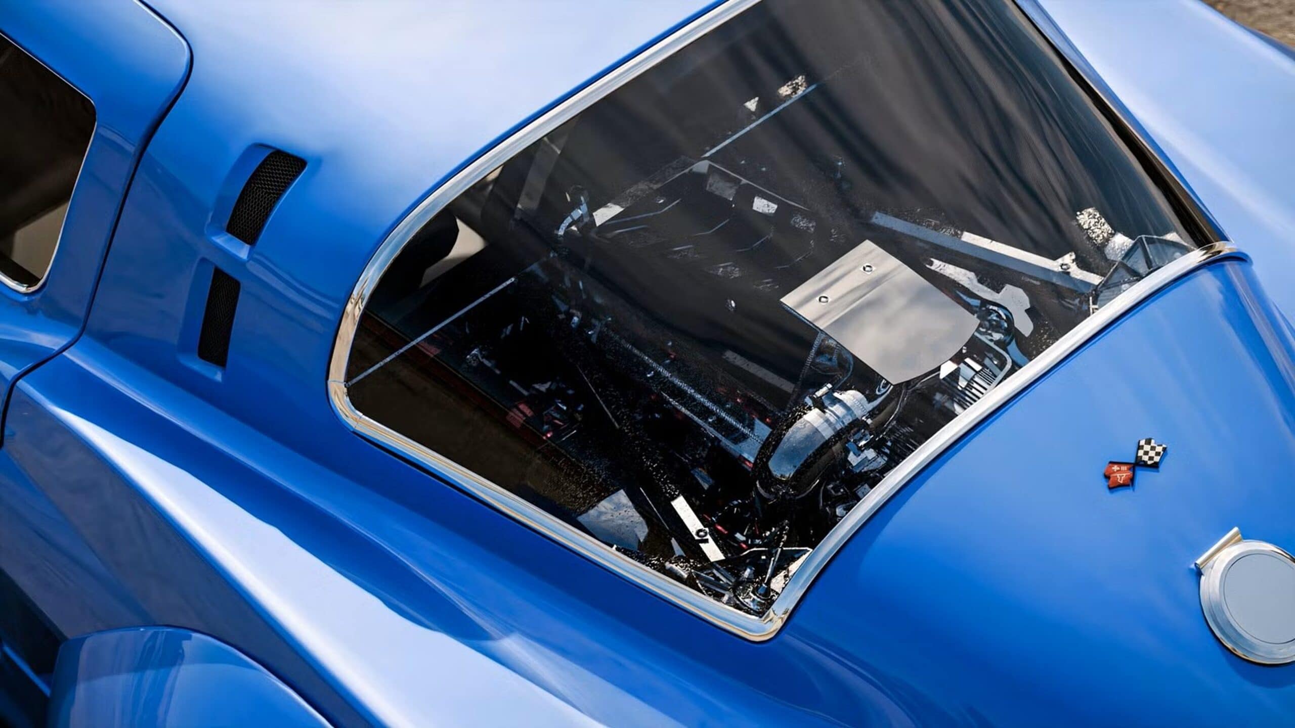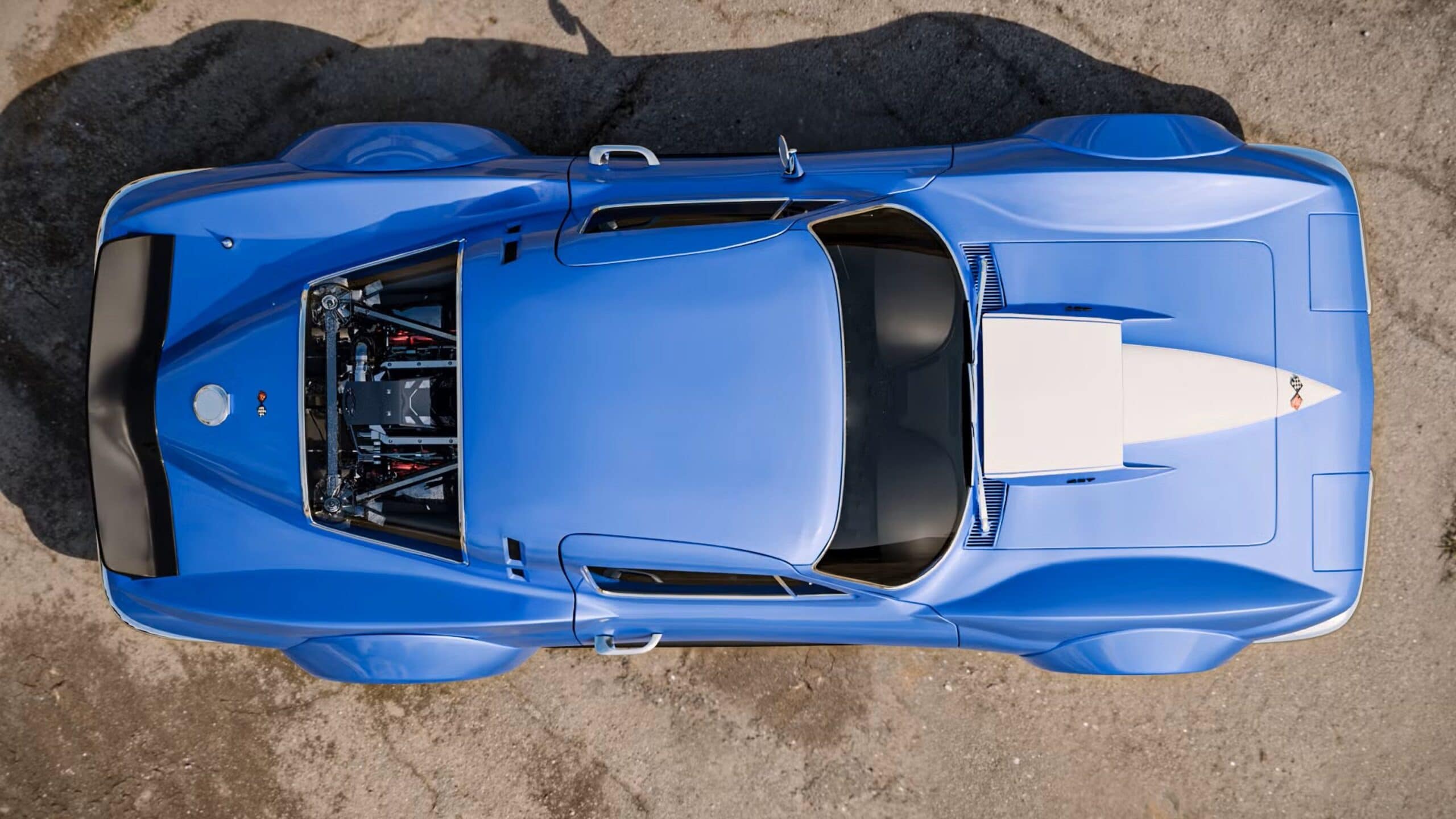 La folie a déboulé lorsqu’un ingénieur a suggéré de laisser le V8 AV en place et d’ajouter un second V8 central… Le résultat est maintenant difficile à ignorer. C’est sans doute la plus extravagante, la plus intrigante et la plus étonnante de toutes les Corvette’s jamais créées : une C2 Sting Ray à double moteur, AV et Central AR… Elle s’affiche avec des courbes sublimes, un capot emblématique en forme de “Stinger” (un terme de la langue anglaise désignant un dard ou une attaque rapide de serpents et autres animaux telle la Raie Manta). Tous les éléments visuels du modèle original sont toutefois restés en place, tout en apportant des modifications astucieuses pour l’adapter à une configuration à moteur central débouchant sur une version bimoteur…