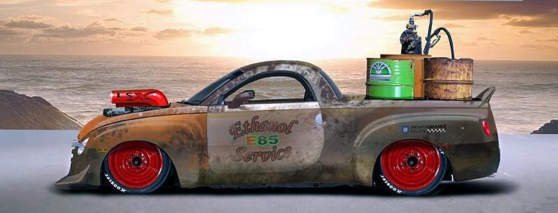La partie avant est toute en rondeurs et le capot plongeant se heurte à une barre horizontale en métal brossé dont les extrémités traversent les phares de route de part en part, c’est simple, mais drôlement impressionnant…, de plus, les garde-boue arrière se trouvent en relief par rapport à la caisse de chargement qui est refermée à l’aide d’un panneau ancré avec des charnières en sa partie avant.
