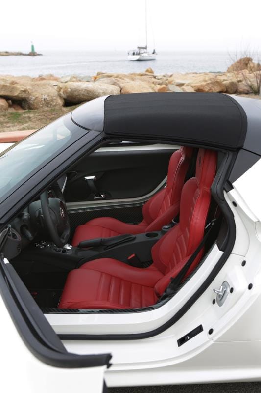 Pour le reste, j’ai noté la présence de nouveaux feux bi-Xénon, de jantes spécifiques, d’un capot arrière (sur le coupé il permettait de voir le moteur) remplacé par un élément en SMC non transparent. Une fois dans l’habitacle, on se retrouve en terrain connu…, peu de différences, la finition semble avoir un rien progressé mais ça reste toujours aussi basique, tout comme d’ailleurs l’équipement de série proposant toutefois (et enfin) des sièges réglables, le conditionnement d’air ainsi qu’une radio (tout simplement inaudible, le bruit du moteur étouffant tout, comme dans un hélicoptère).