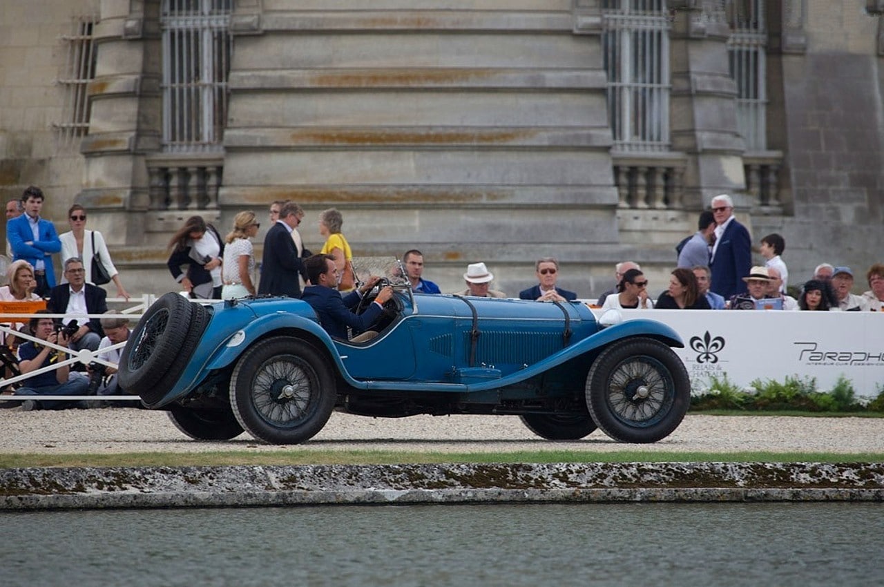 – Or, pas du tout… loin d’être « disparue et retrouvée », l’Alfa 8C immatriculée en France, qui avait été examinée et photographiée par l’expert de chez Bonhams pour constituer un dossier de valeur et de vente par catalogue et voie de presse… a été présentée au concours d’élégance du château de Chantilly avec une plaque d’immatriculation britannique récente (voir info DVLA britannique) ce qui indiquerait que cette voiture, joyau du patrimoine automobile national Français aurait été vendue au Royaume Uni d’Angleterre SANS avoir obtenu l’autorisation des services patrimoniaux Français…