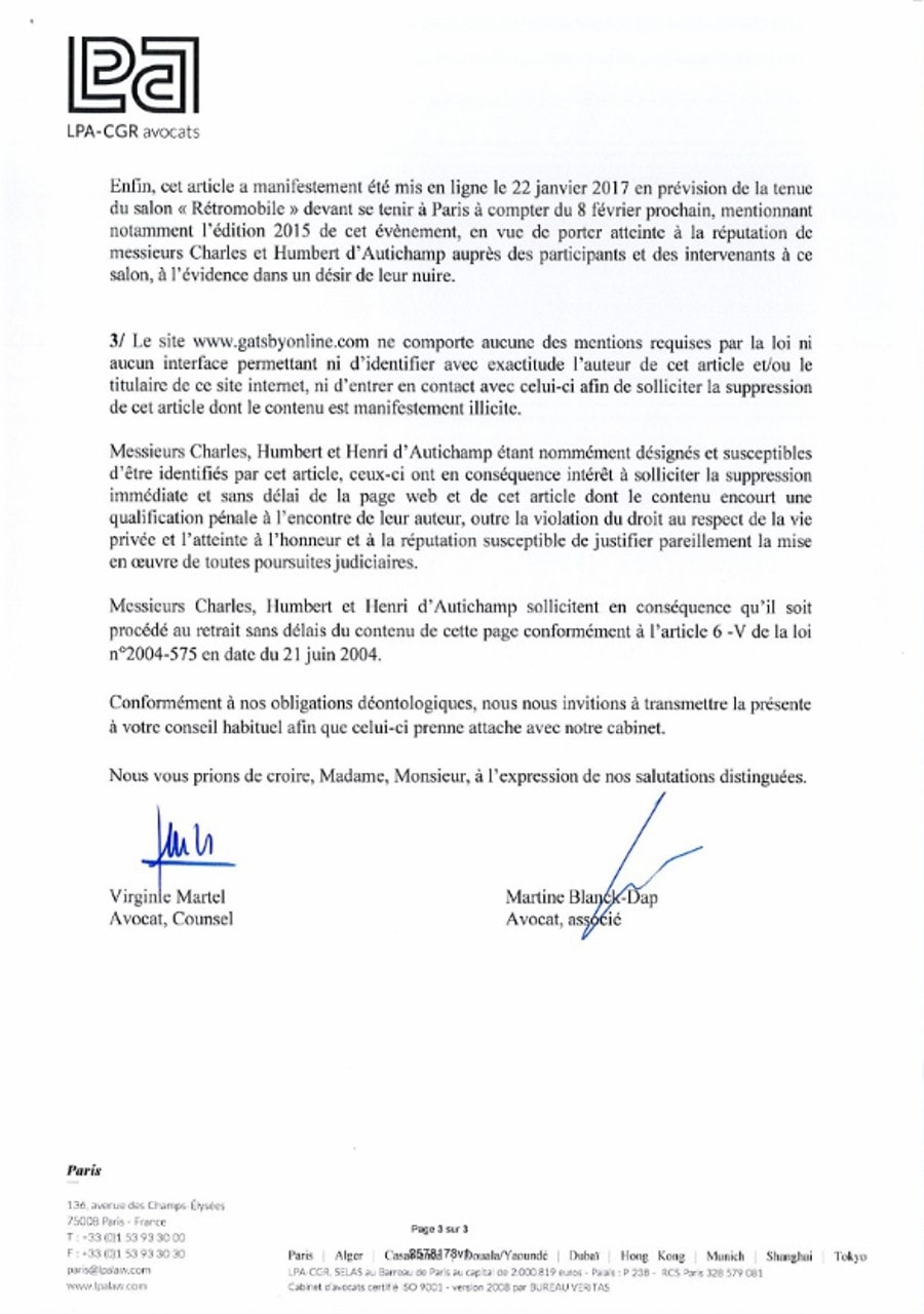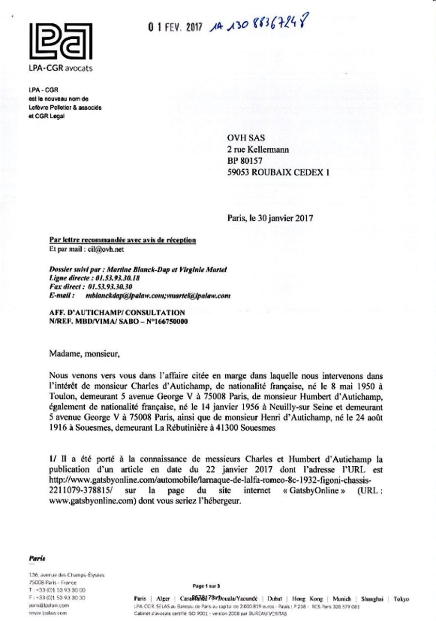 Via un bureau d’avocats situé aux Champs-Elysées à Paris, l’ex-propriétaire de l’Alfa 8C, dont il est question ci-avant, a envoyé à l’hébergeur de http://www.GatsbyOnline.com, un courrier menaçant par chantage à poursuites judiciaires, exigeant la non-publication de celui-ci et/ou son effacement intégral, au mépris de la liberté de la presse et d’opinion qui est protégée par les lois puisque je dispose du statut de journaliste avec carte de presse et que mon site-web est un média…