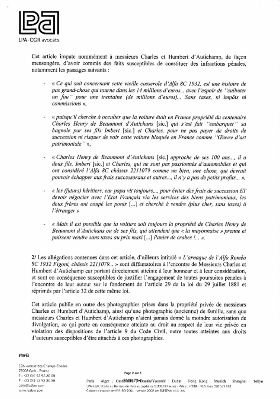 Et…, par exemple, pour ce qui est de cette affaire de deux Alfa Roméo identiques, pression est faite par le propriétaire de la seconde Alfa qui serait la seule vraie Alfa Roméo 8C 1932 Figoni : châssis # 2211079… non pas auprès de Bonhams qui a vendu la première en affirmant qu’elle était vraie… et auprès de qui ils ont demandé l’expertise de leur collaborateur Grégory Dewailly…, mais envers qui a remarqué que cette Alfa était récemment immatriculée au Royaume Uni d’Angleterre alors qu’elle était un chef-d’œuvre, un réel objet d’art du patrimoine national français qui disposait encore l’année dernière de son immatriculation française, ce pourquoi il était impératif de remercier et louer MONSIEUR de Beaumont d’Autichans d’avoir préservé ce joyau unique au monde en France, depuis “toujours”…