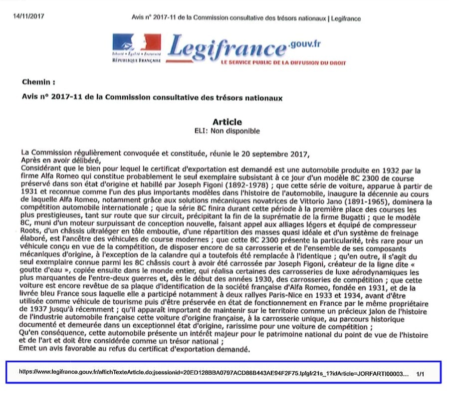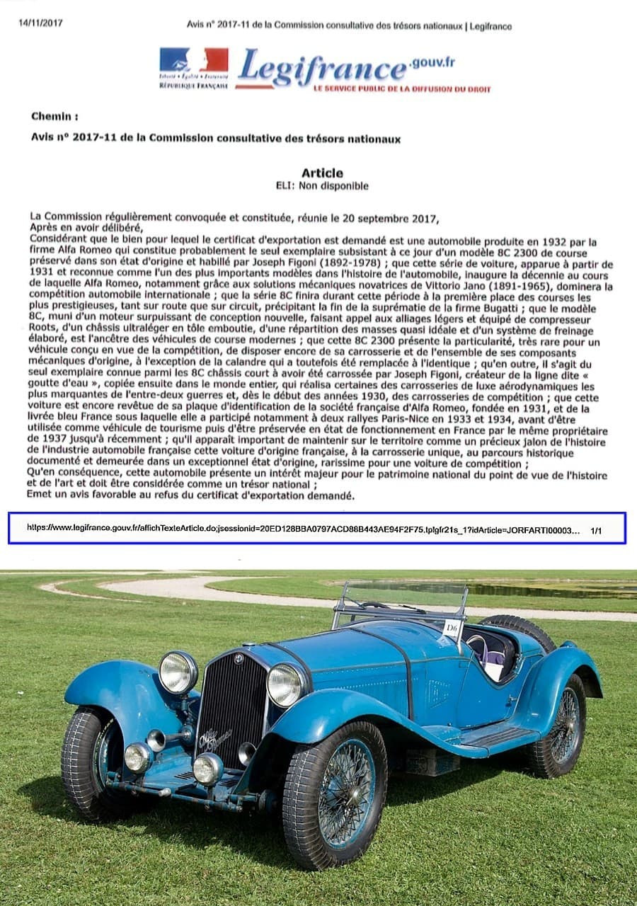 L’Alfa Romeo est classée “Trésor National” et ne peut quitter le territoire Français !