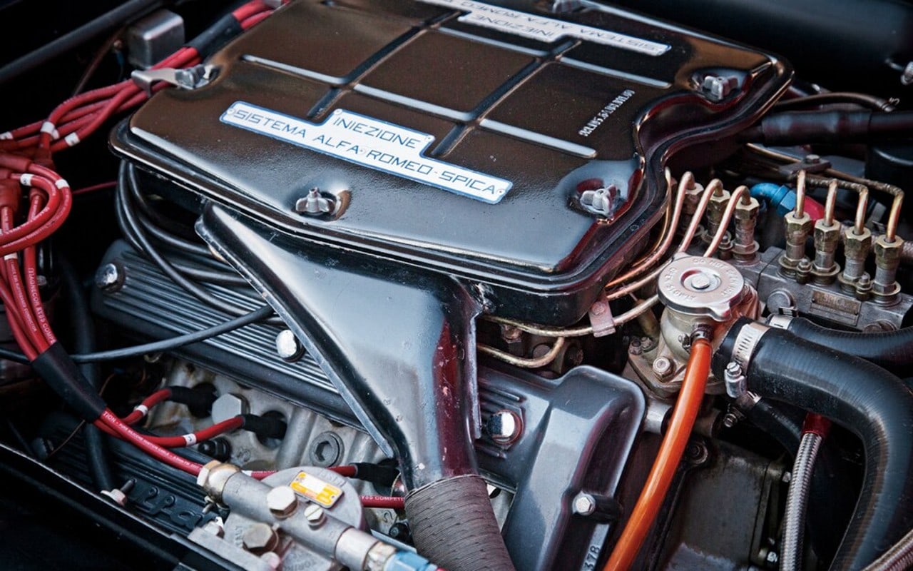 Bien que le moteur ait quatre cames comme tous les autres V8 à DACT, ce sont quatre cames uniques. Cela signifie que vous ne pouvez pas simplement téléphoner à votre sympathique fanatique garagiste Alfa du quartier et demander n’importe quel vieil arbre à cames de Montréal, oh, non. Vous devez savoir précisément lequel vous avez besoin. Juste pour garder les choses compliquées et coûteuses, la came d’échappement du passager entraîne le distributeur; l’arbre à cames d’admission passager n’entraîne rien, la came d’admission du conducteur entraîne le système d’injection de carburant SPICA, tandis que l’échappement du conducteur, comme l’autre came d’échappement, ne conduit rien !