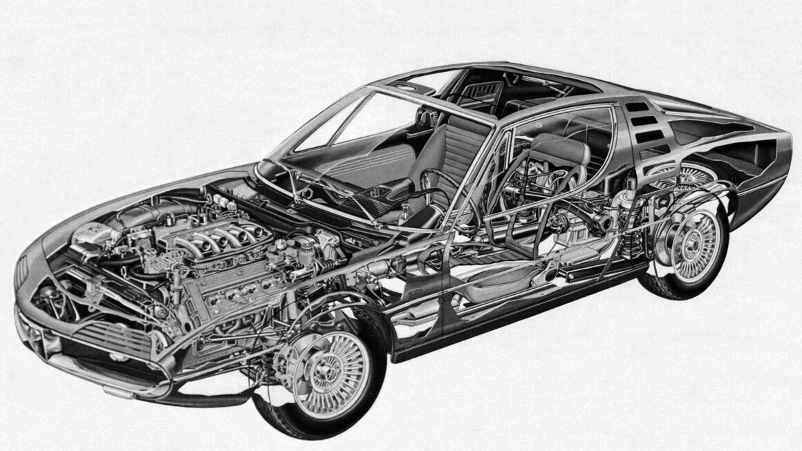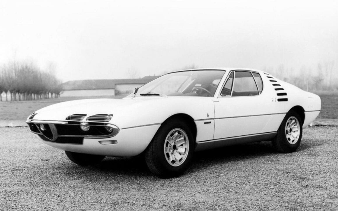 En 1967, Alfa Romeo avait apporté un coupé de luxe sexy à l’Expo de Montréal. L’engin n’avait pas de nom, c’était juste un concept Alfa qui était censé représenter “la plus haute aspiration de l’homme dans le domaine automobile” (sic et gag !). Les éléments de châssis et de suspension étaient identiques à d’autres Alfa plus basiques et courantes, comme la Giulia ou la GTV. Mais le show car avait un as dans sa manche, un jeune homme travaillant chez Bertone nommé Marcello Gandini l’avait conçu. Les “cognoscenti” de voitures “à-la-con” parmi vous, savent sans doute que Gandini a ensuite conçu des chefs-d’œuvre hors-de-prix et mal foutus, quasi-inconduisibles, comme la Lamborghini Countach et la Lancia Stratos.