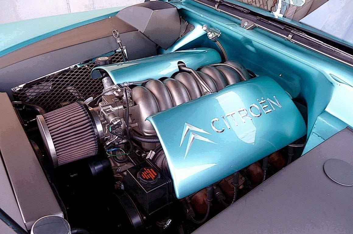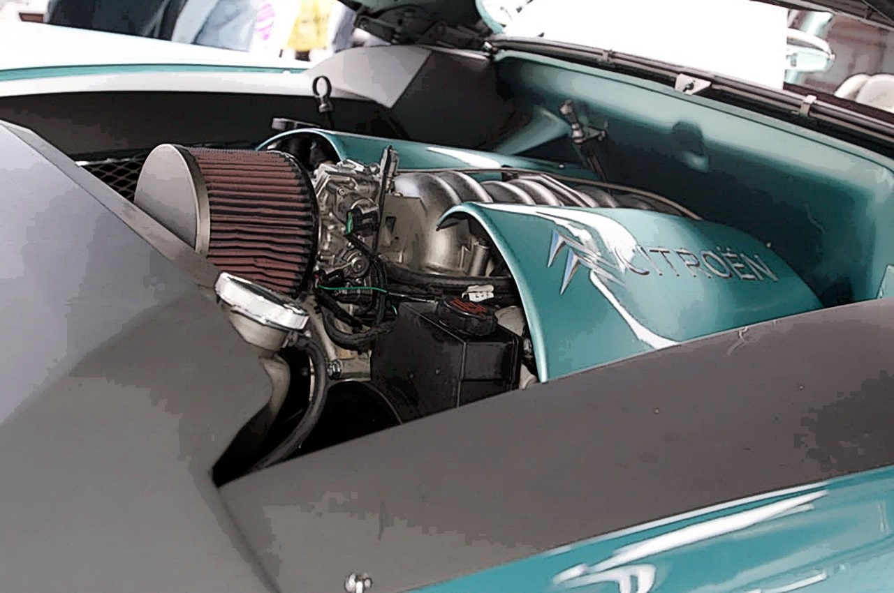 Les trains roulants qui ont été placé sont ceux d’une Mustang II… et pour la motorisation, c’est un Chevrolet Corvette LSA de 410chevaux qui a été choisi avec sa boîte automatique…, la structure de la carrosserie Citroën étant assez fragile, avec le toit en fibre de verre attachée par quelques boulons à une structure métallique très mince…, pour consolider l’ensemble, Auto Body Kreations a construit une structure de type cage de sécurité en tubes, qui a été soudée dans les piliers B, A et C pour la rendre presque invisible à l’intérieur de la voiture.