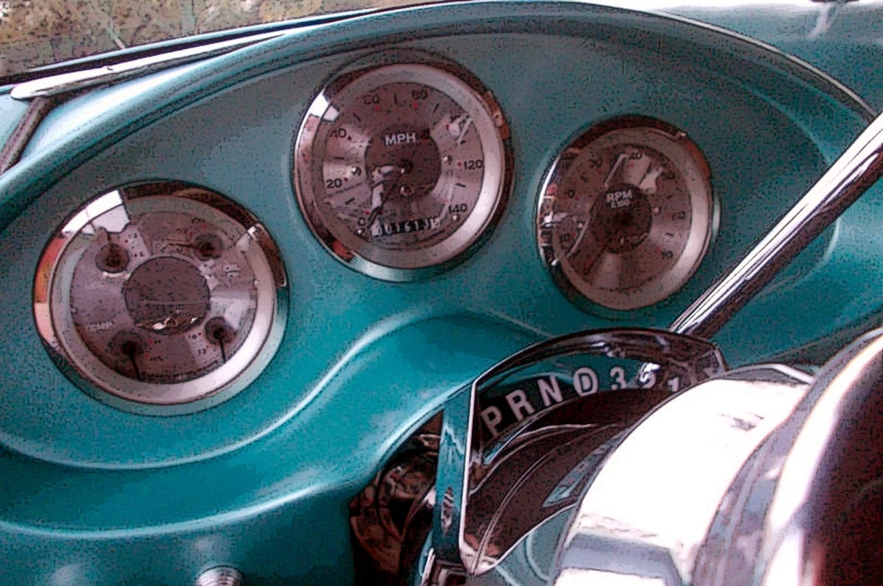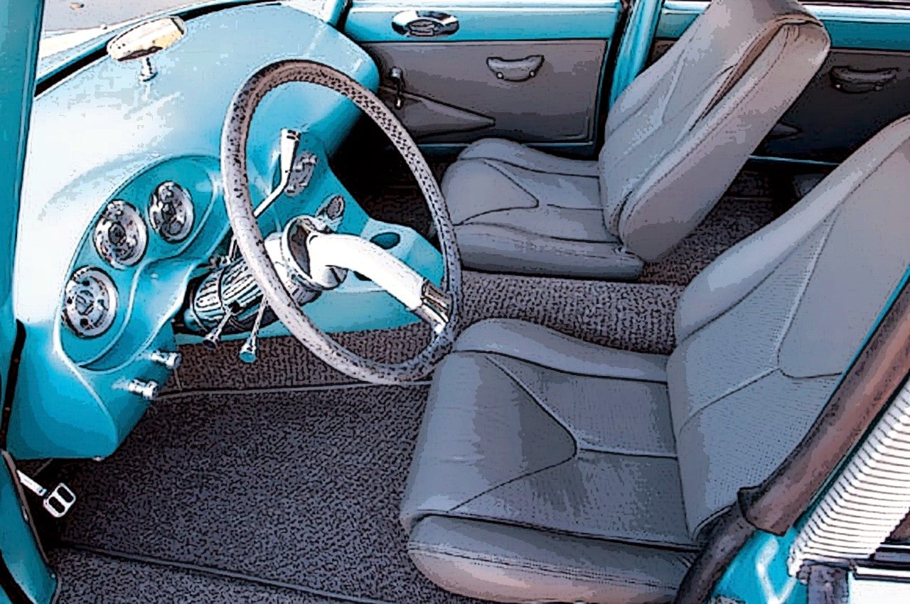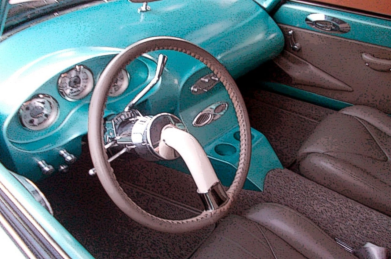 Un nouveau tableau de bord et une console centrale ont été fabriqué en acier selon les spécifications de Meyer et le volant typiquement Citroën avec sa colonne de direction ont été adaptés…, à l’extérieur, une grande partie de la carrosserie est restée d’origine, sauf les pare-chocs soudés entre eux sans les “bumperettes”…, la plaque d’immatriculation nécessitant un peu plus de travail que prévu…, la couleur choisie fut un “Tease Teal” de DuPont, cette couleur “cyan” venant du catalogue de la Volvo 457…, le toit fut peint en blanc perlé…, la touche finale étant apportée par des jantes Stiletto de chez Billet Specialties, 18×9 à l’arrière et 18×8 à l’avant, avec des pneus 245/45-18.