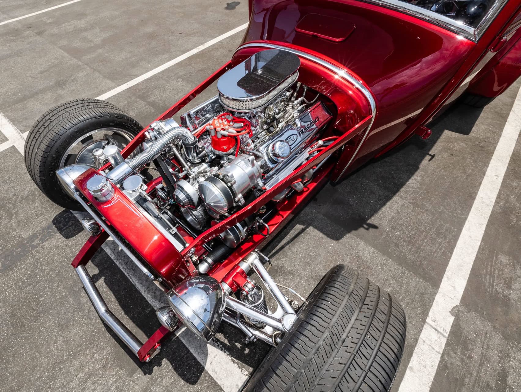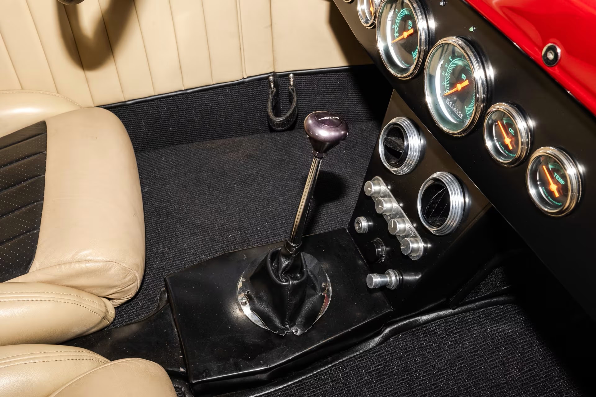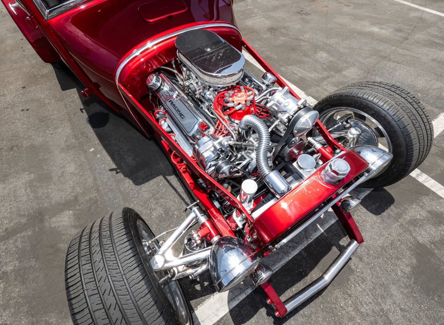 Il est associé à une transmission automatique. Le bloc a été réalésé de 0,76 mm et doté d’un vilebrequin et de bielles Ford Racing. Deux batteries de 6 volts câblées en série et un allumage MSD assurent l’allumage, un réservoir de carburant en acier inoxydable abrite l’essence qui alimente le moteur, et un système d’échappement sur mesure délivre termine la respiration/expiration du V8 avec la sonorité caractéristique des small blocs Ford.