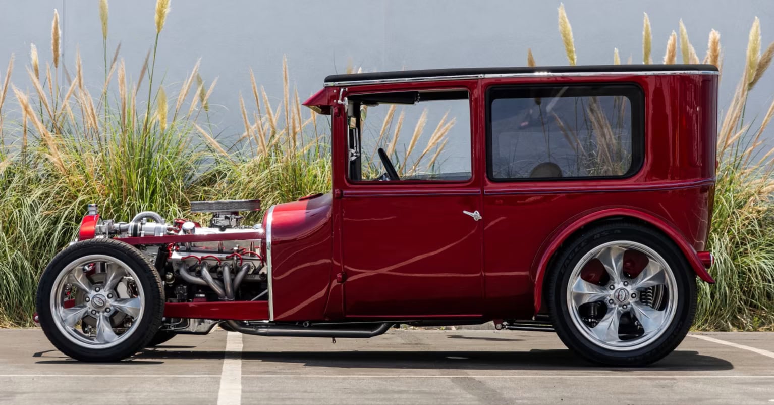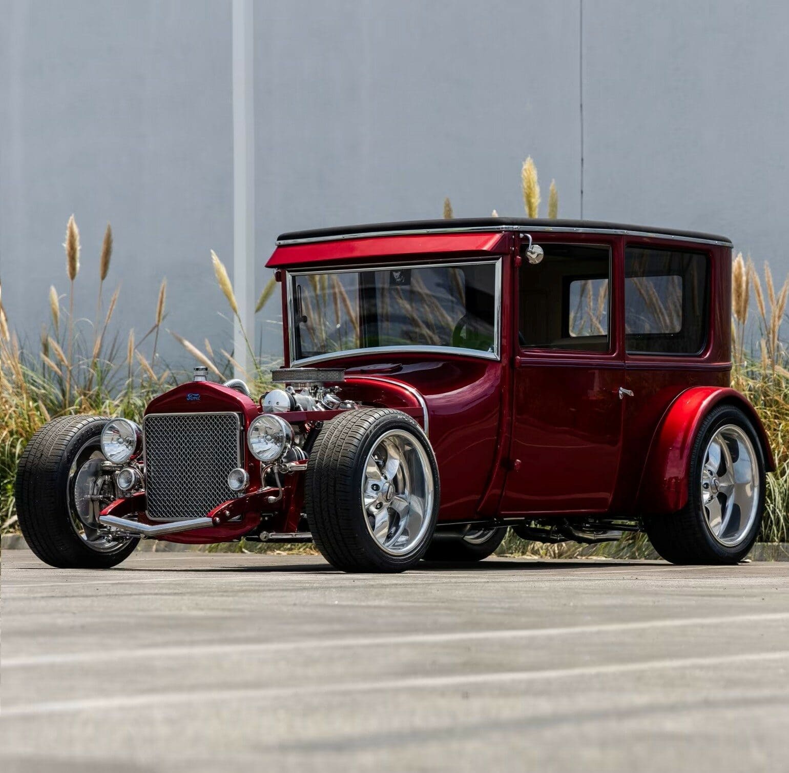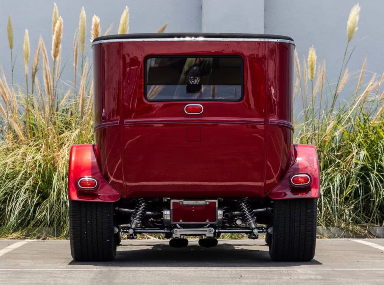 De surcroit, ce Model T a parcouru un long chemin depuis ses débuts utilitaires en berline/sedan autrefois paisible. Il a bénéficié d’une restauration complète qui a transformé ce modèle “Tudor” en un “Street Rod” façon “hautes performances” au style personnalisé, tant à l’intérieur qu’à l’extérieur. La peinture rouge met en valeur la carrosserie haute du Modèle T ainsi que son châssis “maison” le tout réalisé “sur mesure”…