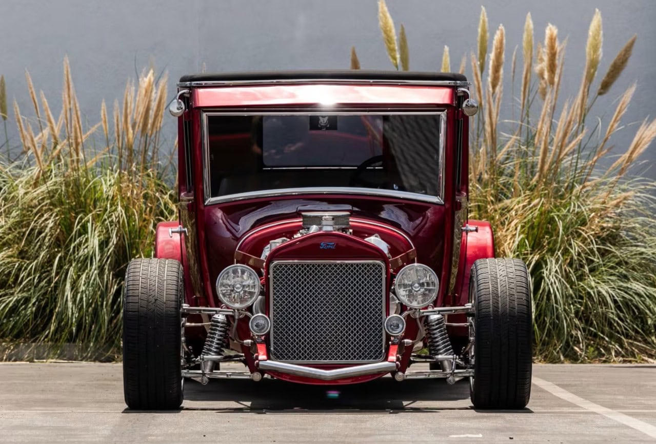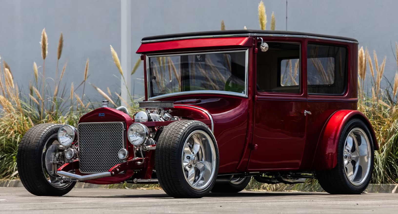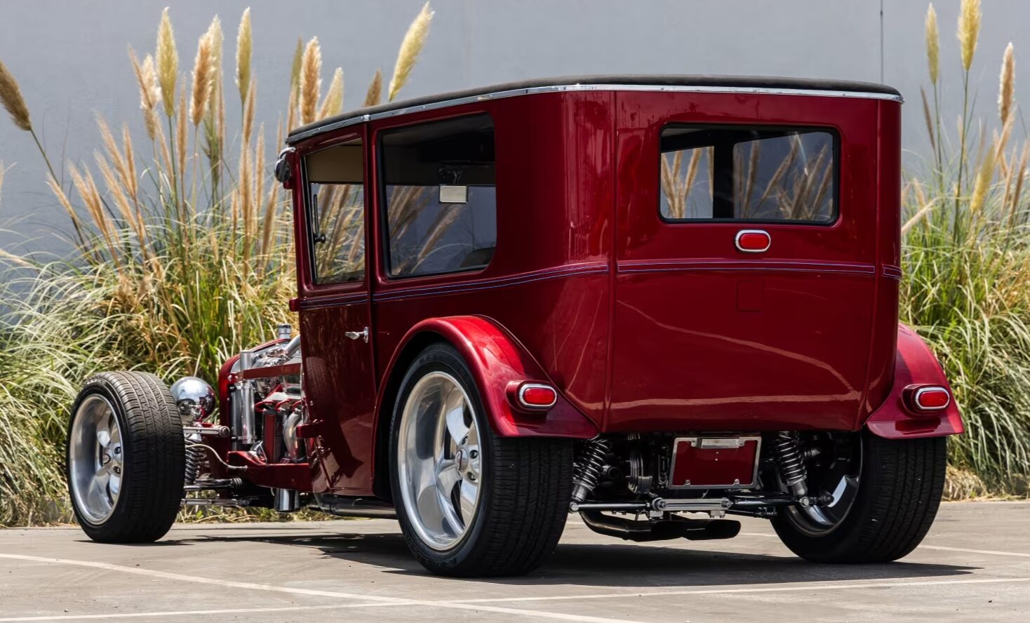 De surcroit, ce Model T a parcouru un long chemin depuis ses débuts utilitaires en berline/sedan autrefois paisible. Il a bénéficié d’une restauration complète qui a transformé ce modèle “Tudor” en un “Street Rod” façon “hautes performances” au style personnalisé, tant à l’intérieur qu’à l’extérieur. La peinture rouge met en valeur la carrosserie haute du Modèle T ainsi que son châssis “maison” le tout réalisé “sur mesure”…