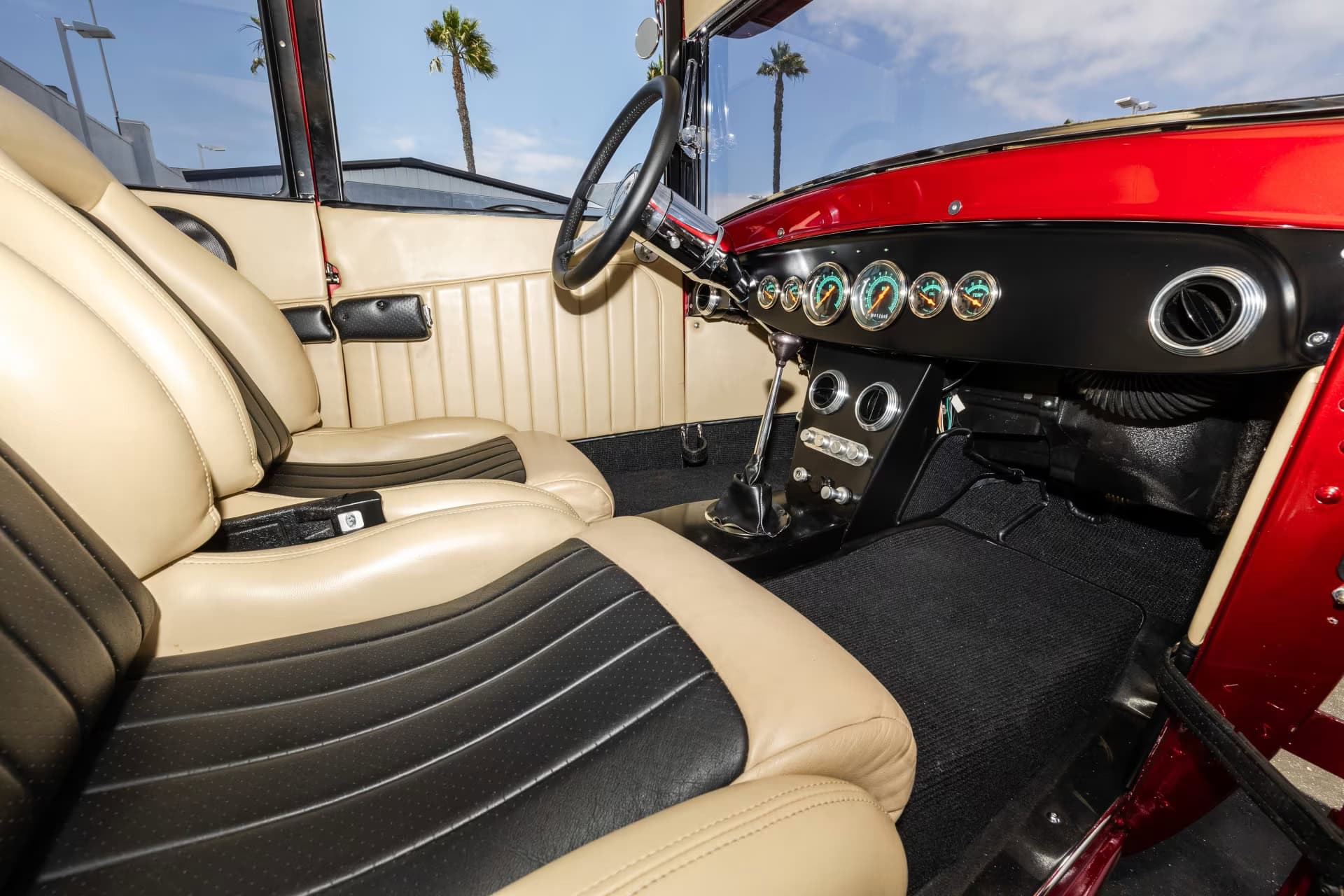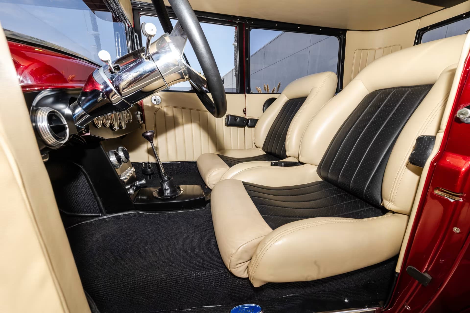 Tandis que la sellerie en cuir bicolore noir et beige, réalisée à la main, offre un confort optimal dans l’habitacle climatisé par une installation d’air conditionné “Vintage Air”. Les instruments “Classic Instruments”, les vitres électriques et la chaîne stéréo JVC apportent de leur coté un confort et un divertissement inédits. Cette Tudor, initialement équipée en 1927 d’un quatre cylindres, en compte désormais deux fois plus grâce à un V8 Ford Racing de 5L0.