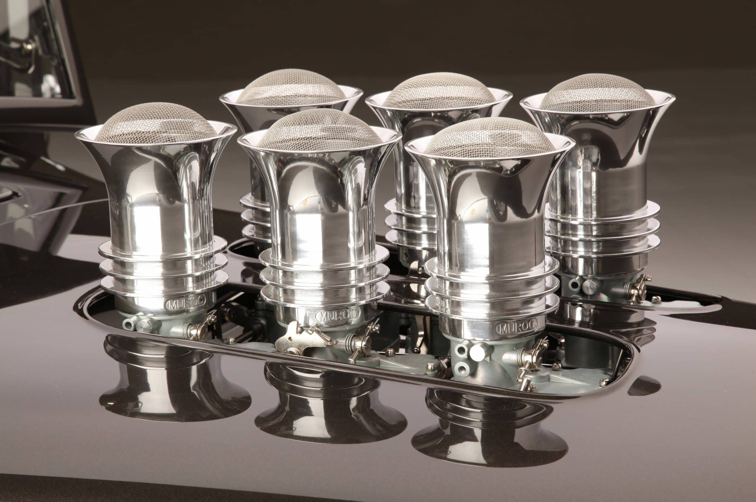 Jason apprécie les moteurs qui ont du caractère, et celui-ci est équipé d’un V8 Firedome DeSoto 1956. Bien qu’il s’agisse d’un véritable Hemi, le Firedome de 5,4 litres (330po) d’origine ne développait que 160 chevaux. Jason a donc confié le moteur à Tony Lombardi de “Ross Racing Engines” à Niles, dans l’Ohio, qui a réalésé le V8 de 0,76 mm (0,030pO) pour une cylindrée finale de 5,9 litres (355ci). Les performances (et la sonorité de l’échappement) sont optimisées par un arbre à cames à rouleaux usiné sur mesure. Un collecteur d’admission EELCO 6×2 est surmonté de six carburateurs Stromberg 97, eux-mêmes coiffés de hauts cornets d’admission Muroc à grille. Les cache-culbuteurs chromés ainsi que le moteur lui-même, arborent une teinte bordeaux profond.