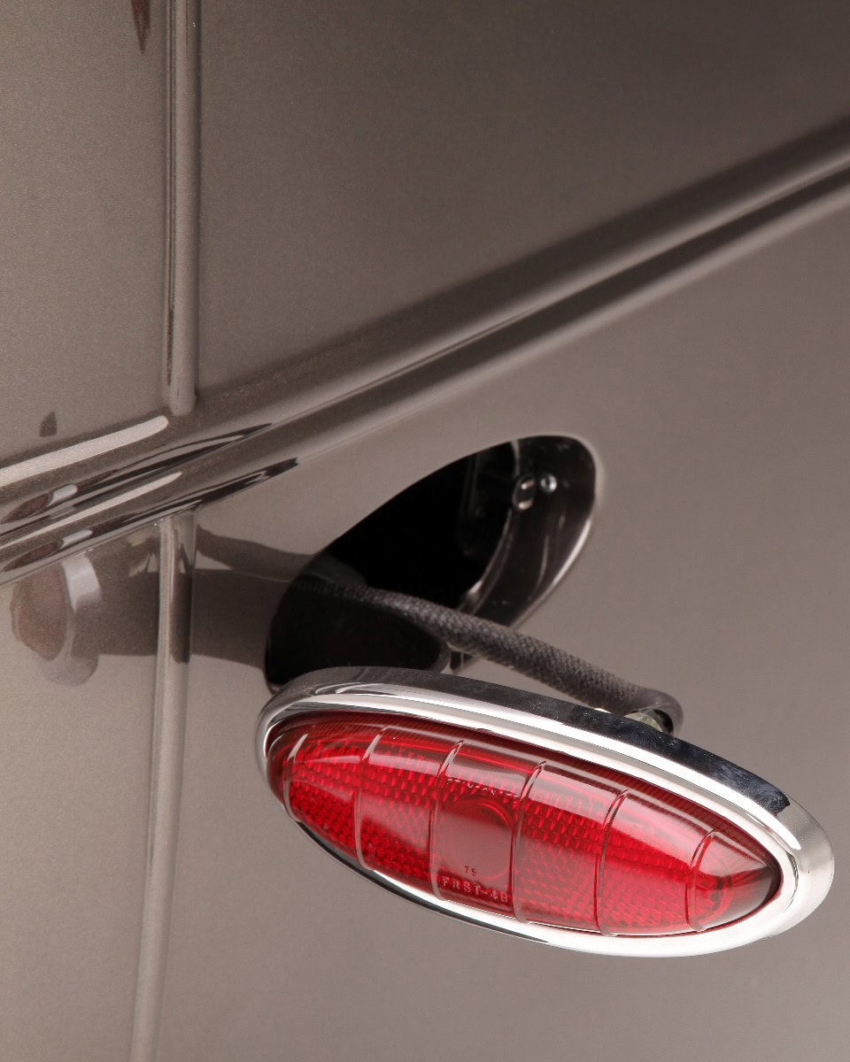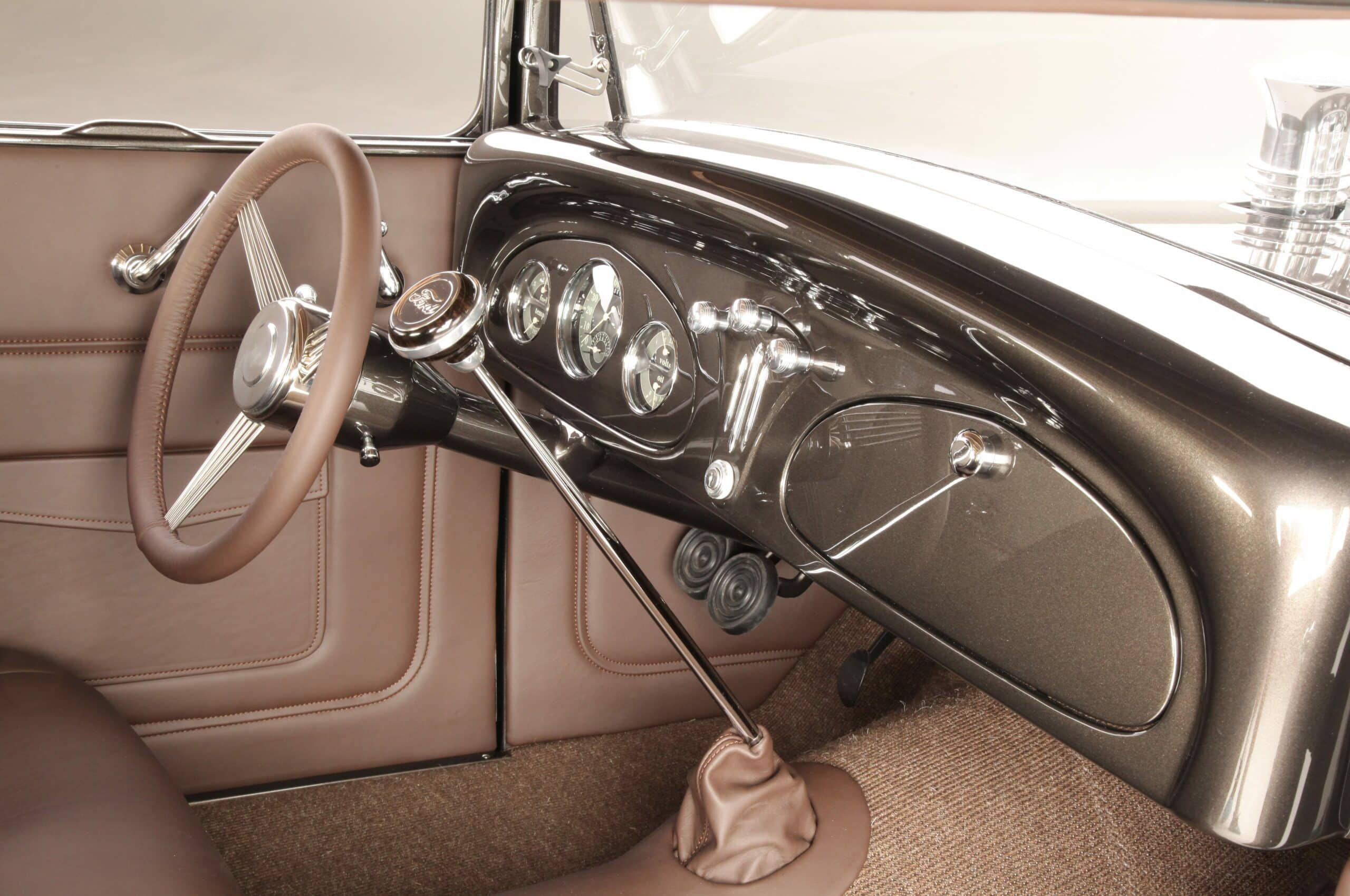 Les collecteurs d’échappement de type “zoomie” ont été fabriqués chez “Jason Graham Hot Rods”. Les câbles d’allumage gainés de tissu confèrent un look vintage et s’accordent parfaitement avec le système d’allumage “MSD” moderne. Parmi les autres améliorations moteur, on trouve un mini alternateur “Powermaster”, un radiateur en aluminium à trois rangées de chez “PRC” et une pompe à eau en aluminium pour petit bloc Chevrolet. Le mini Hemi est accouplé à une boîte de vitesses Tremec à cinq rapports et équipé d’un embrayage Ram de 11 pouces ainsi que d’un levier de vitesses fabriqué sur mesure par Jason à partir d’un levier de Ford Modèle A, surmonté d’un pommeau unique en bois de zèbre.