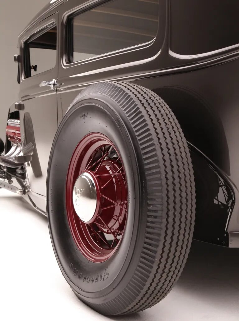 Un régal à contempler… Faites une pause en sirotant une bière puis on repart… De nombreuses pièces de suspension ont été usinées sur mesure en acier inoxydable par Greg Leonard de “Neely Precision” situé à Gallatin/Tennessee… et toutes ont reçu un revêtement en poudre gris coulé de “Powder Pros”, également situé à Gallatin. Une crémaillère “Unisteer” assiste la direction, et la colonne de direction est un modèle spécial pour les Roadster “Ididit”. Chaque roue est équipée de jantes à rayons Ford 1936 d’origine (AV en 16×4), les pneus arrière étant chaussés de Firestone 7.50 à flancs noirs de type “tarte-crust”, tandis que les pneus avant sont des 6.00 à flancs noirs. Derrière les roues avant se trouvent des tambours de frein de type hydraulique Lincoln…