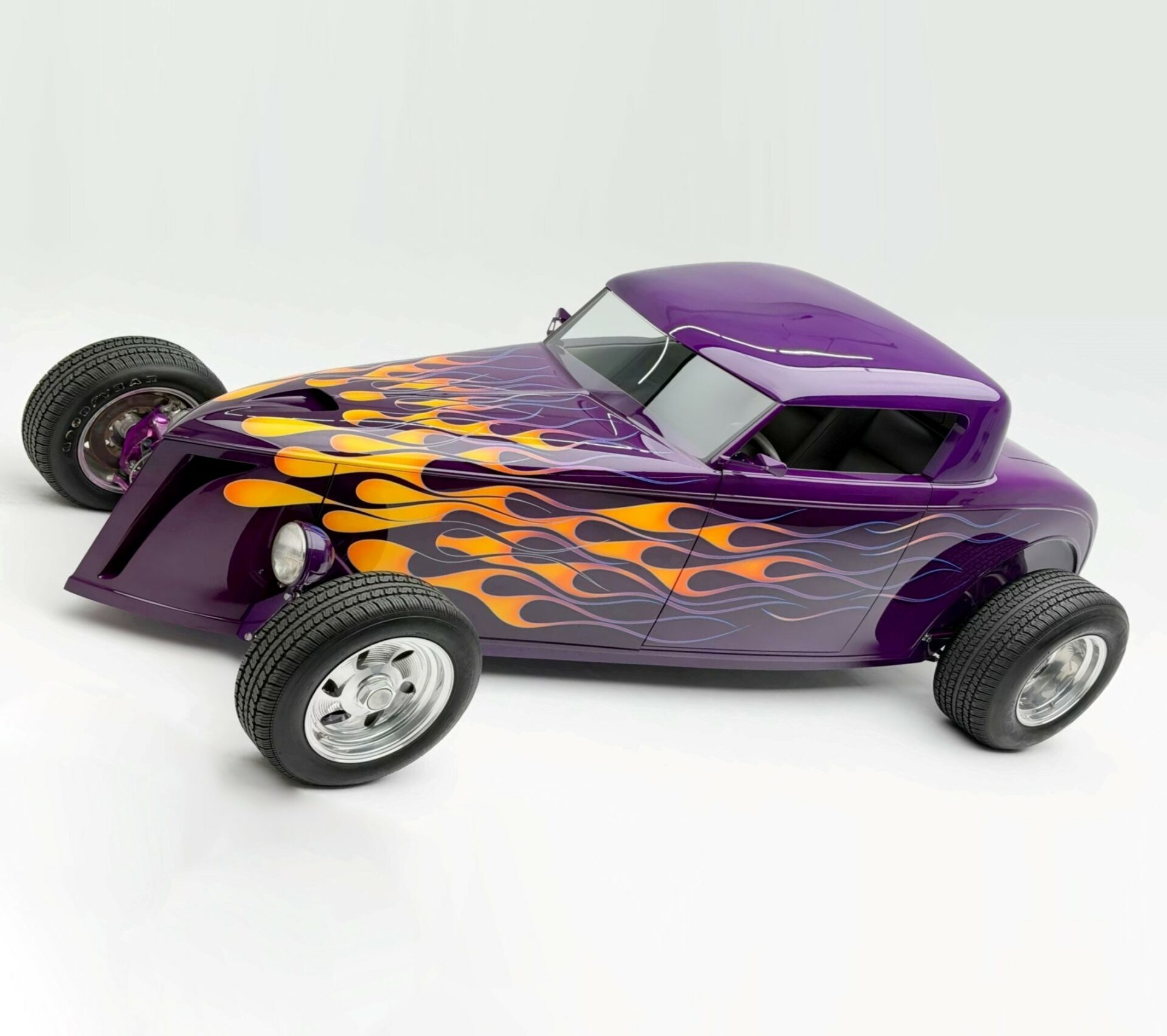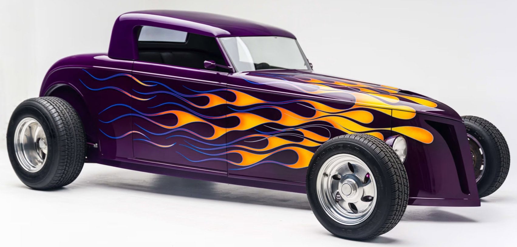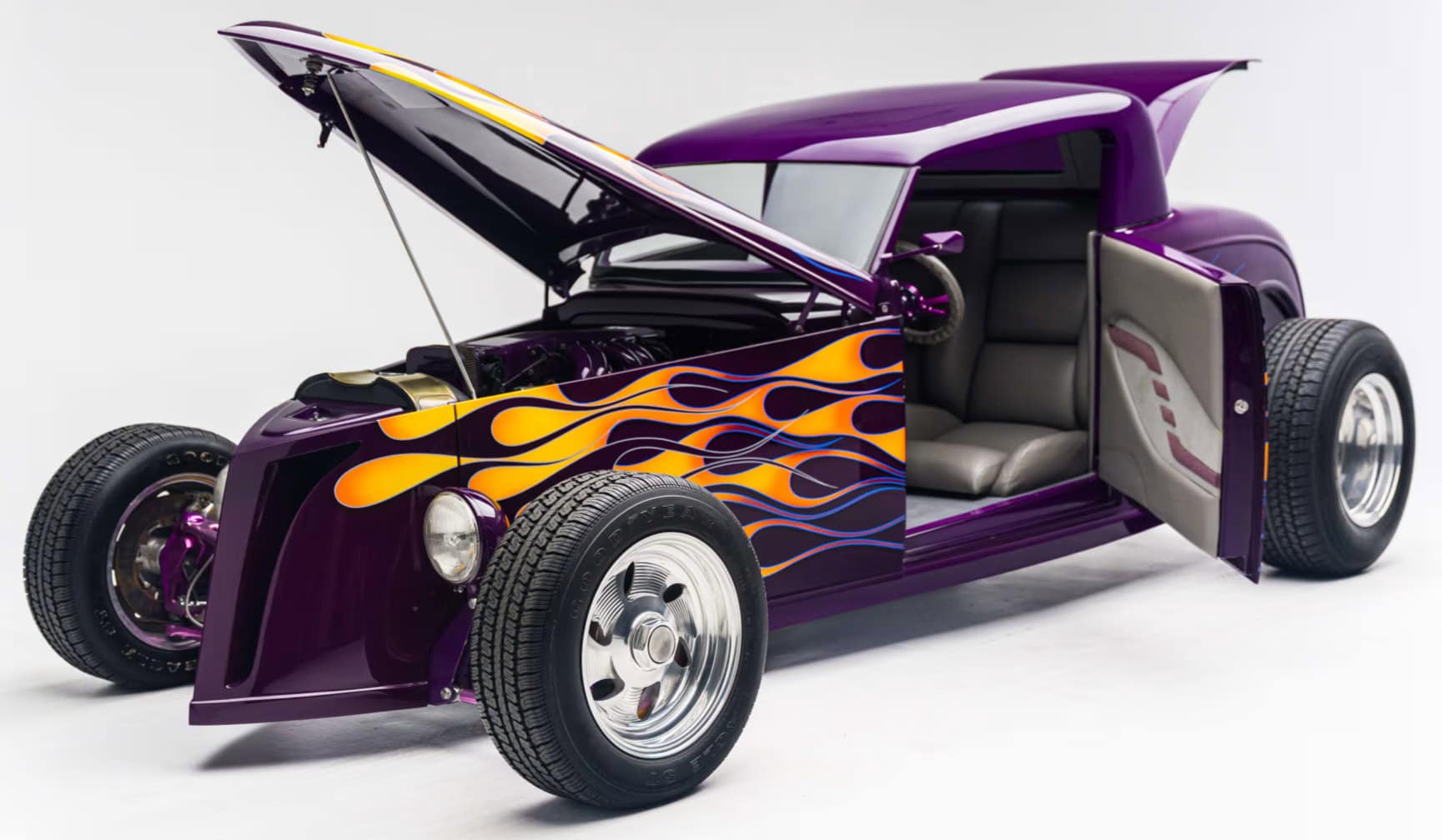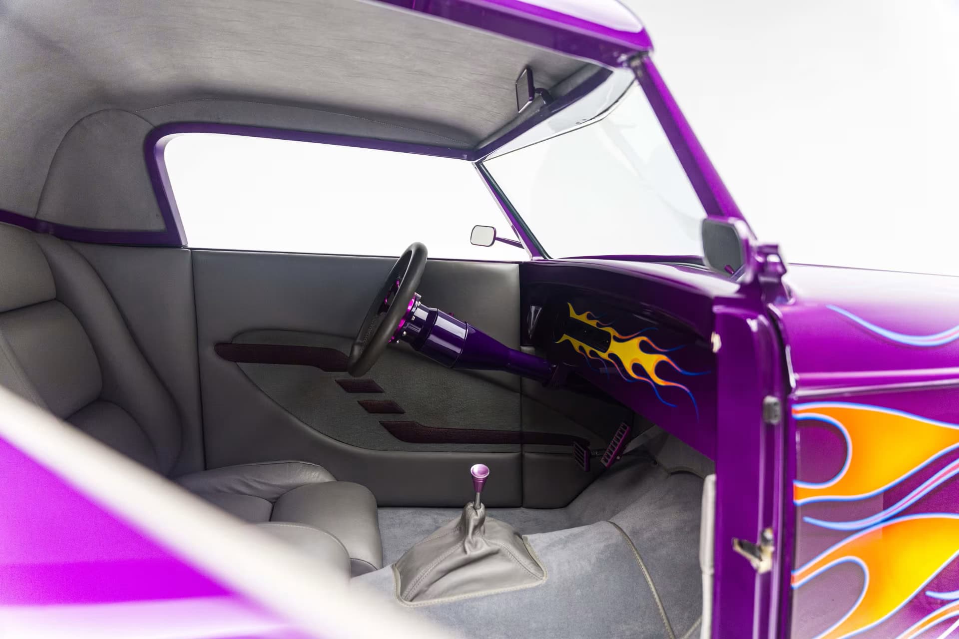 “Odometer reads 5,690 miles”… “One-off all-aluminum body built to resemble a 1932 Ford”… “Designed by Thom Taylor”… “Fabricated by Boyd Coddington and Craig Naff in 1989″… “Built for collector Butch Martino”… “5.7L LT1 V-8 engine”… “Automatic transmission”… “Originally finished in DuPont Plum”… Et ça continue : “Later refinished in its current Orange and Yellow flame livery”… “Grand National Roadster Show 75th Anniversary plaque and trophy included”… Arghhhhhh !C’est trop ! L’Amérique… De quoi est-elle le nom ? Elle reste plus que jamais ce que l’on pourrait appeler, pour paraphraser Michel Houellebecq, “La possibilité d’une île”…