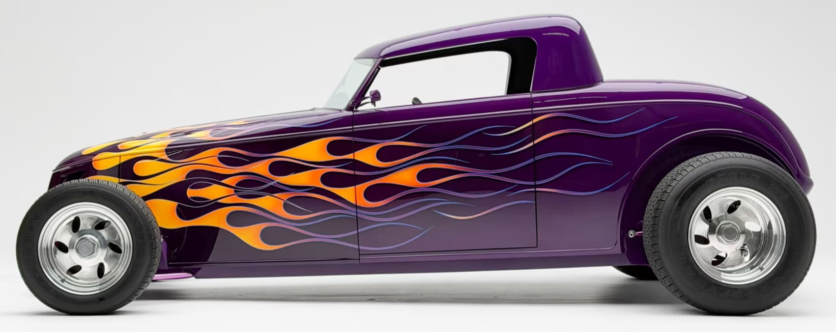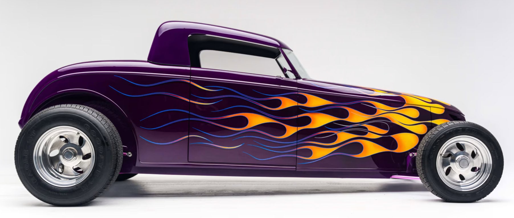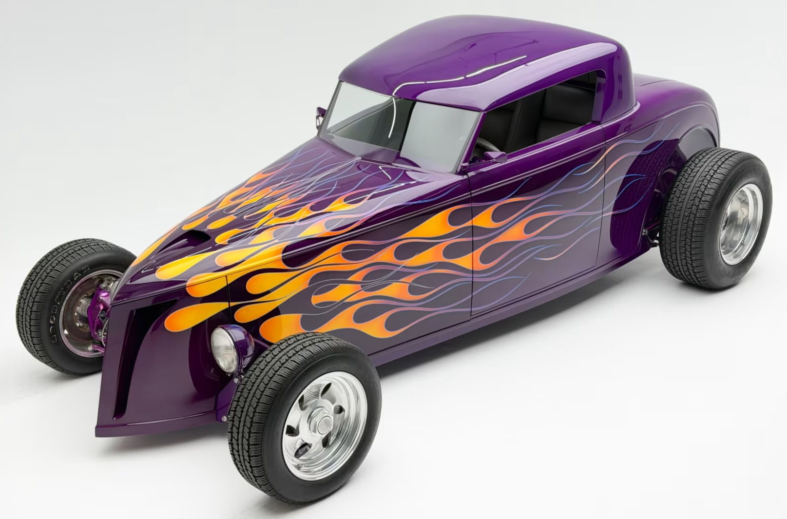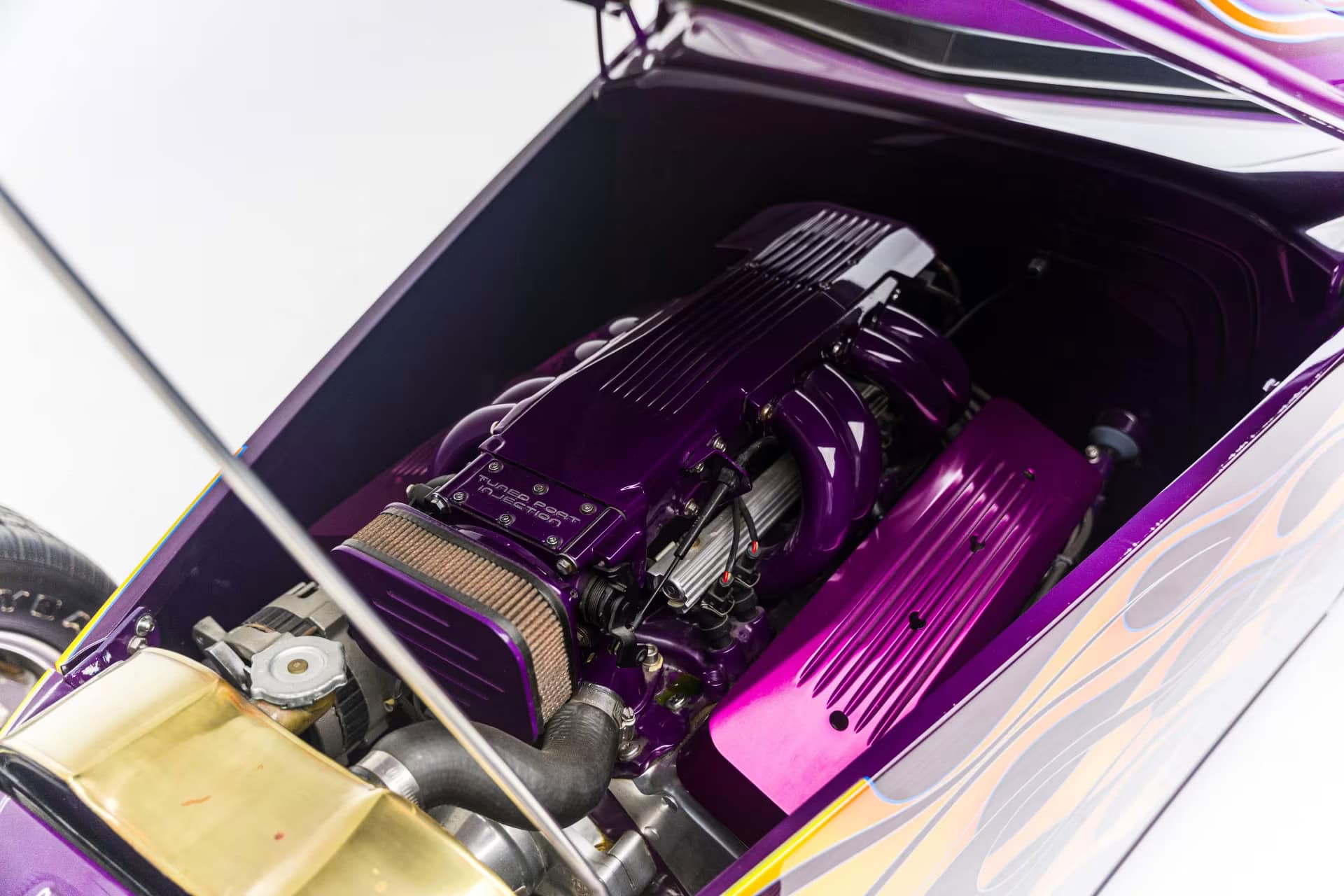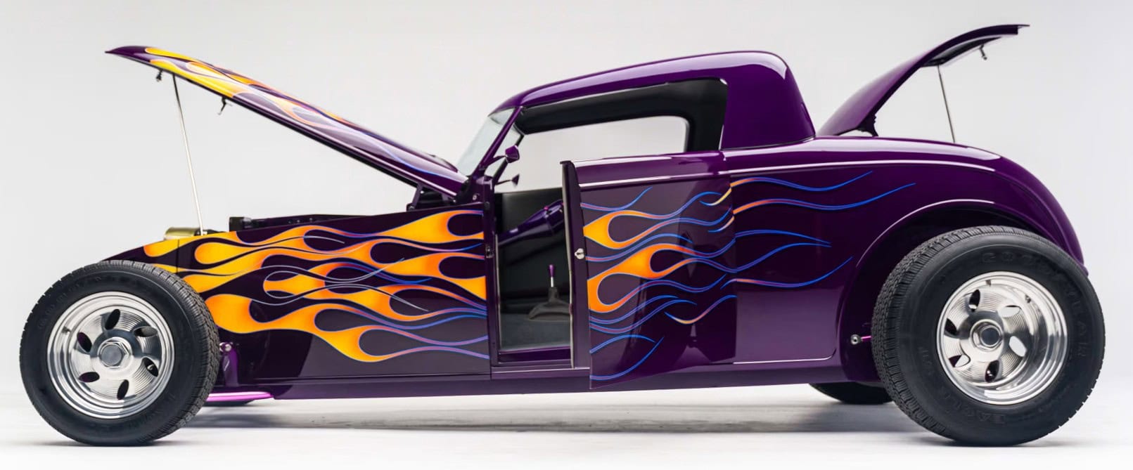 “Odometer reads 5,690 miles”… “One-off all-aluminum body built to resemble a 1932 Ford”… “Designed by Thom Taylor”… “Fabricated by Boyd Coddington and Craig Naff in 1989″… “Built for collector Butch Martino”… “5.7L LT1 V-8 engine”… “Automatic transmission”… “Originally finished in DuPont Plum”… Et ça continue : “Later refinished in its current Orange and Yellow flame livery”… “Grand National Roadster Show 75th Anniversary plaque and trophy included”… Arghhhhhh !C’est trop ! L’Amérique… De quoi est-elle le nom ? Elle reste plus que jamais ce que l’on pourrait appeler, pour paraphraser Michel Houellebecq, “La possibilité d’une île”…