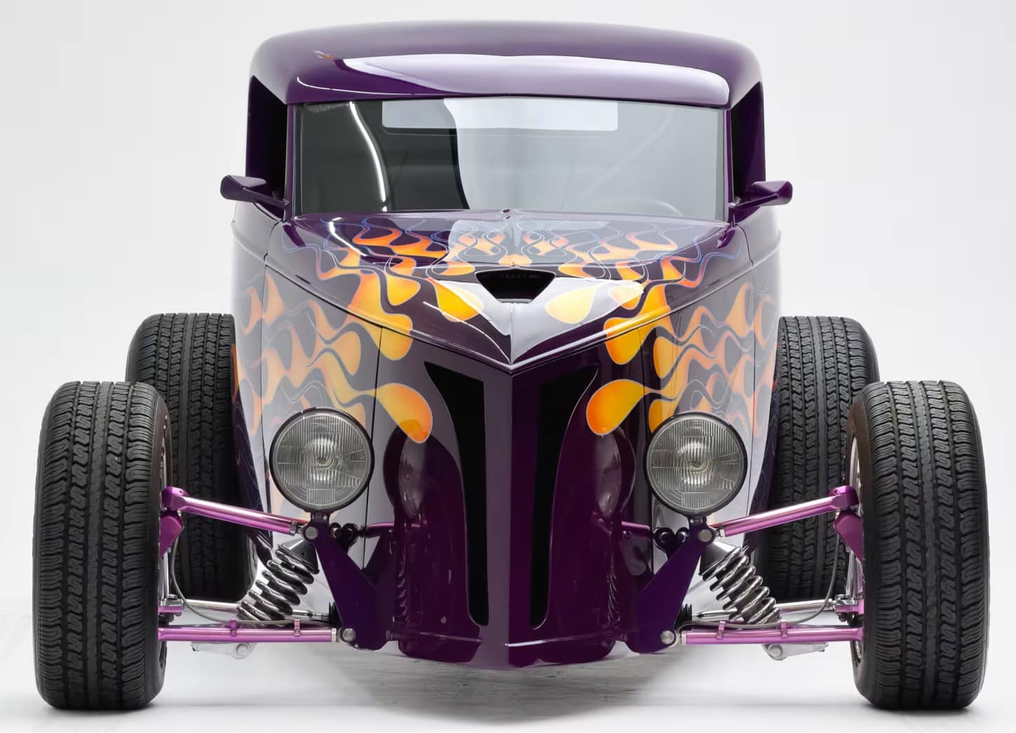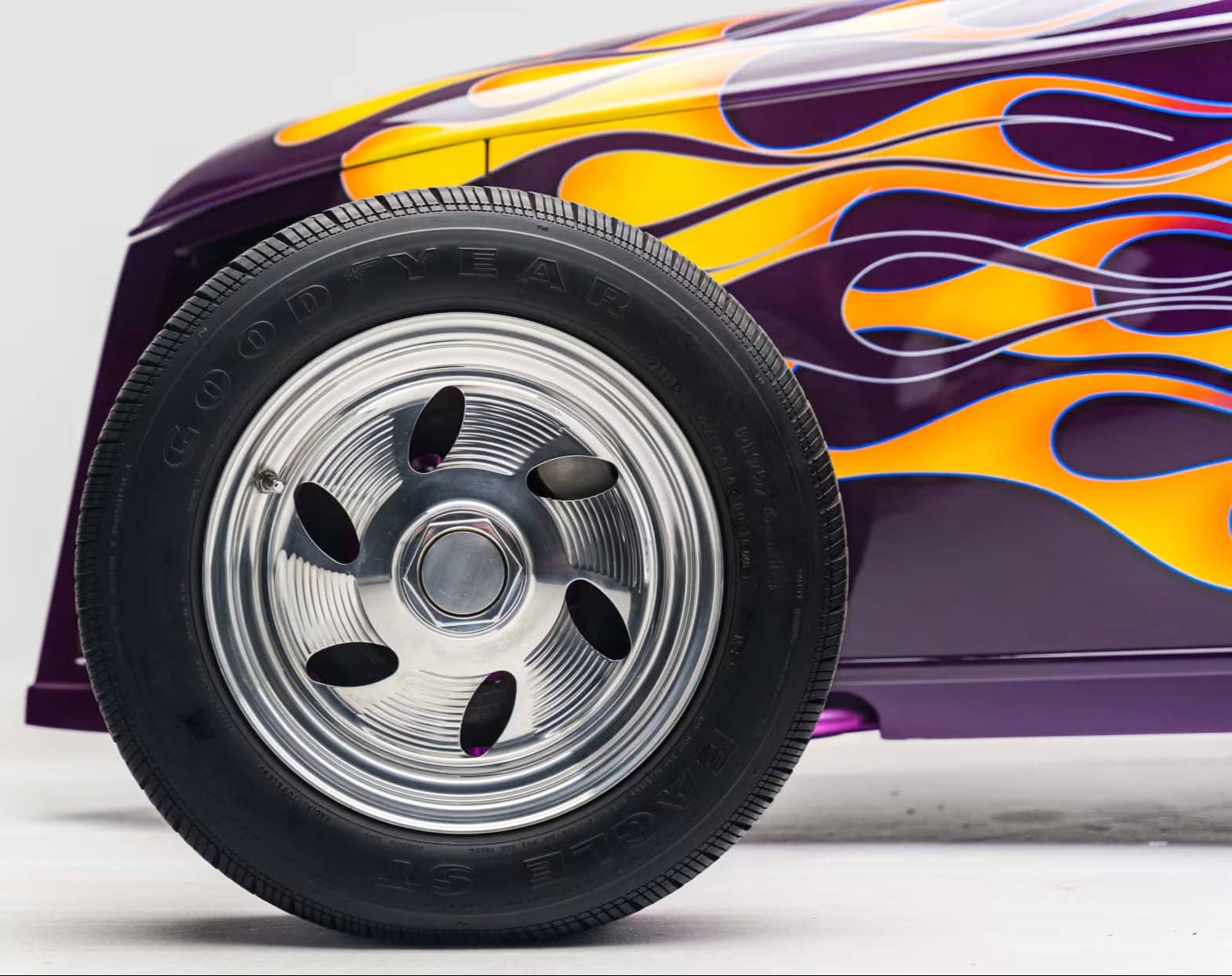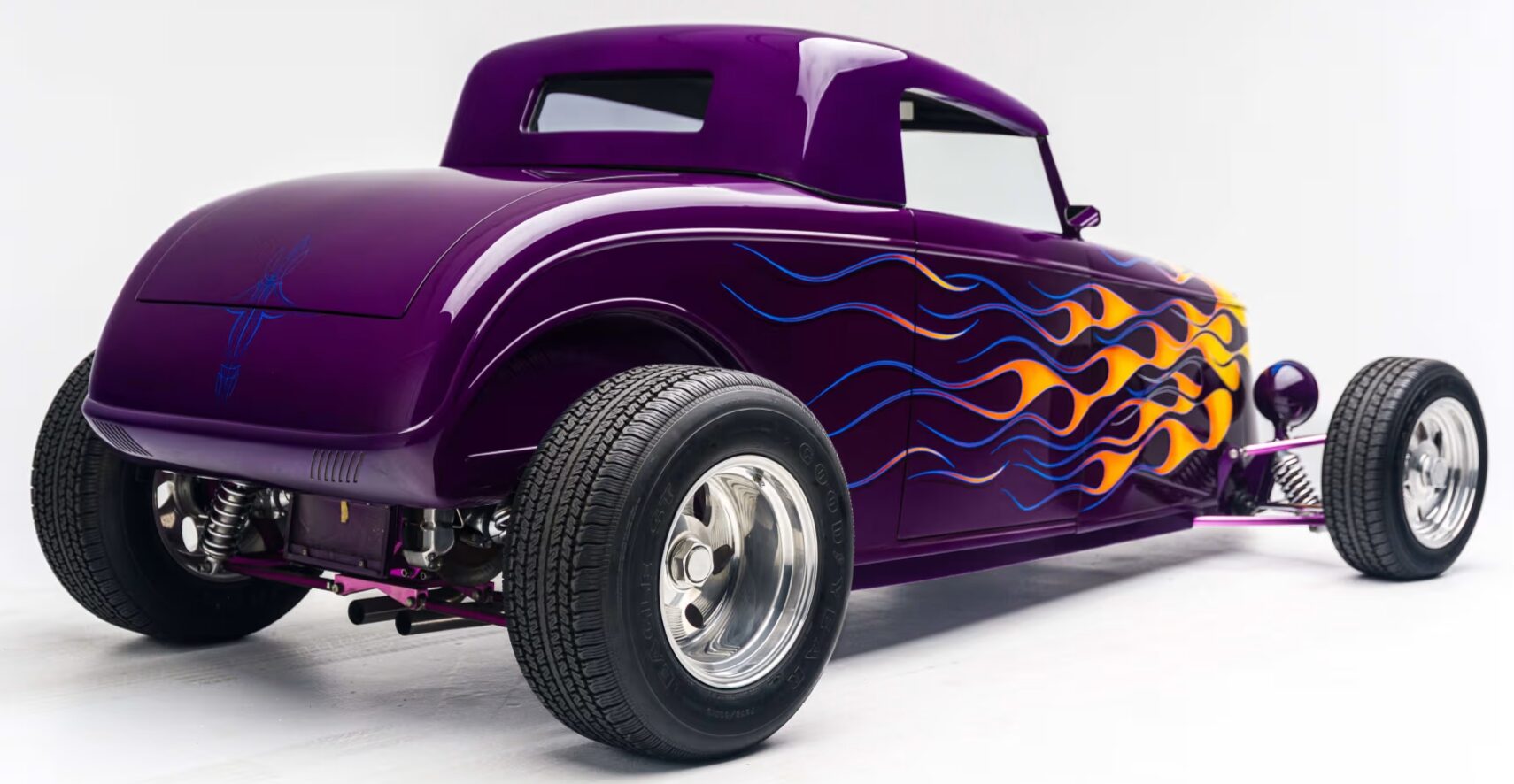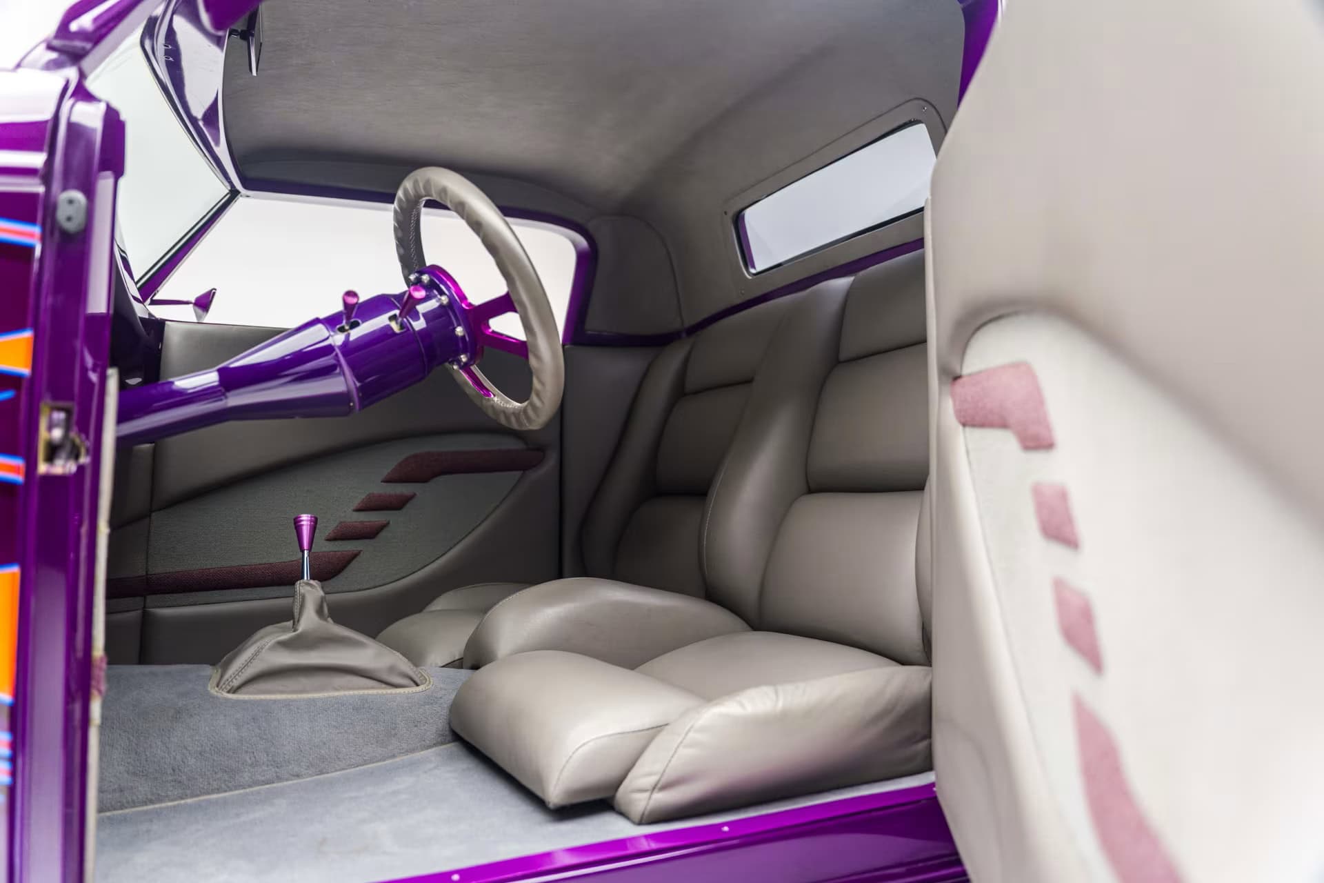 “Odometer reads 5,690 miles”… “One-off all-aluminum body built to resemble a 1932 Ford”… “Designed by Thom Taylor”… “Fabricated by Boyd Coddington and Craig Naff in 1989″… “Built for collector Butch Martino”… “5.7L LT1 V-8 engine”… “Automatic transmission”… “Originally finished in DuPont Plum”… Et ça continue : “Later refinished in its current Orange and Yellow flame livery”… “Grand National Roadster Show 75th Anniversary plaque and trophy included”… Arghhhhhh !C’est trop ! L’Amérique… De quoi est-elle le nom ? Elle reste plus que jamais ce que l’on pourrait appeler, pour paraphraser Michel Houellebecq, “La possibilité d’une île”…