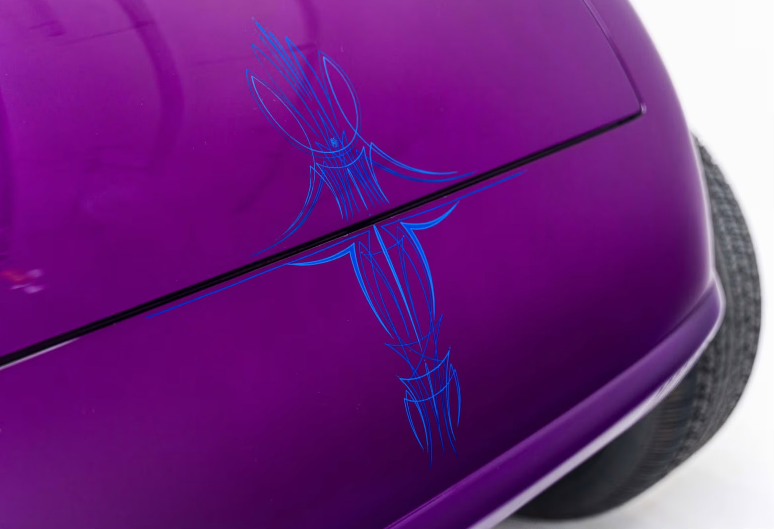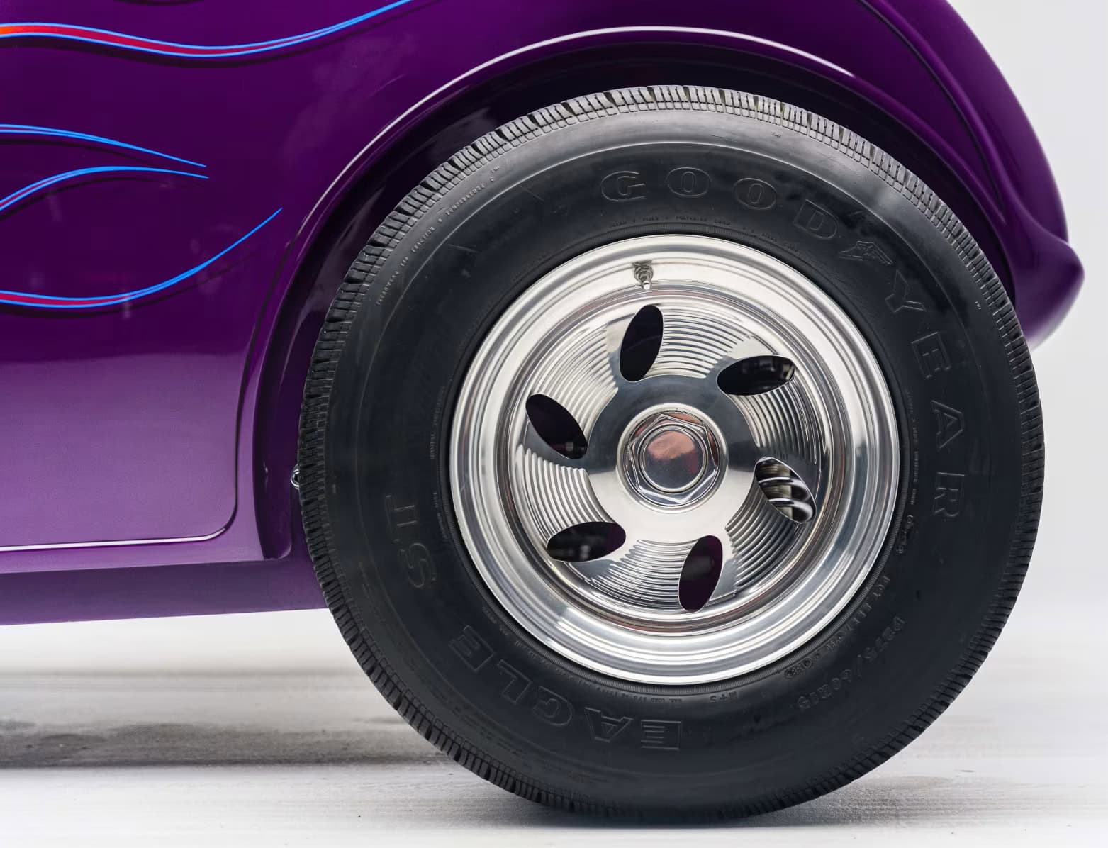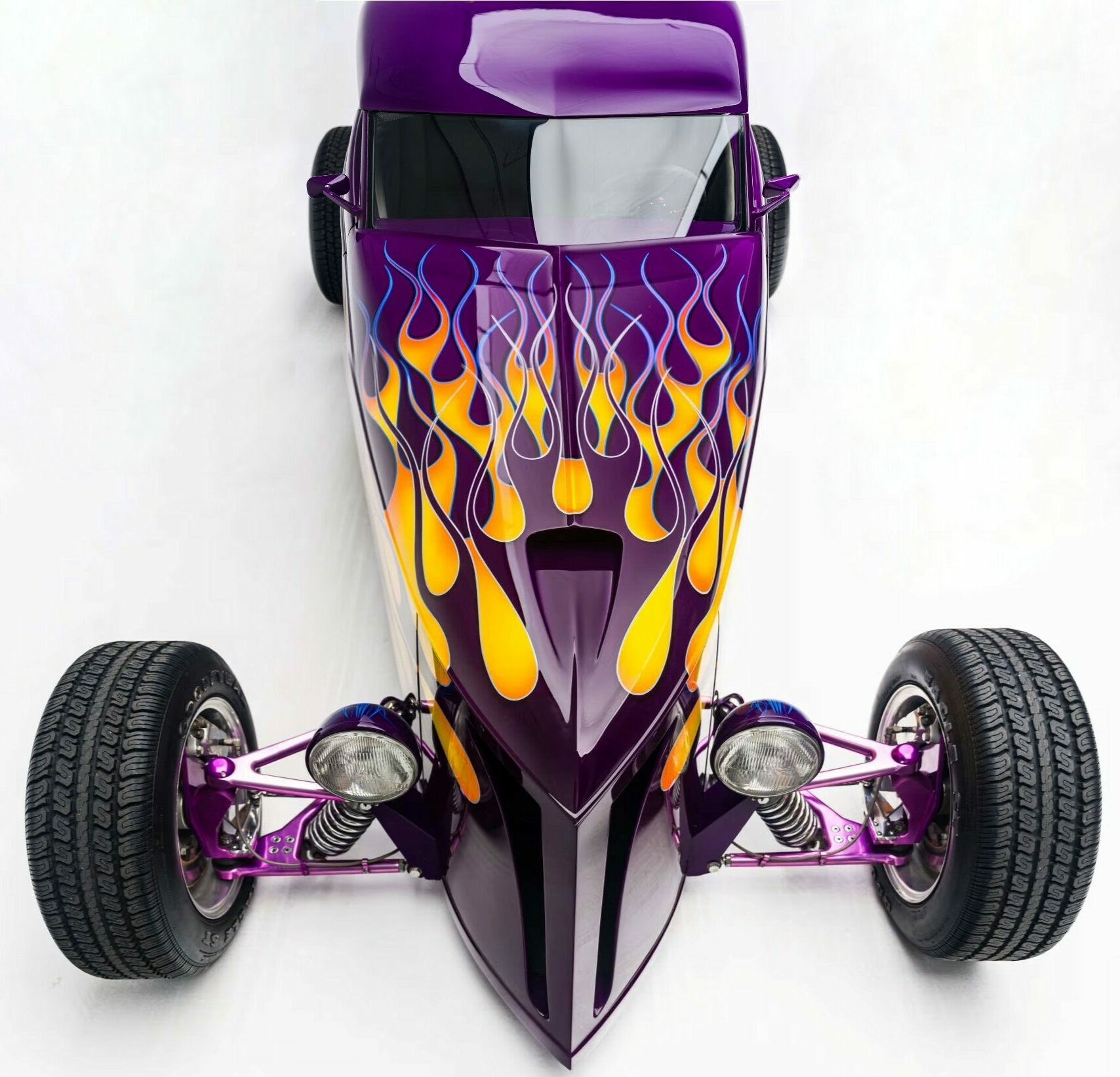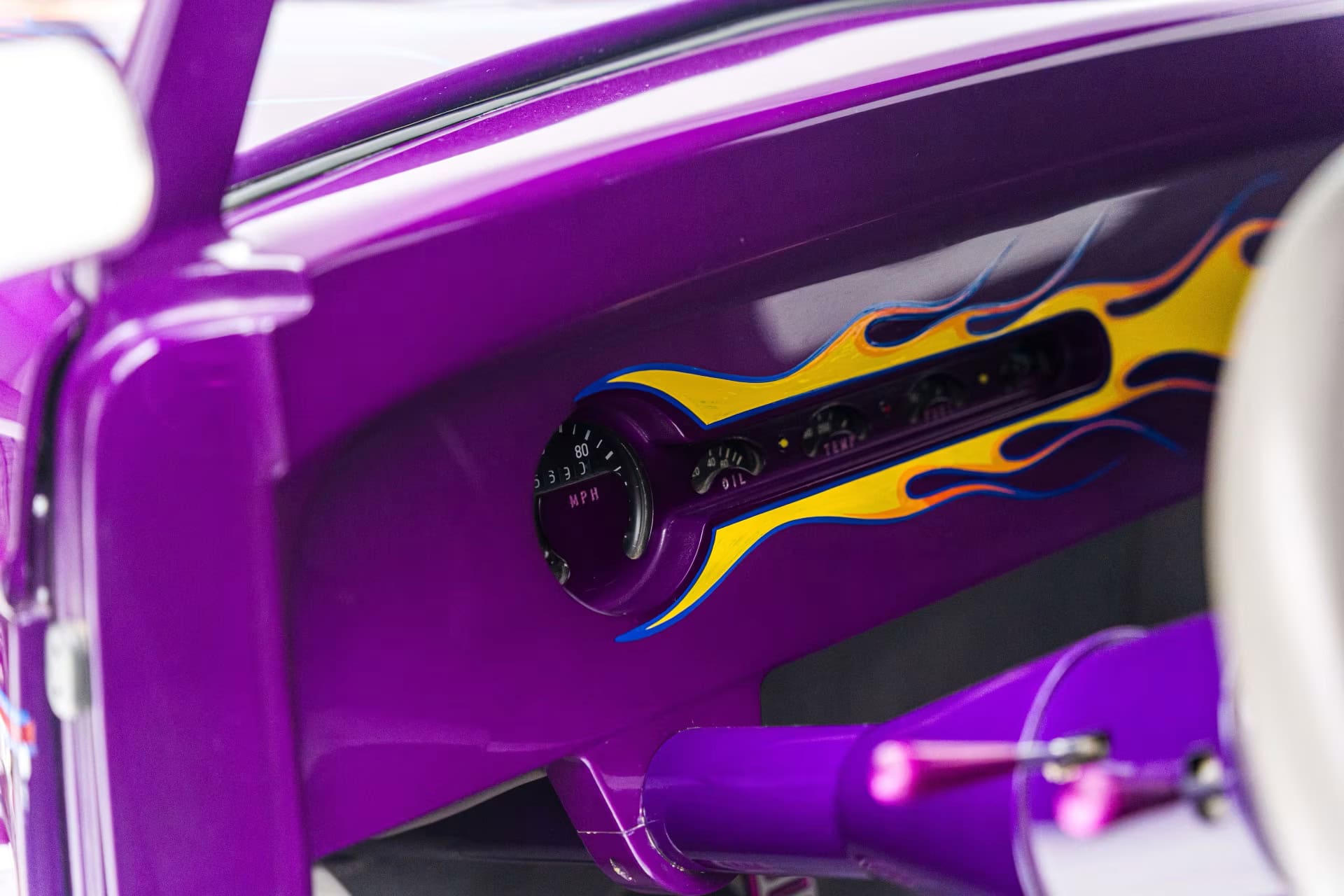 “Odometer reads 5,690 miles”… “One-off all-aluminum body built to resemble a 1932 Ford”… “Designed by Thom Taylor”… “Fabricated by Boyd Coddington and Craig Naff in 1989″… “Built for collector Butch Martino”… “5.7L LT1 V-8 engine”… “Automatic transmission”… “Originally finished in DuPont Plum”… Et ça continue : “Later refinished in its current Orange and Yellow flame livery”… “Grand National Roadster Show 75th Anniversary plaque and trophy included”… Arghhhhhh !C’est trop ! L’Amérique… De quoi est-elle le nom ? Elle reste plus que jamais ce que l’on pourrait appeler, pour paraphraser Michel Houellebecq, “La possibilité d’une île”…