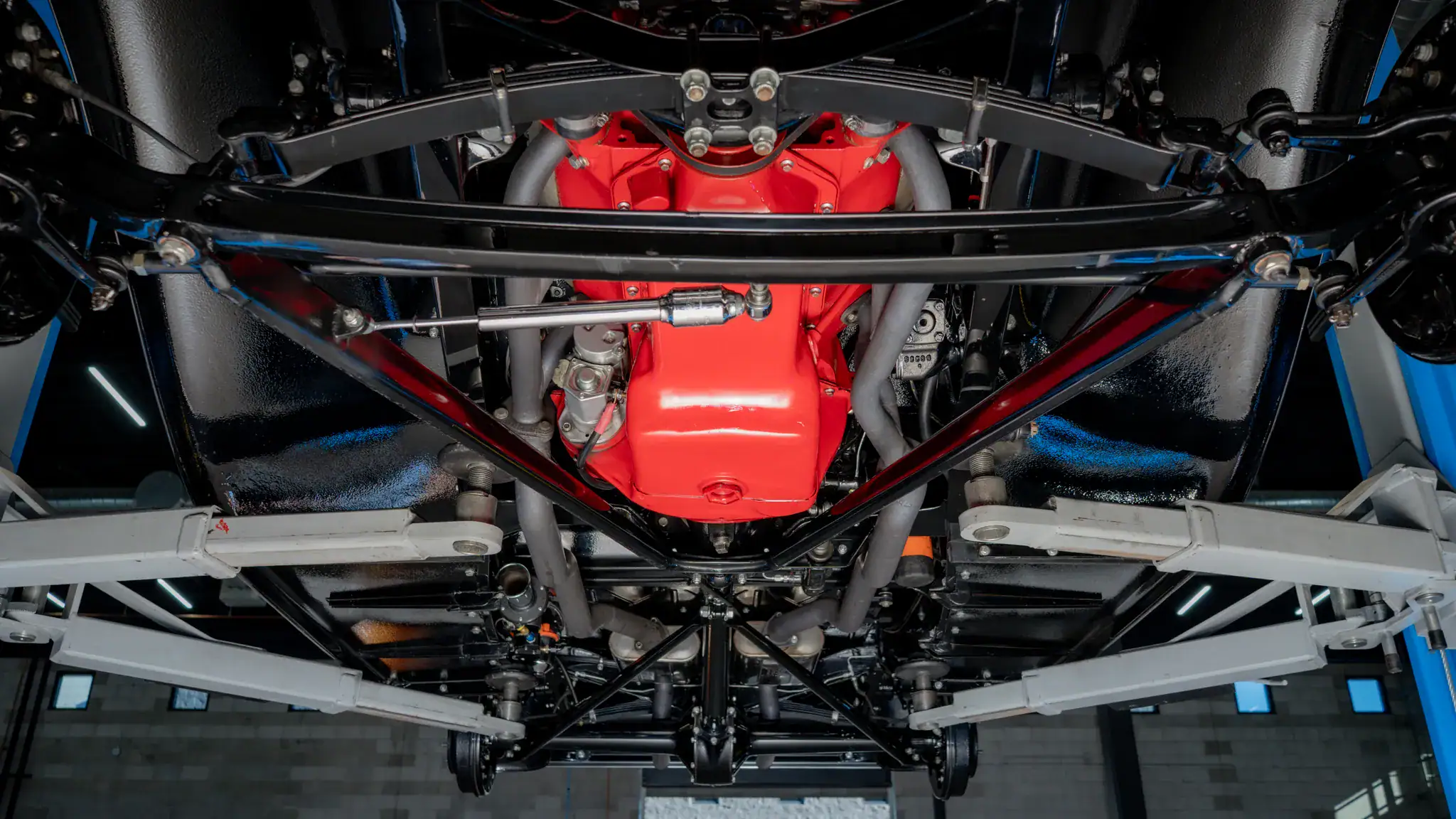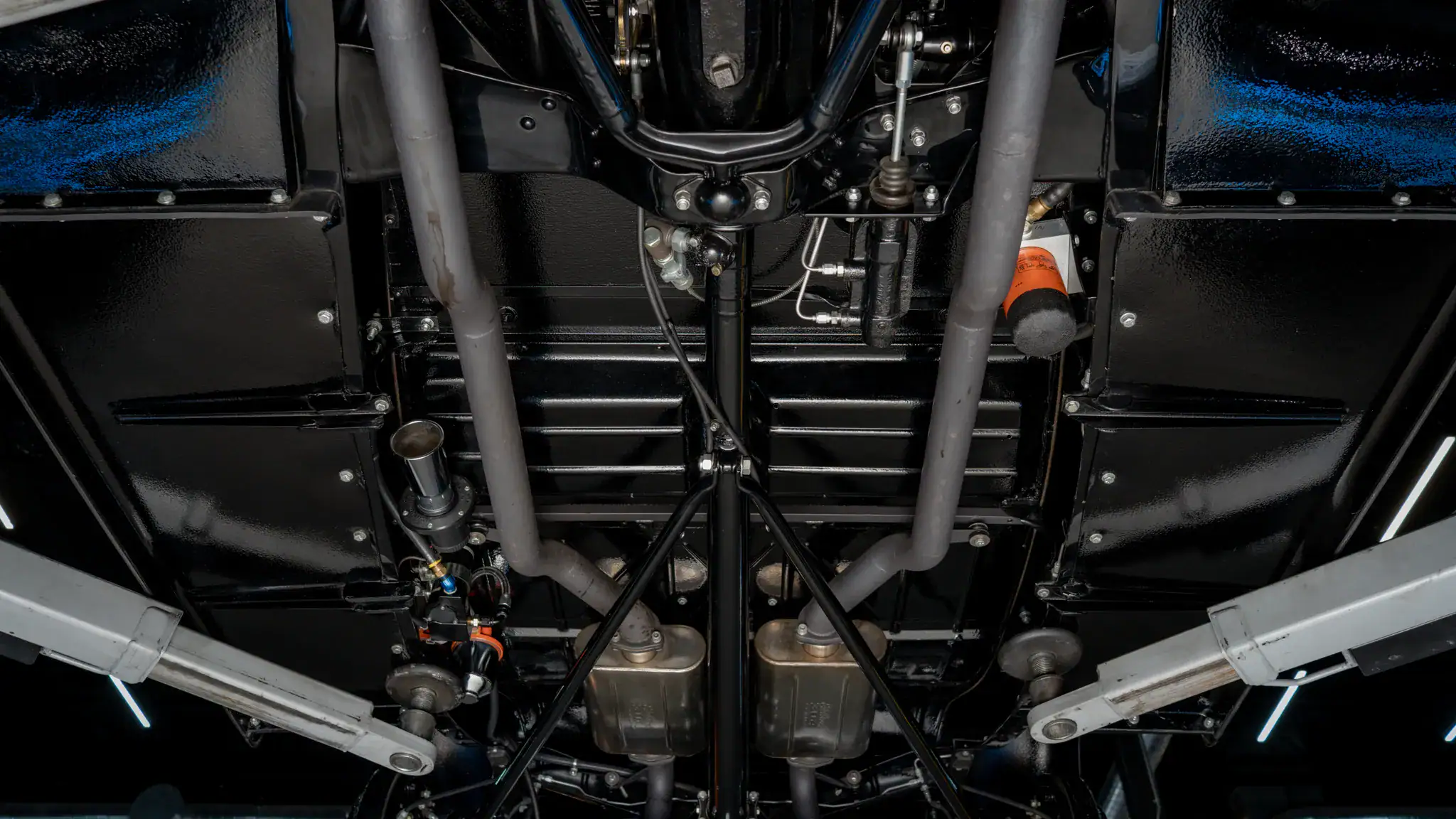 Trois carburateurs Stromberg de type 97 sont montés sur le collecteur d’admission Edelbrock, et des culasses Edelbrock ont également été installées. Le radiateur est refroidi par un ventilateur fourni par Tardell, et les collecteurs d’échappement Red’s sont reliés à un système d’échappement double avec silencieux Edelbrock. Un démarreur à couple élevé et un alternateur Powermaster ont également été installés. La boîte de vitesses manuelle à trois rapports de 1939 est équipée d’engrenages Zephyr, et le pont arrière a été modifié avec des pignons Ford à 11 dents et un rapport de 3,55.