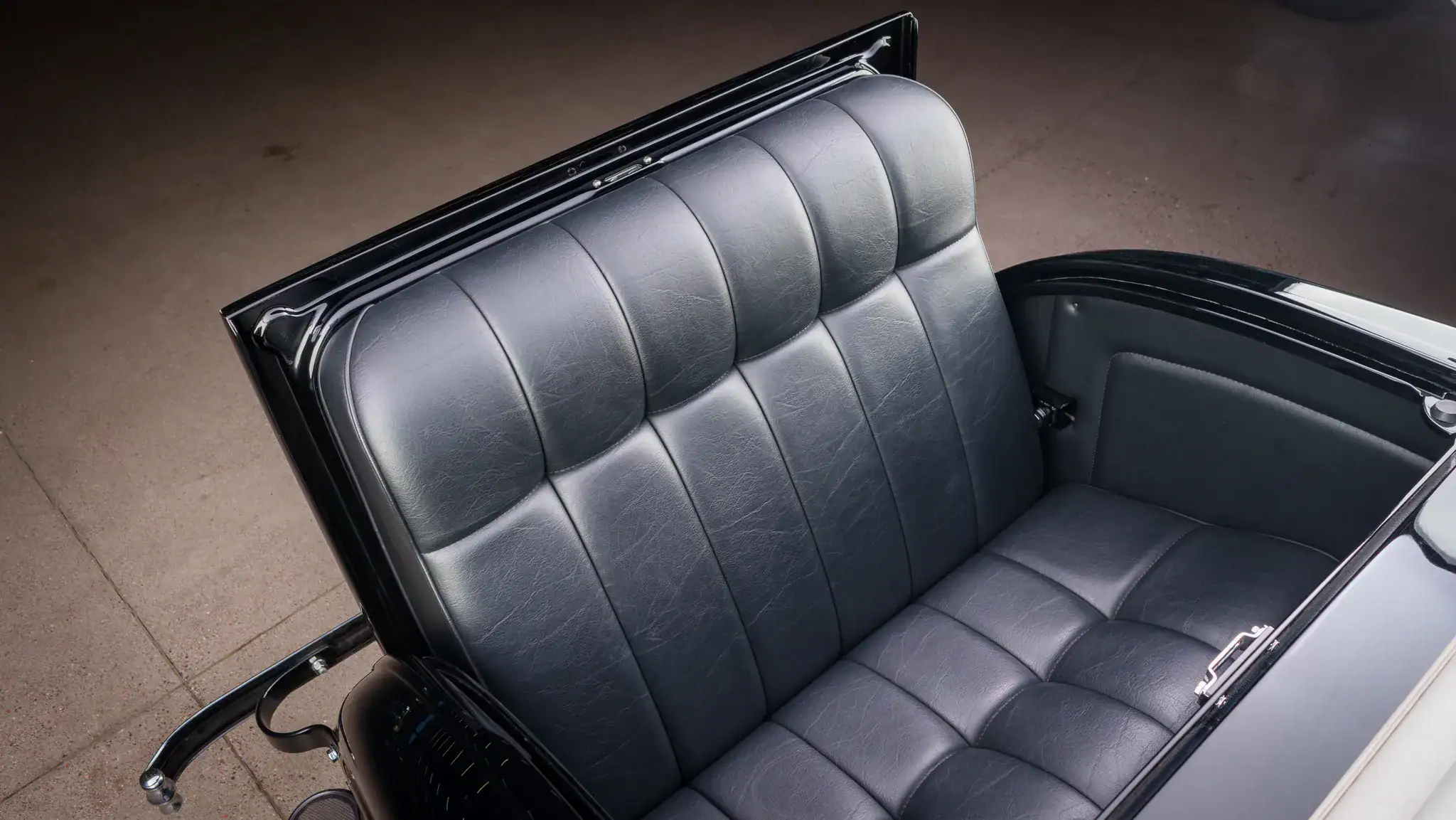 Démonté avant que “Kimmins Custom Fabrication” adapte une carrosserie “réplique”, un job d’escrocs que je n’ai pas envie de narrer tant c’est chiant “à mort”... Sachez simplement au minimum que Mike McGee s’est en finale chargé de la peinture, et que seules les ailes boulonnées et donc amovibles, sont identiques (mais fausses car répliques) à celles de la voiture d’Edelbrock Sénior lors de son record… Un pare-brise abaissé de 5 cm, des phares de 1934 et des feux arrière de 1939 ont alors été installés suivis par les feux de capot ainsi que d’une prise d’air. La capote souple couleur crème est une Carson 100% neuve.