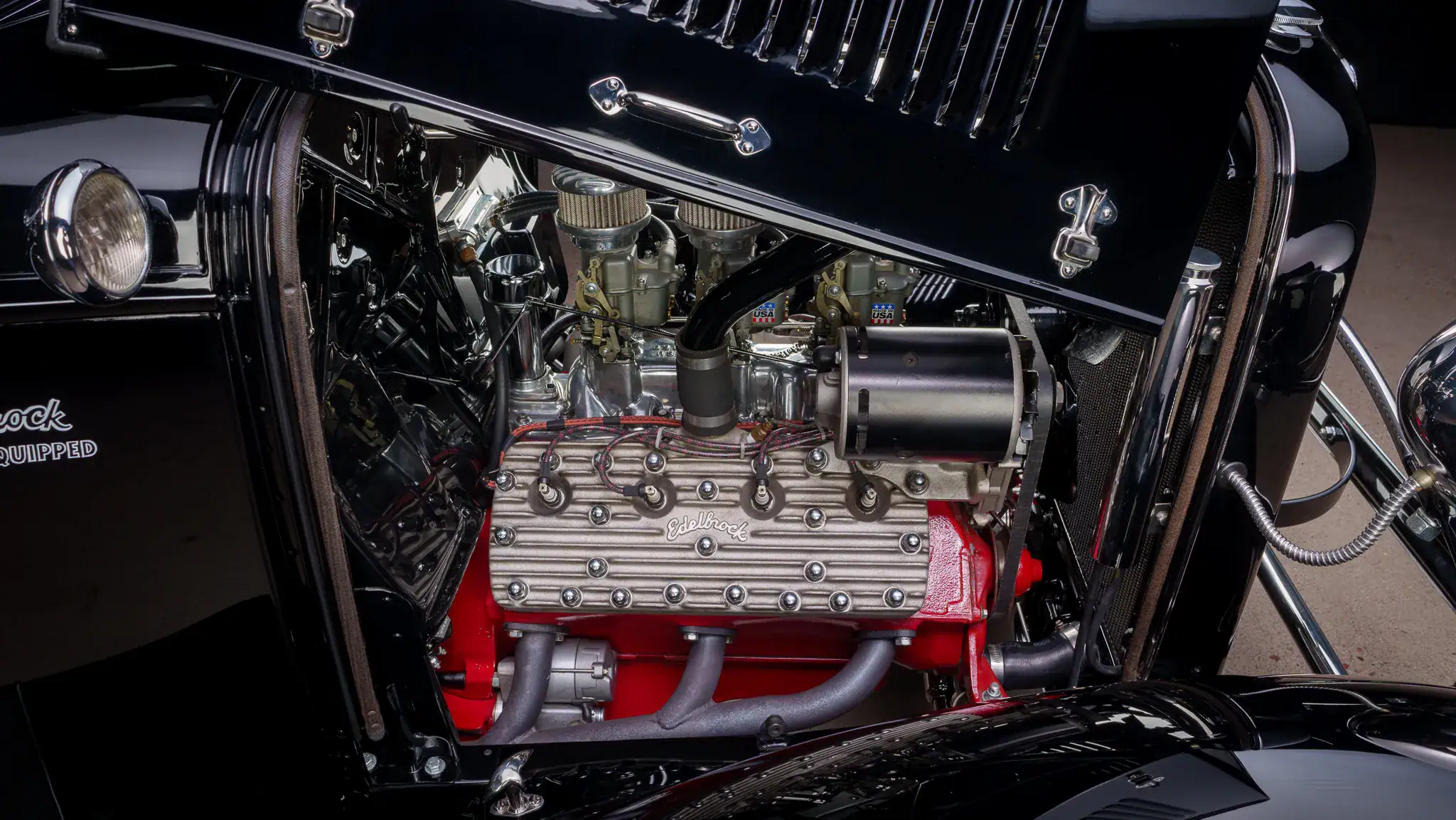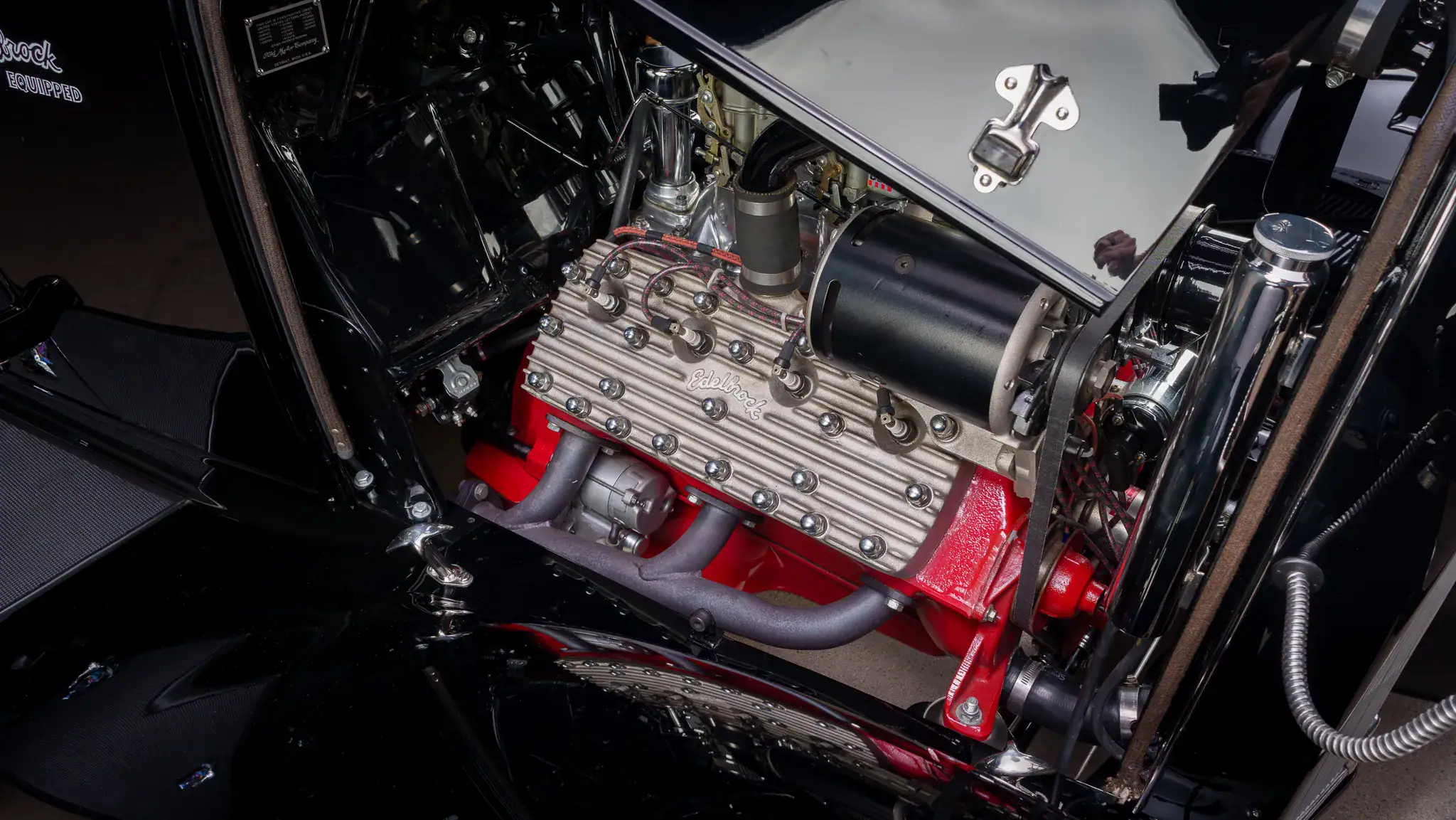 Un ensemble de quatre cadrans escamotables est monté sous le côté droit du tableau de bord, qui comporte une plaque commémorant la course de 1941 à 121,45 mph d’Edelbrock Senior que ce Hot Rod Réplica n’a jamais couru… Comme déjà écrit ci-avant, la pauvreté de ce qu’il y a à radoter oblige à quelques répépétitions… Ce V8 à soupapes latérales provenait donc de Vern Tardell et a été reconstruit pour atteindre une cylindrée de 292ci (4,8 L) grâce à un vilebrequin monobloc Moldex en aluminium forgé, par Bobby Meeks, Dave Tatum et Robert Jung d’Edelbrock.