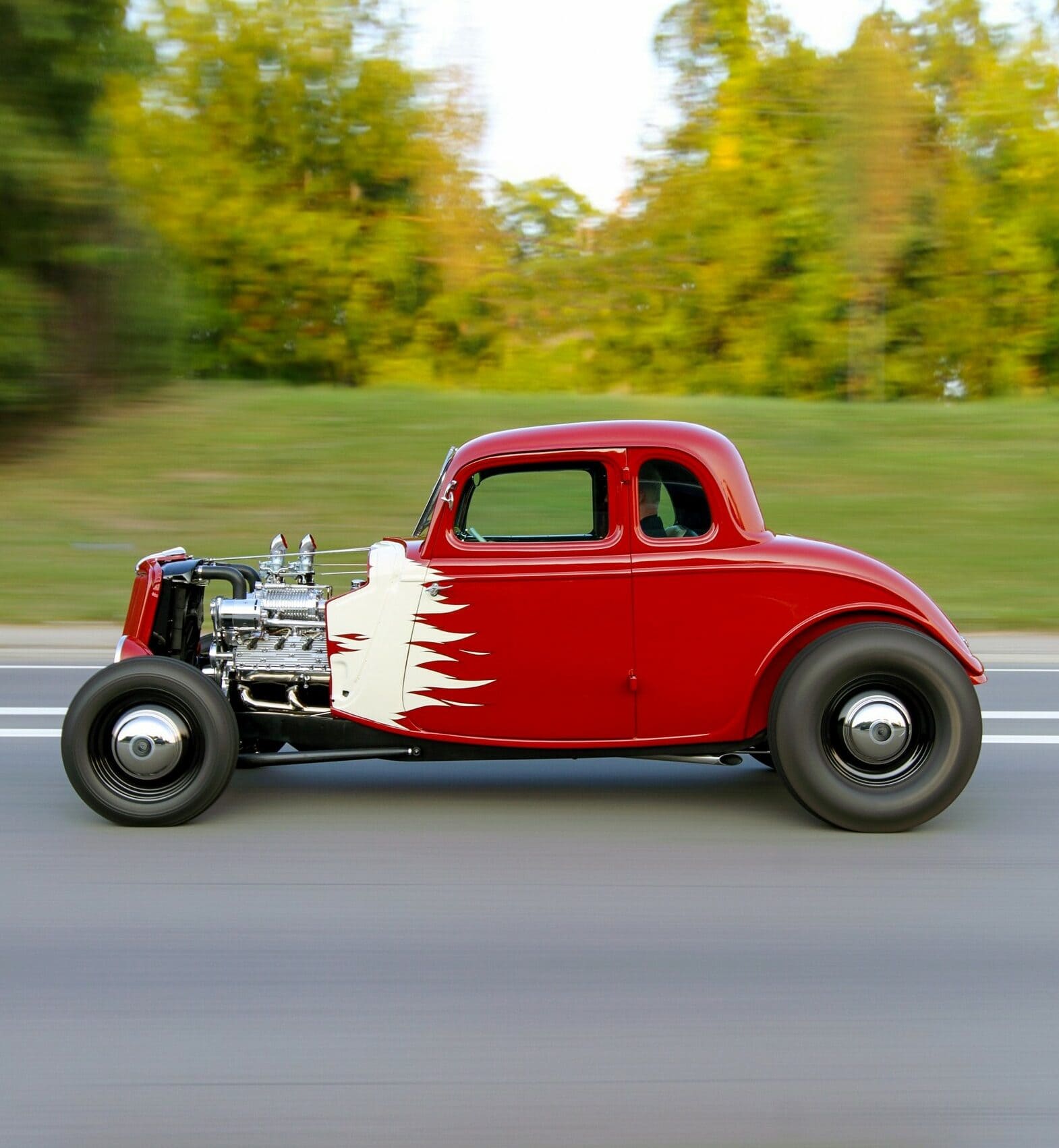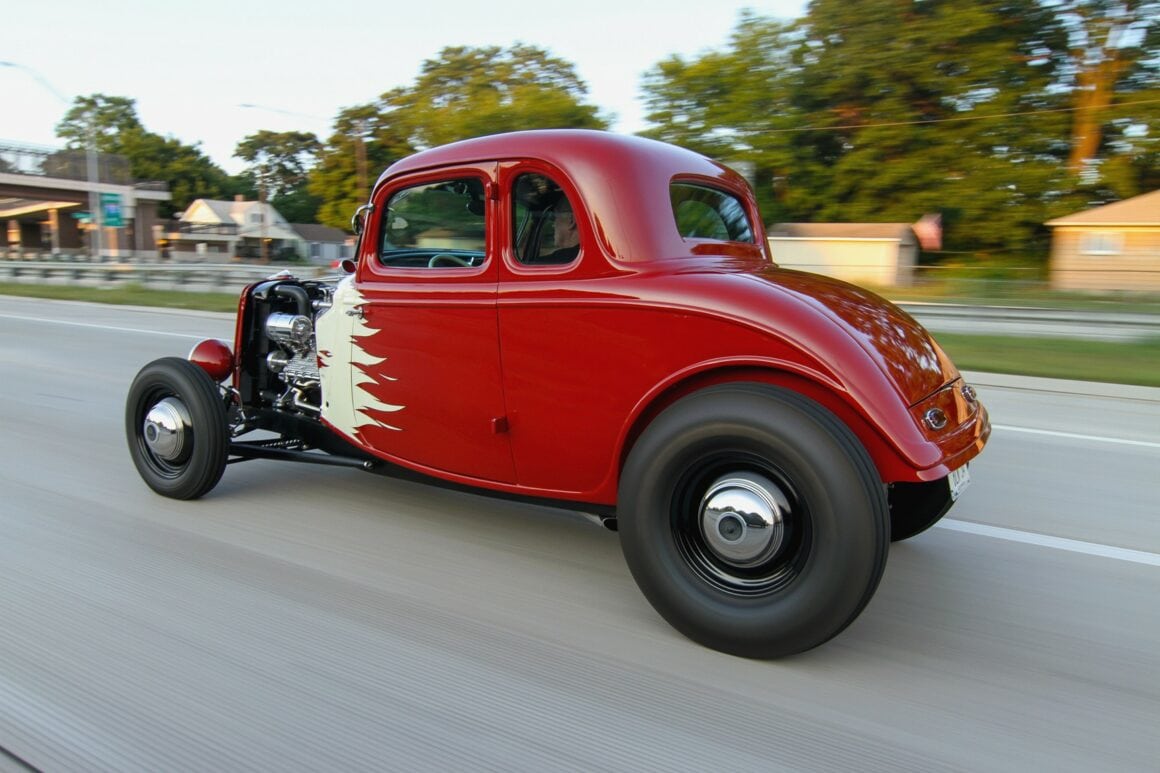 Par exemple, il y a un système électrique de 12 volts soutenu par un alternateur Powermaster moderne qui est niché dans un boîtier de générateur d’apparence traditionnelle ; il y a aussi un radiateur efficace à quatre rangées équipé d’un ventilateur électrique discret aidant le Flathead à garder son sang-froid à tout moment. Le moteur est un véritable bijou, puissant et fiable qui fonctionne très bien et ne chauffe jamais dans la circulation. ce sont des touches modernes enveloppées dans un look classique. Le Hot Rod est également confortable, grâce à une transmission Tremec à cinq vitesses soutenant le Flatty à alimentation forcée avec les 4,11 vitesses du différentiel Winters, l’overdrive de la transmission et les pneus Firestone Coker de 31po…