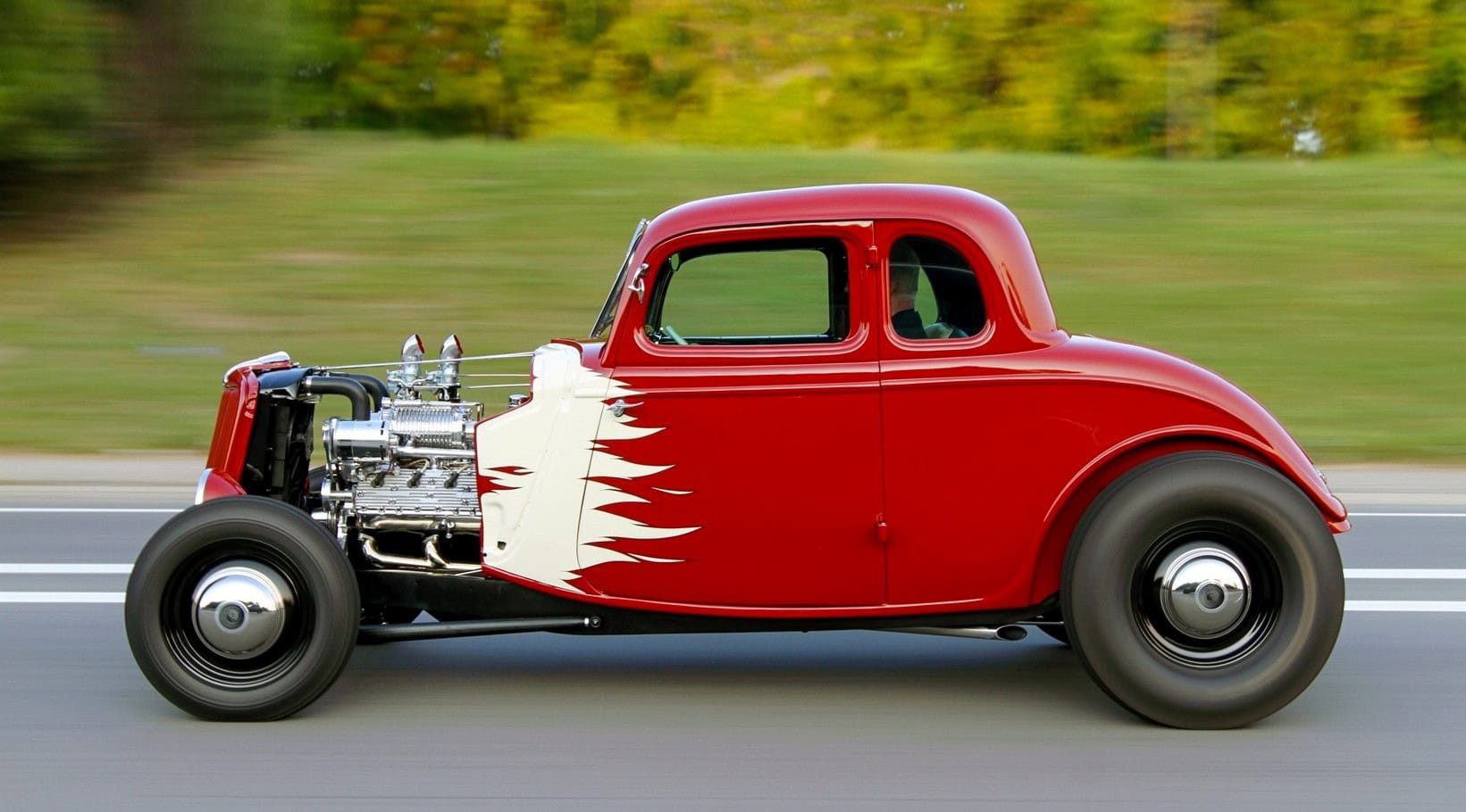 Ce sont les mêmes flammes indéniablement rudimentaires que l’on voyait sur les Streamliners et autres voitures de vitesse de la fin des années’40 et début’50. Chris Piscitelli les a dessinés, Jagenow les a peints en blanc et le maître des flammes “Dr. Ru” les a accentuées avec des contours violets foncés proéminents qui ajoutent une grande dimension aux flammes. “L’effet est à la fois audacieux et sobre”, m’a expliqué Riggle, “C’est une perspective qui a guidé toute la construction”. Sans surprise, l’habitacle du coupé est une étude de minimalisme, équipé d’une banquette simple et traditionnelle bien que garnie de cuir, ainsi que de panneaux de porte assortis, d’un volant de style Ford de 1940 et de compteurs Classic Instruments montés dans le tableau de bord d’origine.