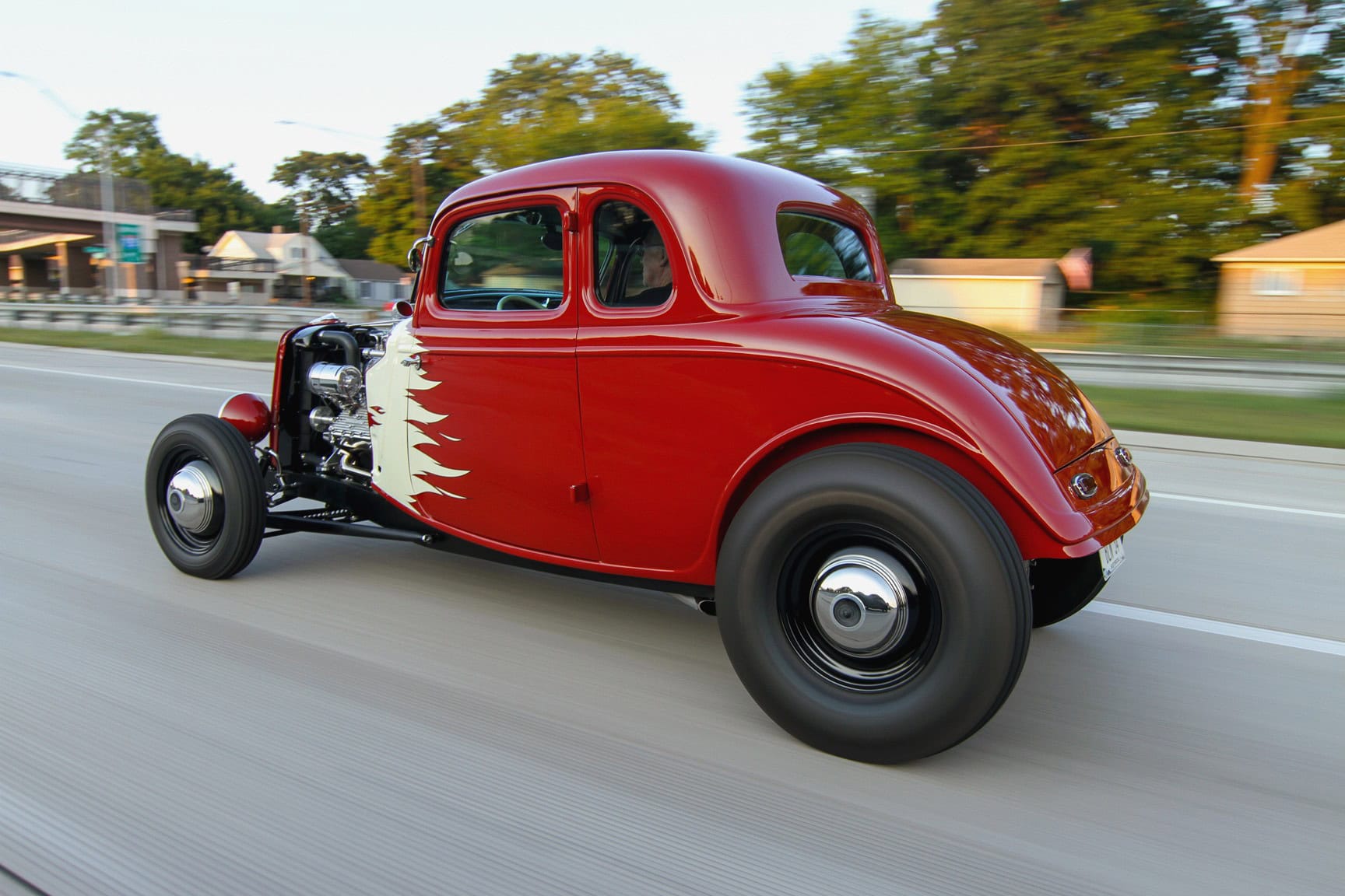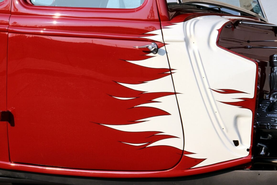 De plus le réservoir de carburant a été déplacé vers le coffre. En plus du toit dépourvu d’e toit ouvrant, le couvercle du pont est rasé, et c’est à peu près tout. Il y a aussi des phares de camions commerciaux, avec clignotants intégrés, et des feux arrière Chevrolet 1941. Simple et direct, mais d’une efficacité dévastatrice. En ce qui concerne la peinture, plusieurs pulvérisations d’autres teintes ont été évaluées, mais c’est un lot de peinture rouge qui s’est avéré parfait pour le coupé. Il a été commandé pour la voiture d’un autre client et était censé être marron, mais le fournisseur a fait une gaffe sur le mélange. Leur erreur rouge brique convenait très bien à la Ford, surtout avec les flammes blanches complémentaires qui s’inspirent des premiers motifs…