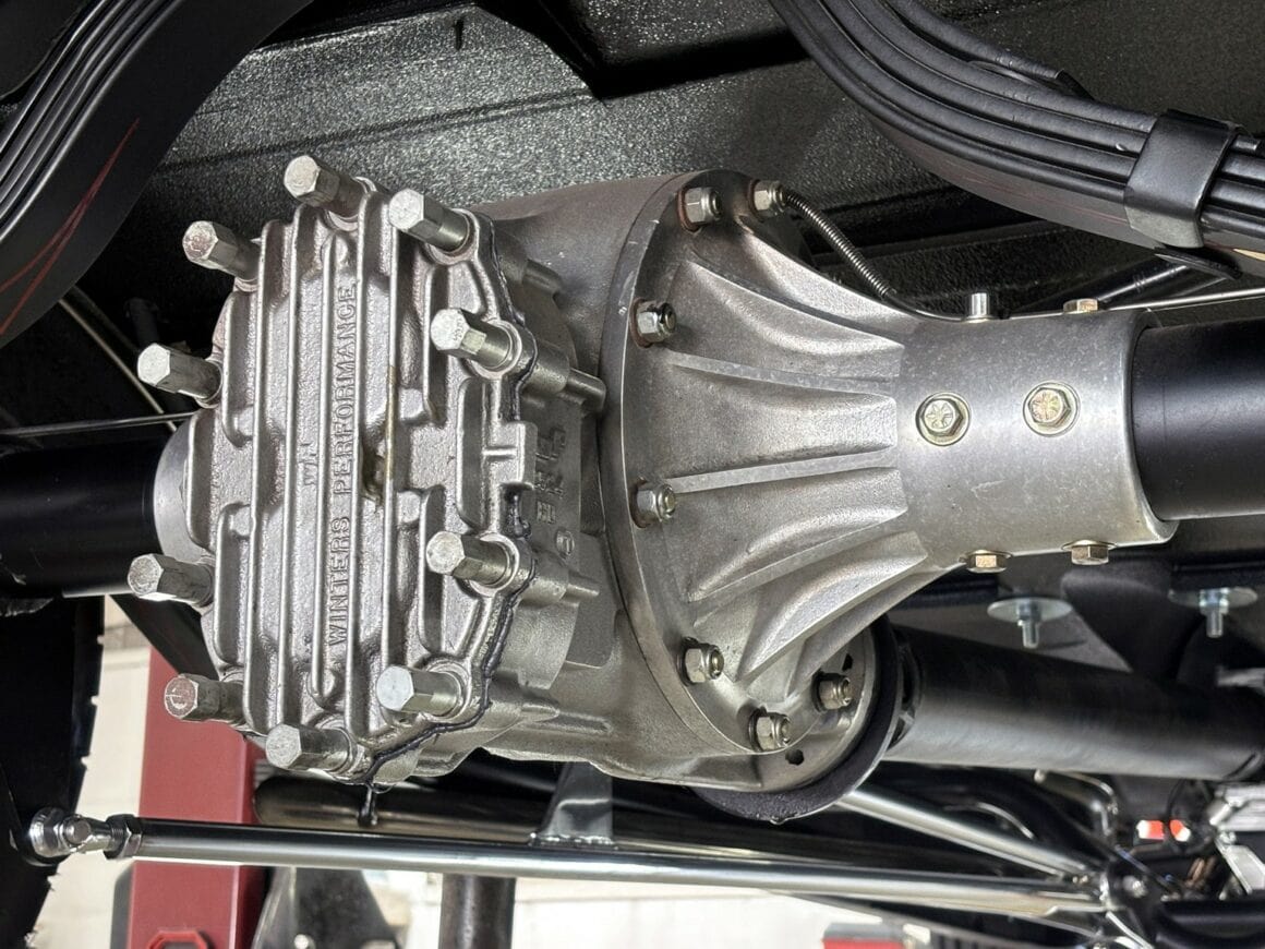 Ils maintiennent par ailleurs le régime de croisière à 1.800 tr/min à 65 mph. Parmi les autres détails de la transmission, je cite les freins à disque avant Wilwood qui sont dissimulés par des couvercles à ailettes qui ressemblent à des tambours Buick vintage. Il y a aussi une suspension arrière traditionnelle à ressorts à lames, et la voiture roule sur des jantes en acier Ford 16po avec des enjoliveurs chromés Brothers Custom personnalisés re-fabriqués par EVOD Industries. Tous les éléments de la transmission sont montés sur un châssis caissonné que Brothers a encoché à l’avant et à l’arrière pour adapter la position de la voiture. La suspension avant a également été convertie en une configuration plus traditionnelle à triangulation divisée.