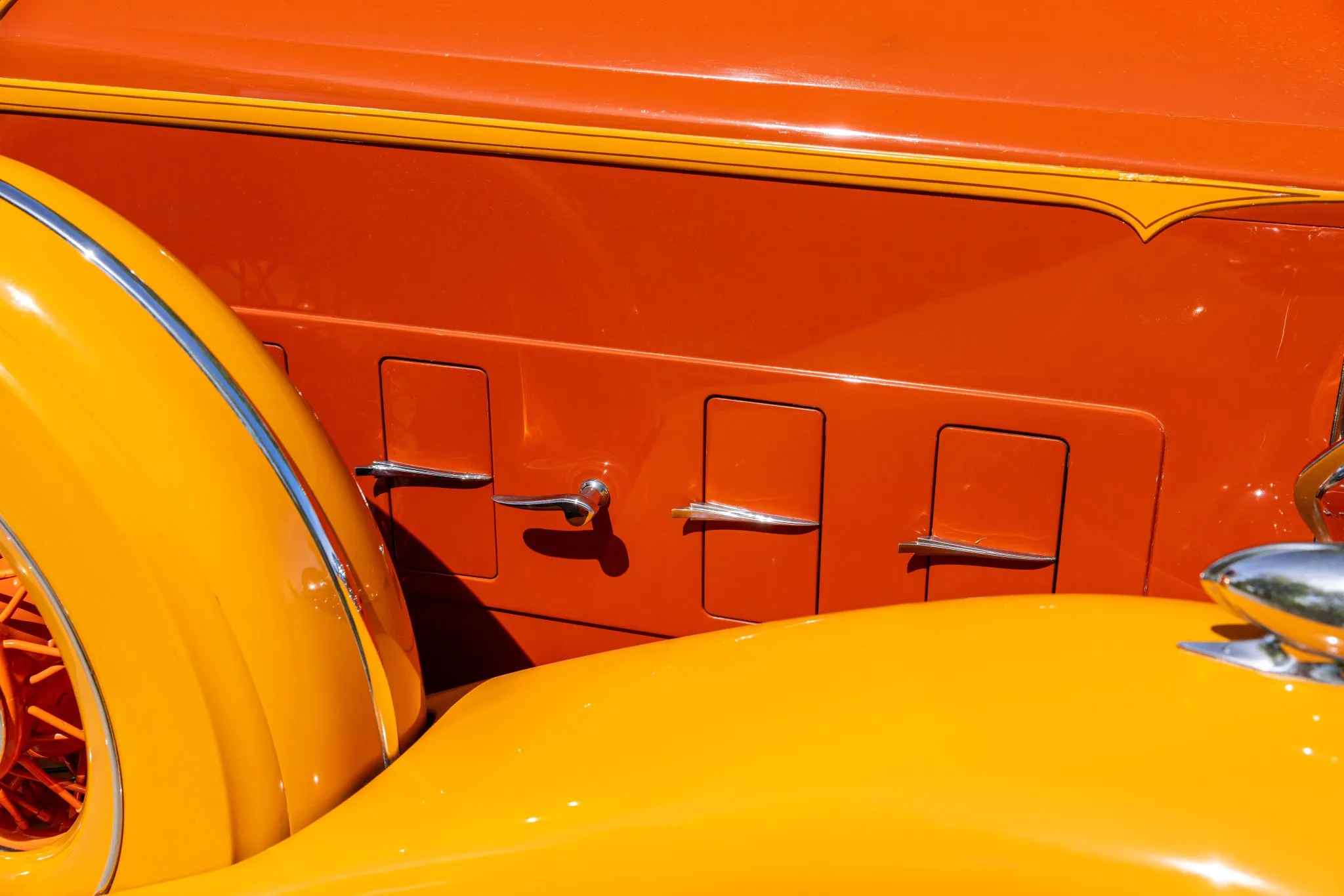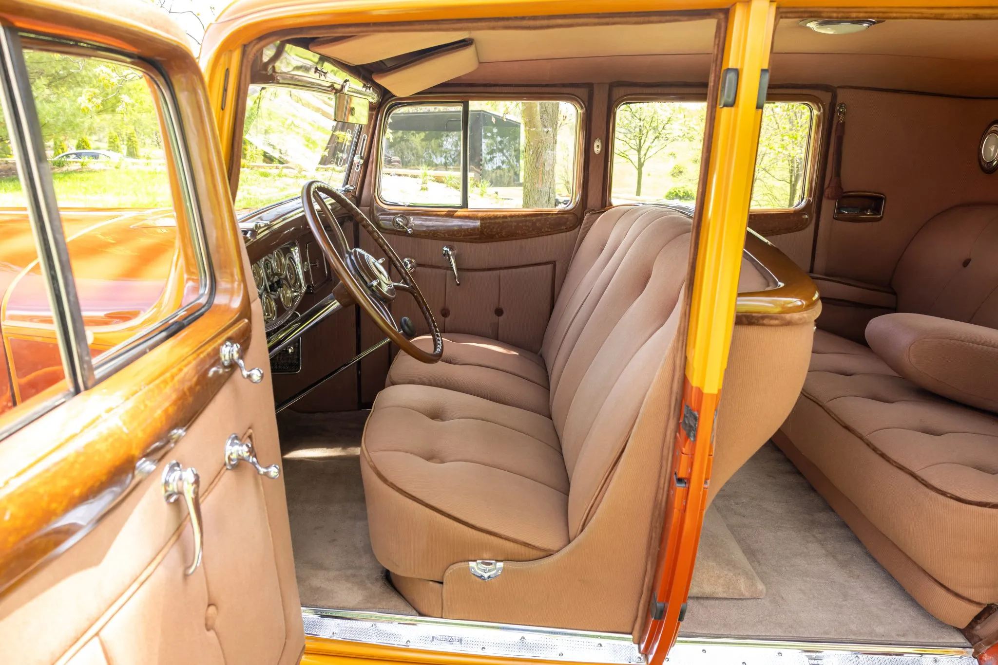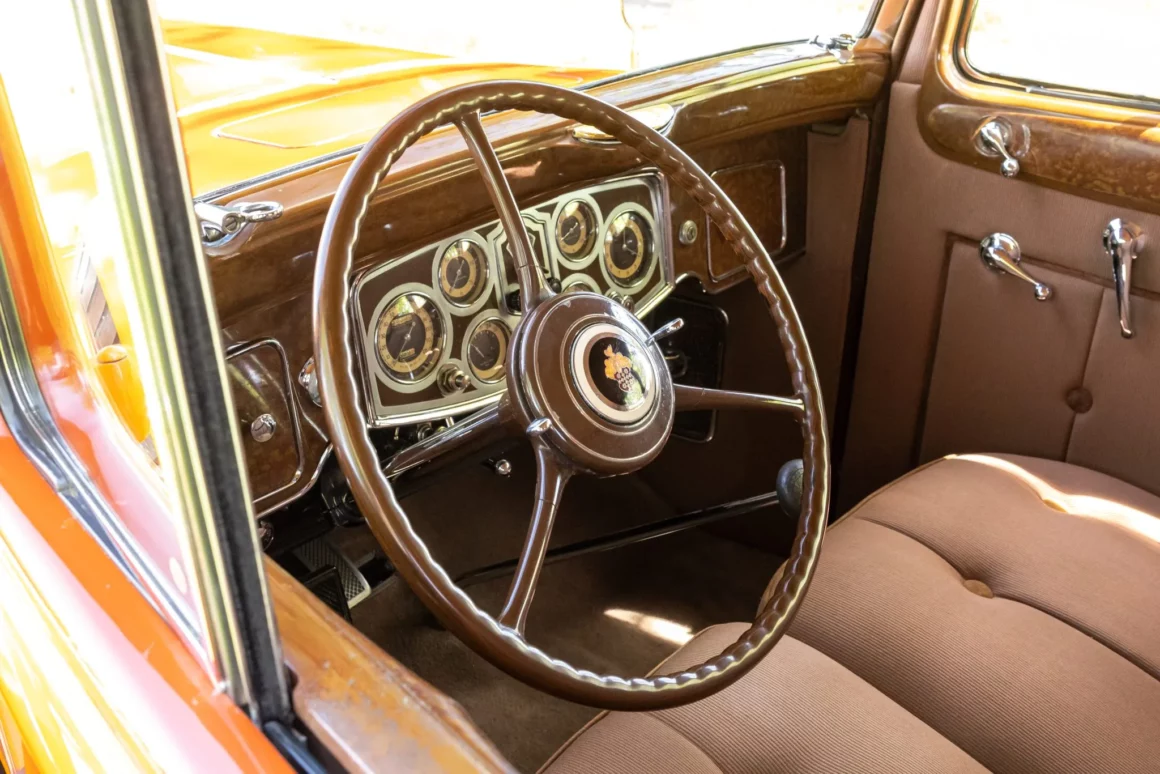 La carrosserie Club Sedan est un excellent exemple du talent de conception interne de Packard. Cette voiture a fait l’objet d’une restauration de haute qualité il y a de nombreuses années et elle a été bien entretenue au fil des ans, plus récemment dans le cadre d’une collection d’automobiles importantes de l’ère classique. Finie en rouge et orange sur une sellerie de couleur beige, elle dispose, telle qu’elle, d’un caractère “Politiquement-incorrect” qui en fait le choix parfait pour les randonnées et le plaisir de conduire détendu.