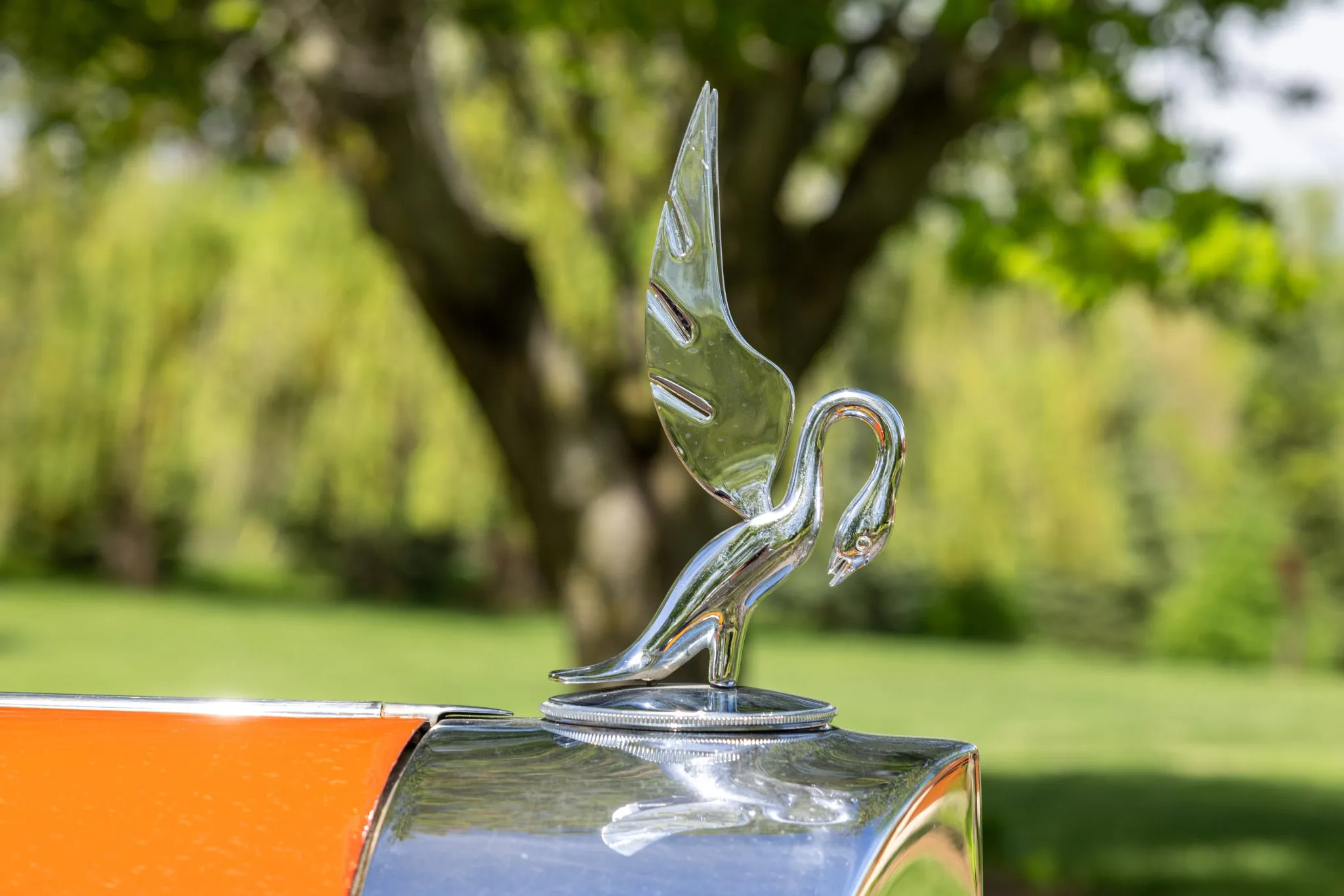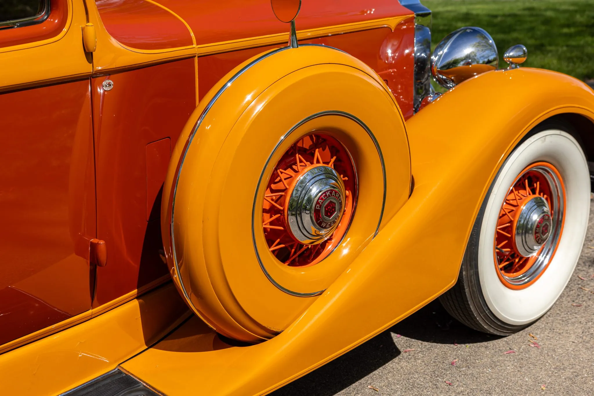 Dans l’ensemble, la restauration fut de haute qualité. De même, l’alignement de la carrosserie est excellent et les quatre portes s’adaptent bien. Les accessoires d’époque comprennent la célèbre mascotte de Cormoran au sommet de la coque du radiateur de la couleur de la carrosserie, des roues de secours se situent sur les ailes AV, avec des feux de route Pilot Ray. Un porte-bagages de coffre arrière complète le coffre intégré. Équipée de jantes à rayons peintes et de larges pneus à flancs blancs, cette Packard a une présence attrayante.