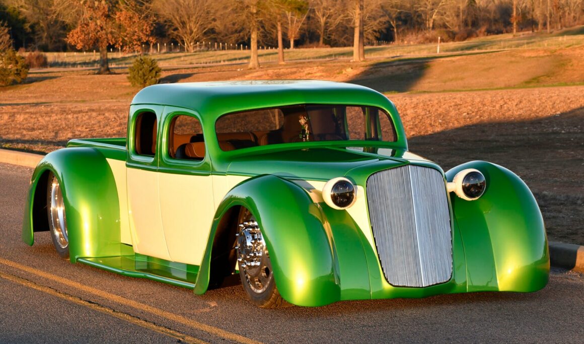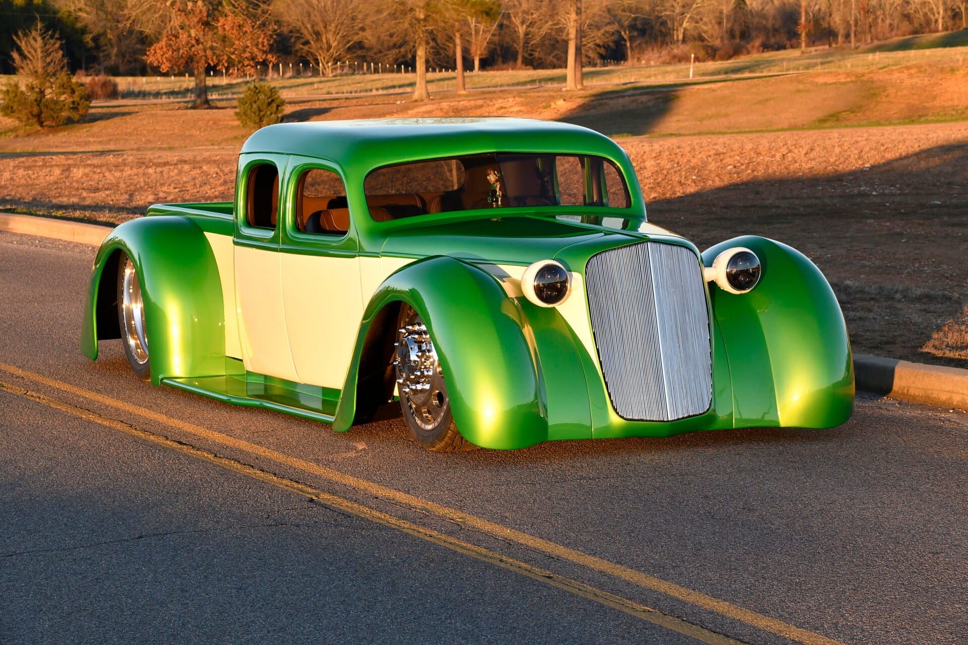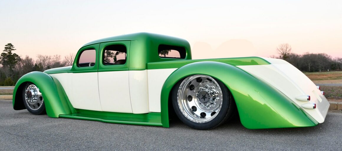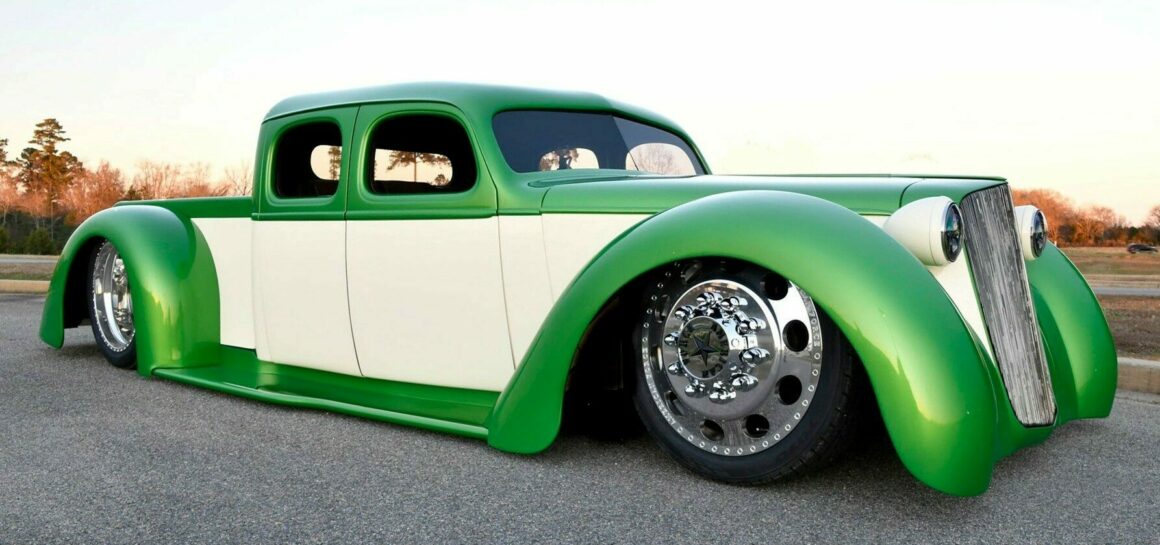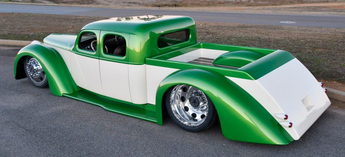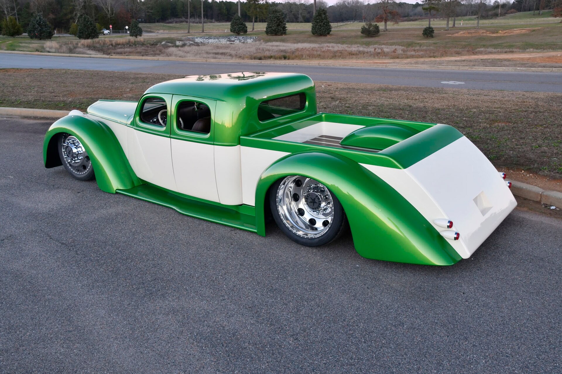 CARROSSERIE : Berline Chevy Master 4 portes 1936, élargie de 12 pouces, quatre portes suicide, ailes avant de camion international 1940 de 1 tonne, ailes arrière Diamond-T des années 1930, marchepieds personnalisés, calandre fabriquée à la main, lit de style sévillan greffé à la carrosserie de la berline, plancher de caisse en noyer noir, bouchon de remplissage à loquet tactile, réservoir de carburant monté à l’arrière, phares et feux arrière vintage équipés de LED, camion tout en acier arborant une peinture Matrix Green Dream et Off-White.