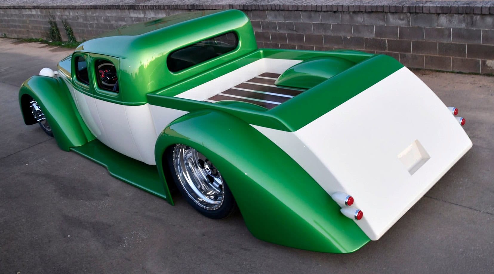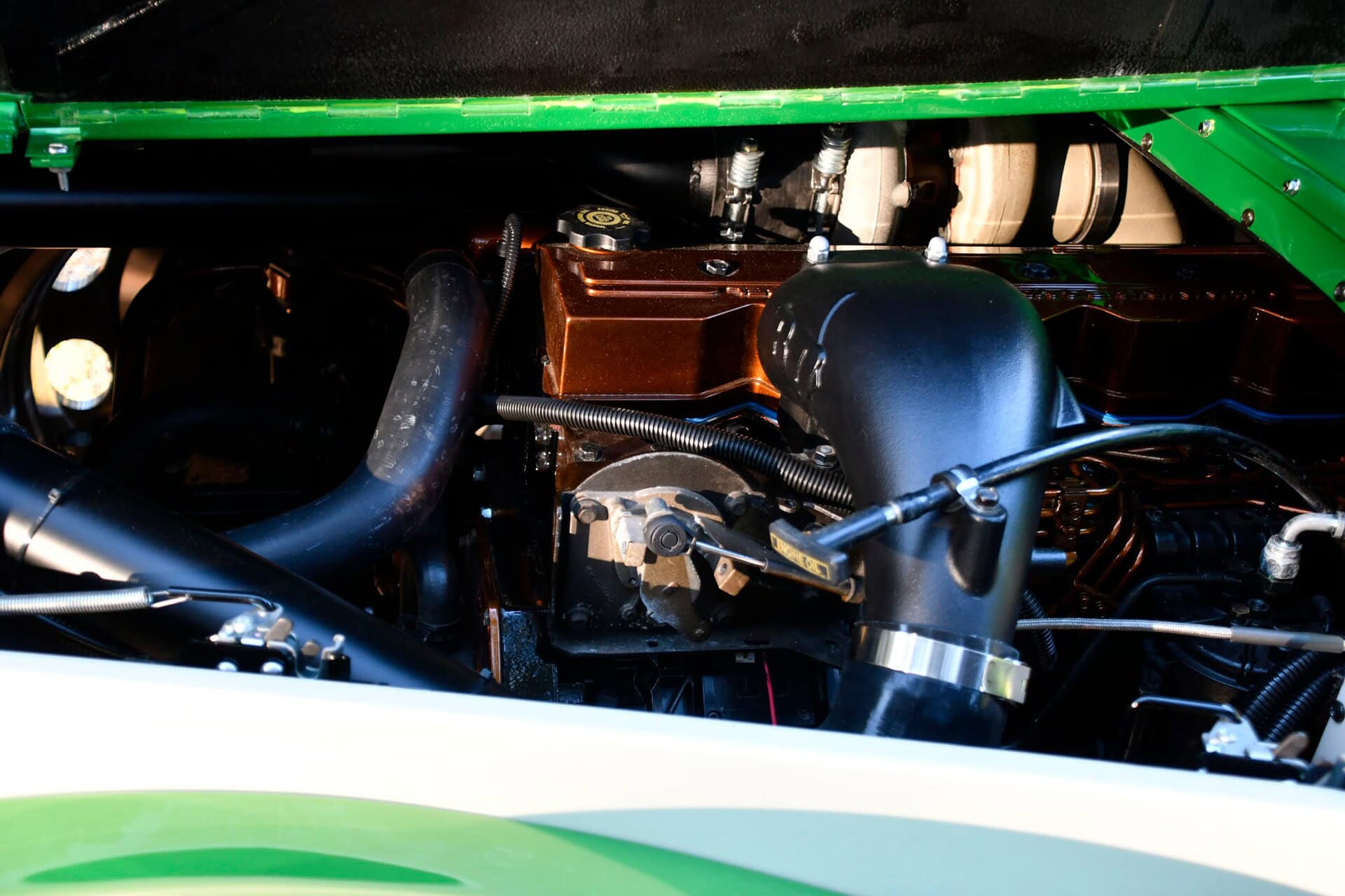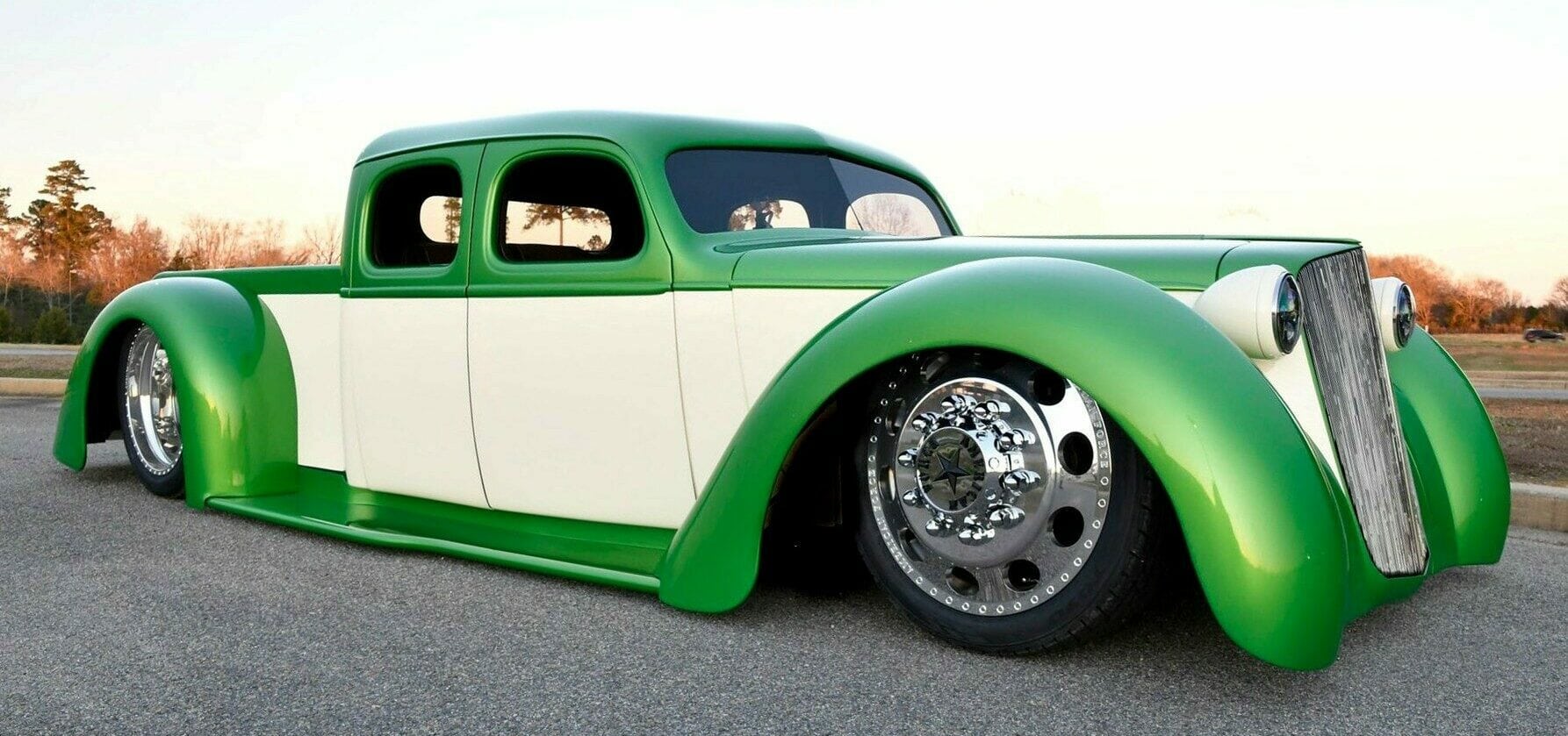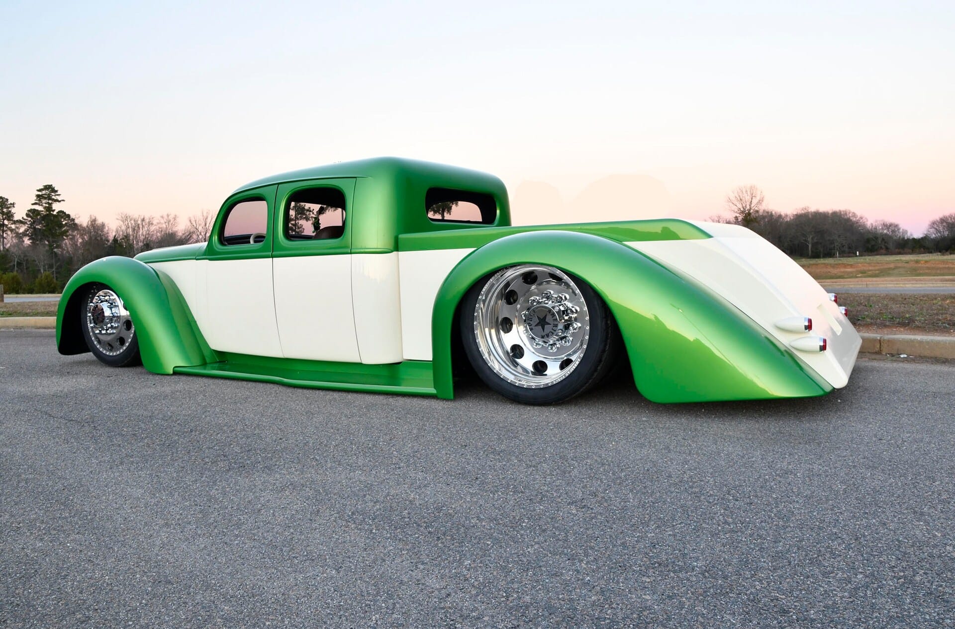 CARROSSERIE : Berline Chevy Master 4 portes 1936, élargie de 12 pouces, quatre portes suicide, ailes avant de camion international 1940 de 1 tonne, ailes arrière Diamond-T des années 1930, marchepieds personnalisés, calandre fabriquée à la main, lit de style sévillan greffé à la carrosserie de la berline, plancher de caisse en noyer noir, bouchon de remplissage à loquet tactile, réservoir de carburant monté à l’arrière, phares et feux arrière vintage équipés de LED, camion tout en acier arborant une peinture Matrix Green Dream et Off-White.