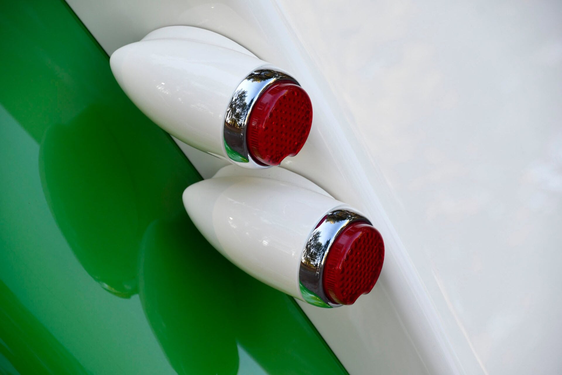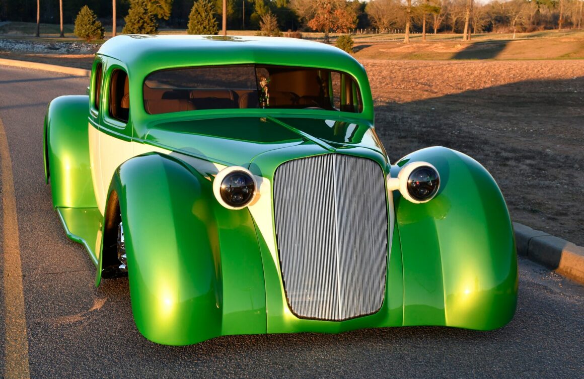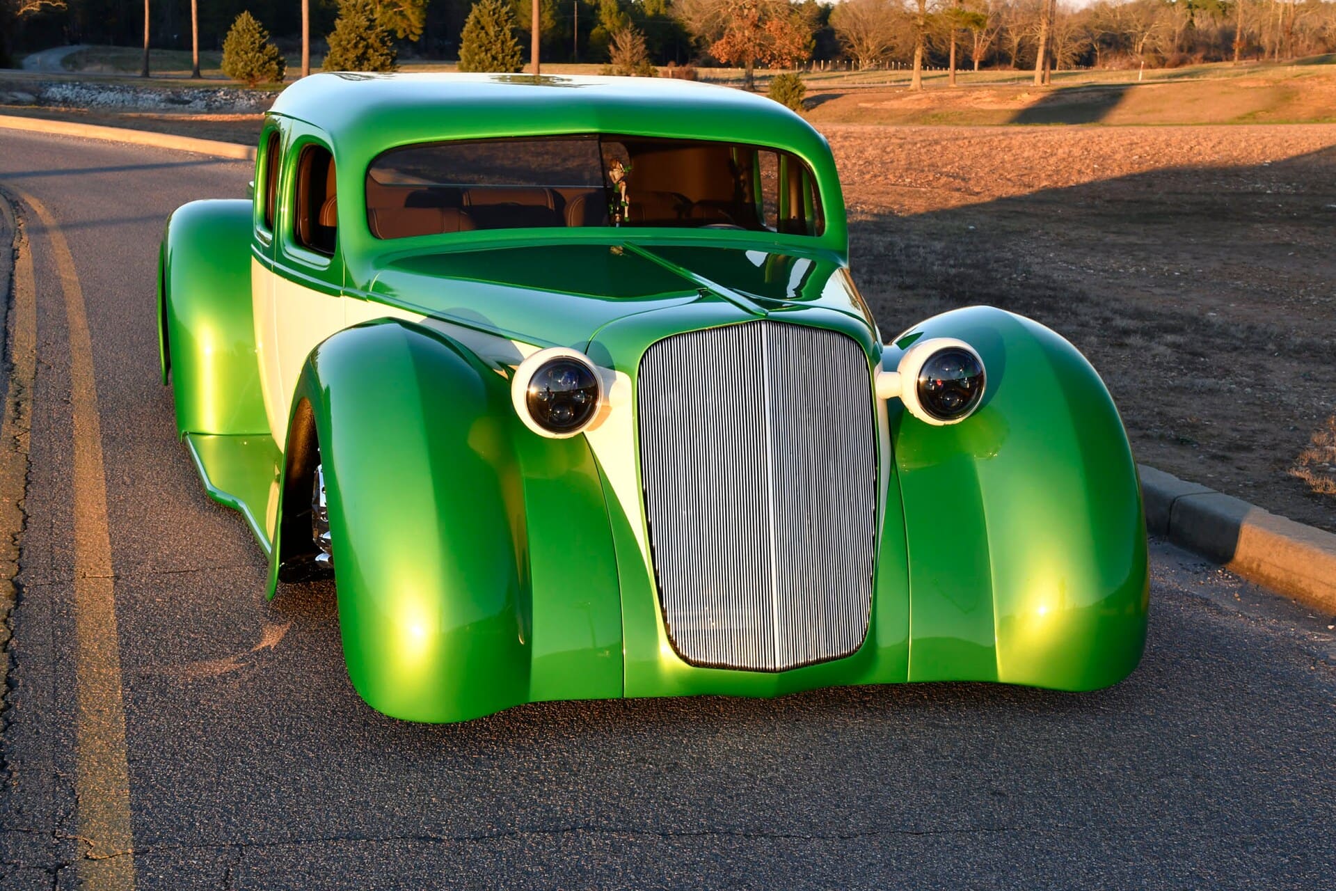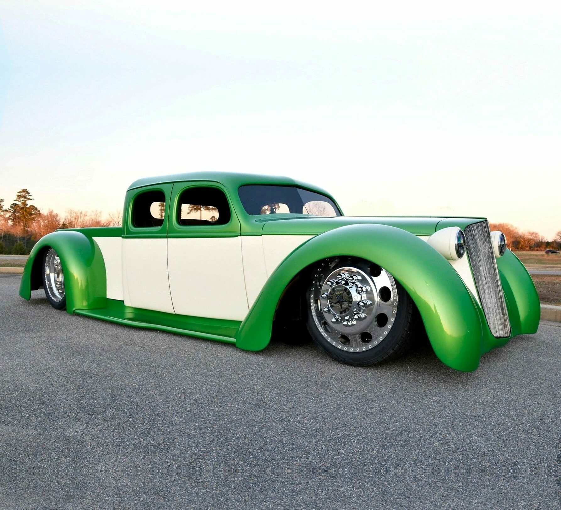 CARROSSERIE : Berline Chevy Master 4 portes 1936, élargie de 12 pouces, quatre portes suicide, ailes avant de camion international 1940 de 1 tonne, ailes arrière Diamond-T des années 1930, marchepieds personnalisés, calandre fabriquée à la main, lit de style sévillan greffé à la carrosserie de la berline, plancher de caisse en noyer noir, bouchon de remplissage à loquet tactile, réservoir de carburant monté à l’arrière, phares et feux arrière vintage équipés de LED, camion tout en acier arborant une peinture Matrix Green Dream et Off-White.