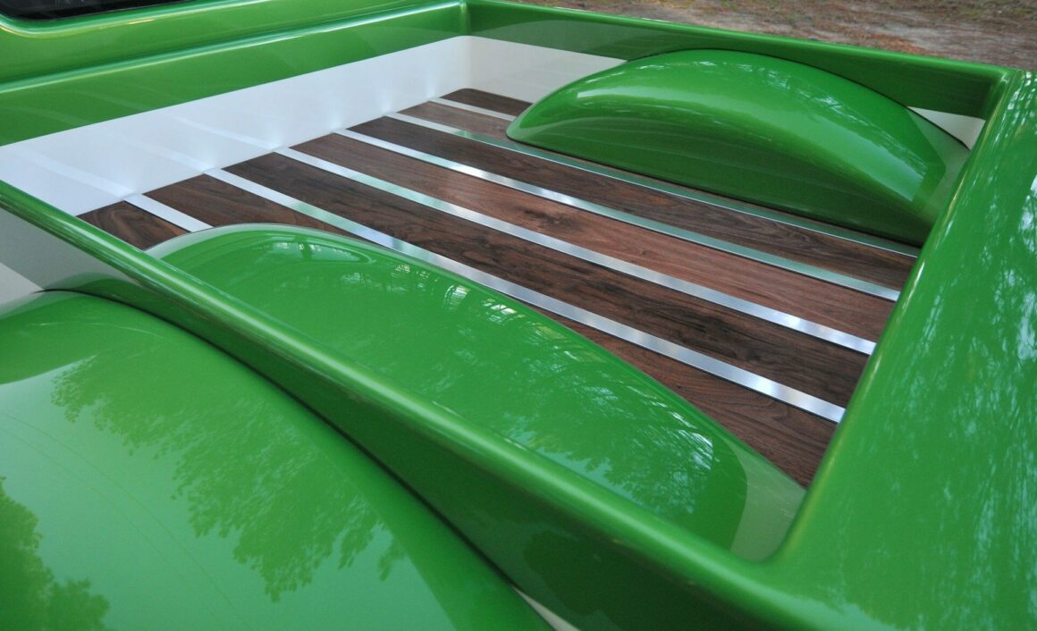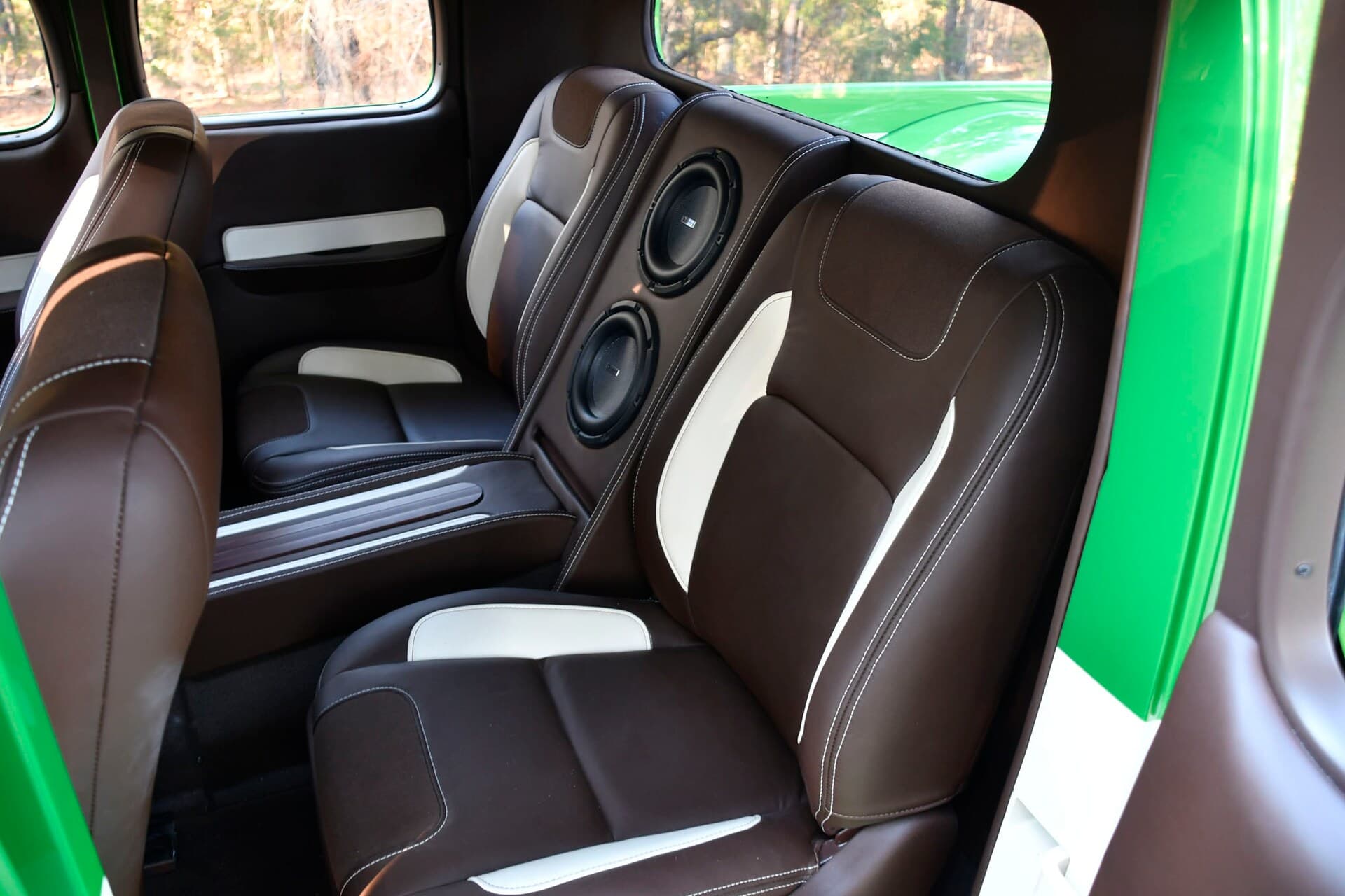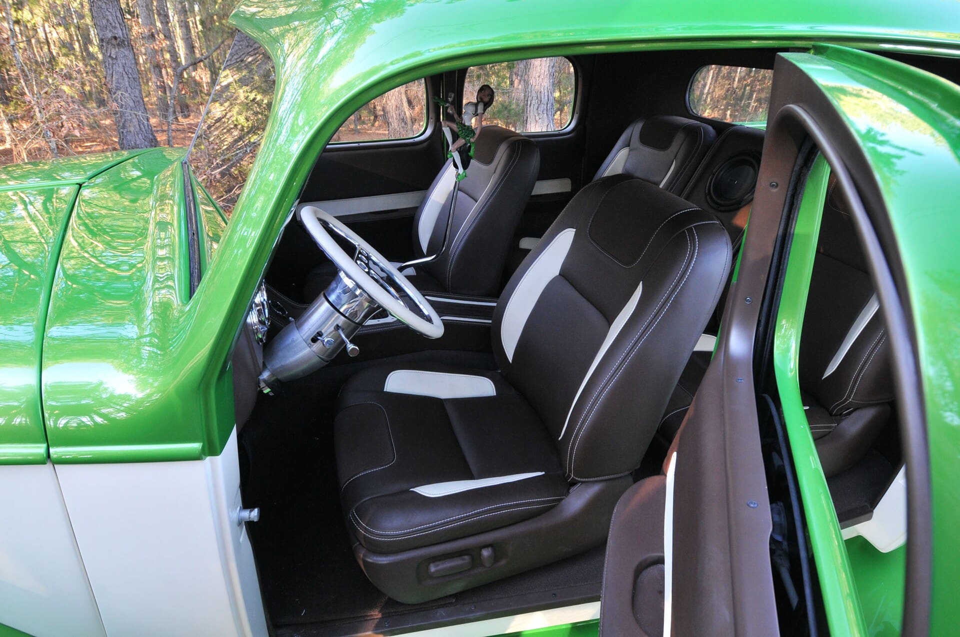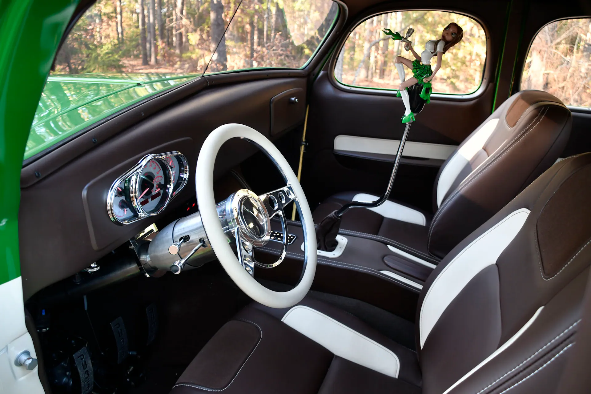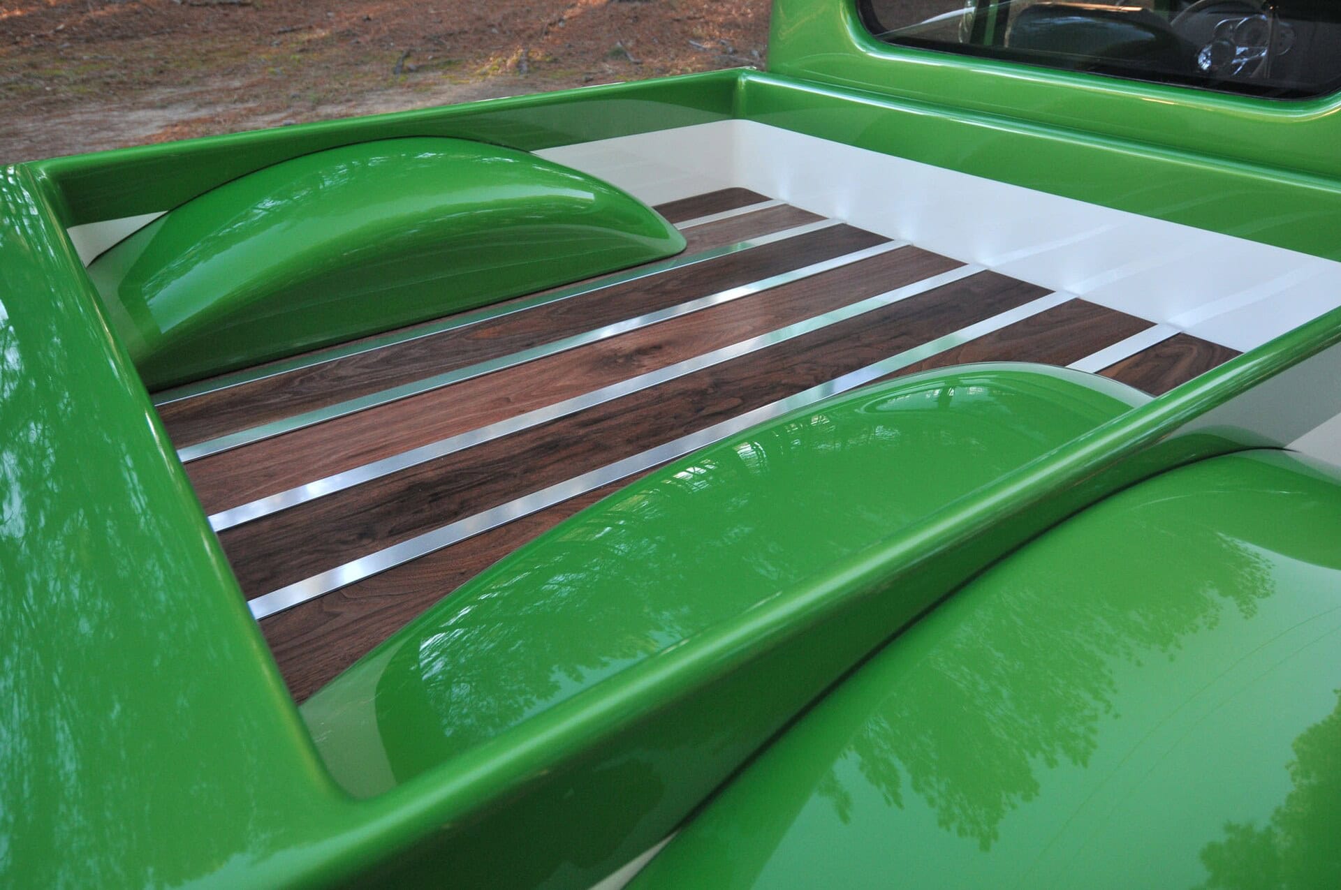 La garniture de toit est un tissu côtelé vintage de 1936 teint en Sumac… et le tapis Daytona Weave a été fabriqué (pour correspondre) par Kirks Kustom Upholstery à Corryton, Tennessee. Chad a peint le tableau de bord et les garnitures avec Matrix Satin Brown en ajoutant des compteurs Dakota Digital pour une touche moderne. Le système audio Bluetooth utilise la liste de musique de l’iPhone de Chad, en passant par une paire de sous-marins Diamond Audio de 8 pouces et quatre ensembles de composants de 6,5 pouces installés par Sturgess Customs à Columbia, en Caroline du Sud. Un volant Billet Specialties ainsi qu’un (trop) grand levier de vitesses Lokar et des poignées de porte permettent à Chad de rester en contact étroit… Les vitres vintage ont été fumées et le noyer noir de la console centrale a été assorti au bois du lit du Pick-up….