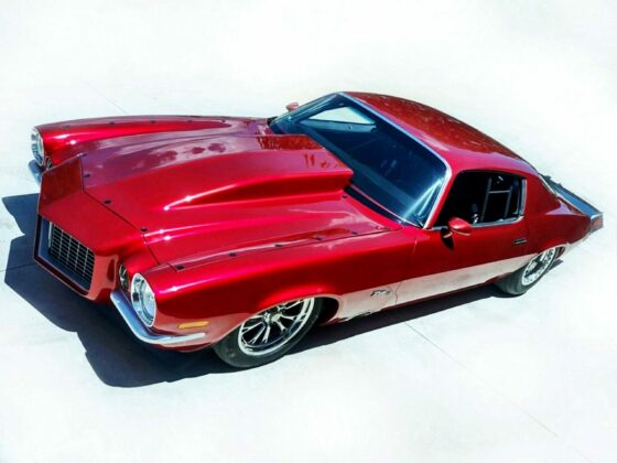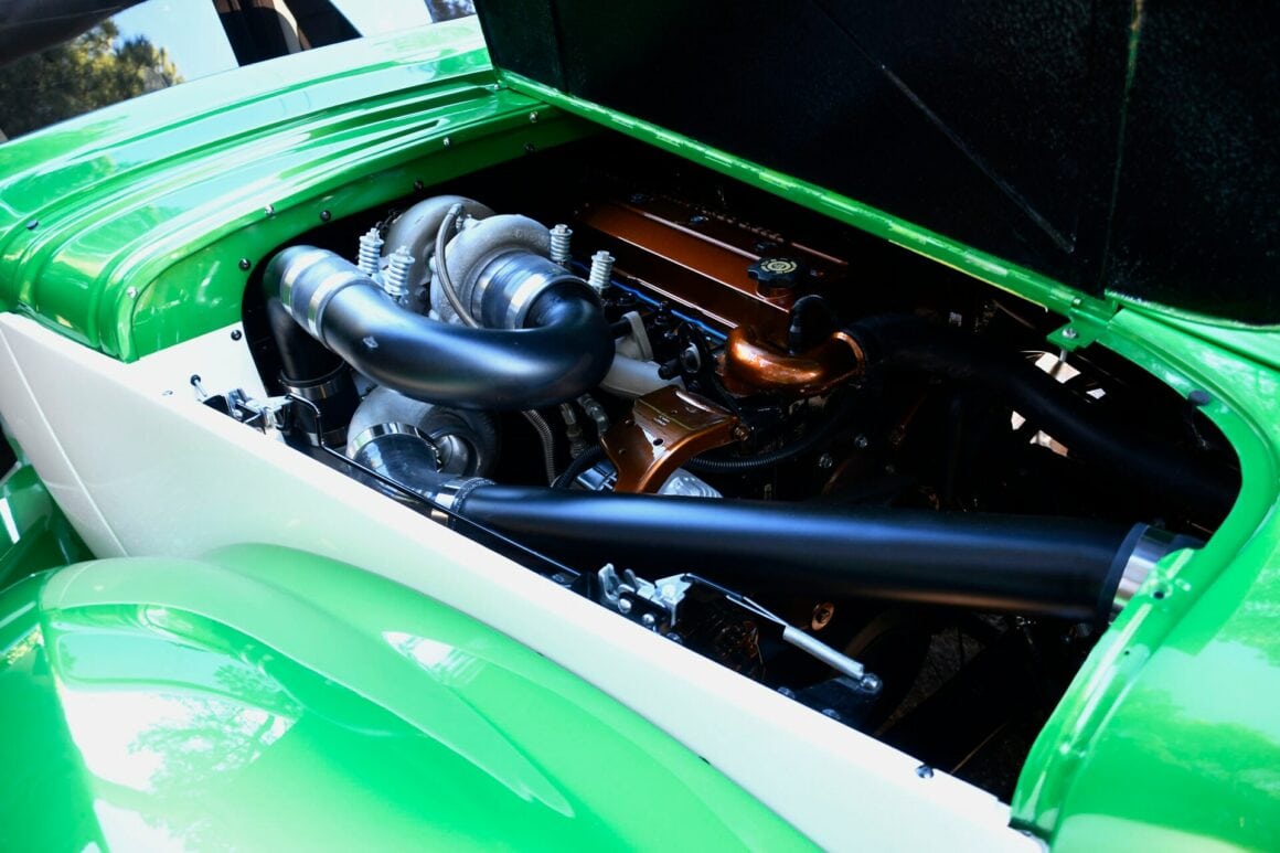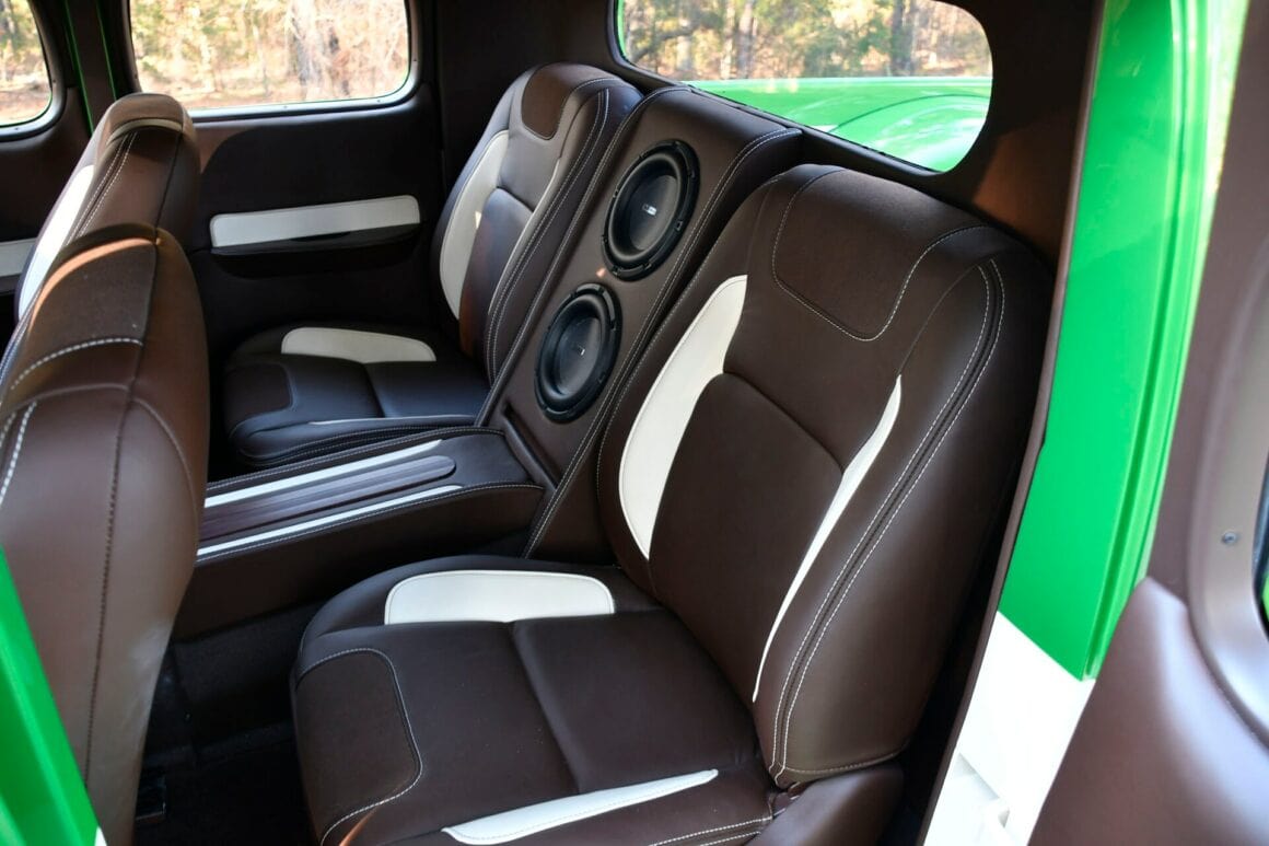 Elle comprenait leur kit turbo de 58 mm et 71 mm avec un système FASS et une combinaison de boulons de têtes plus solides pour gérer le boost. L’ensemble développe une puissance estimée à 750cv avec 1500 lb-pi. Pour gérer les températures, Bell Intercoolers a fabriqué un nouveau radiateur et un refroidisseur intermédiaire en aluminium, puis BJ Broxton et l’équipe de Richards Automotive à Columbia, en Caroline du Sud, ont passé des nuits tardives pour le câblage nécessaire au fonctionnement de la bête. À ce stade, la carrosserie radicale et son nouveau châssis devenaient enfin un véhicule reconnaissable. Il était temps de commencer les travaux de l’intérieur. Quatre sièges baquets provenant d’une Toyota Camry ont été recouvert par la peau de sept vaches, teintes en brun expresso par Douglass Interiors pour couvrir les sièges, les panneaux de porte et la console centrale.