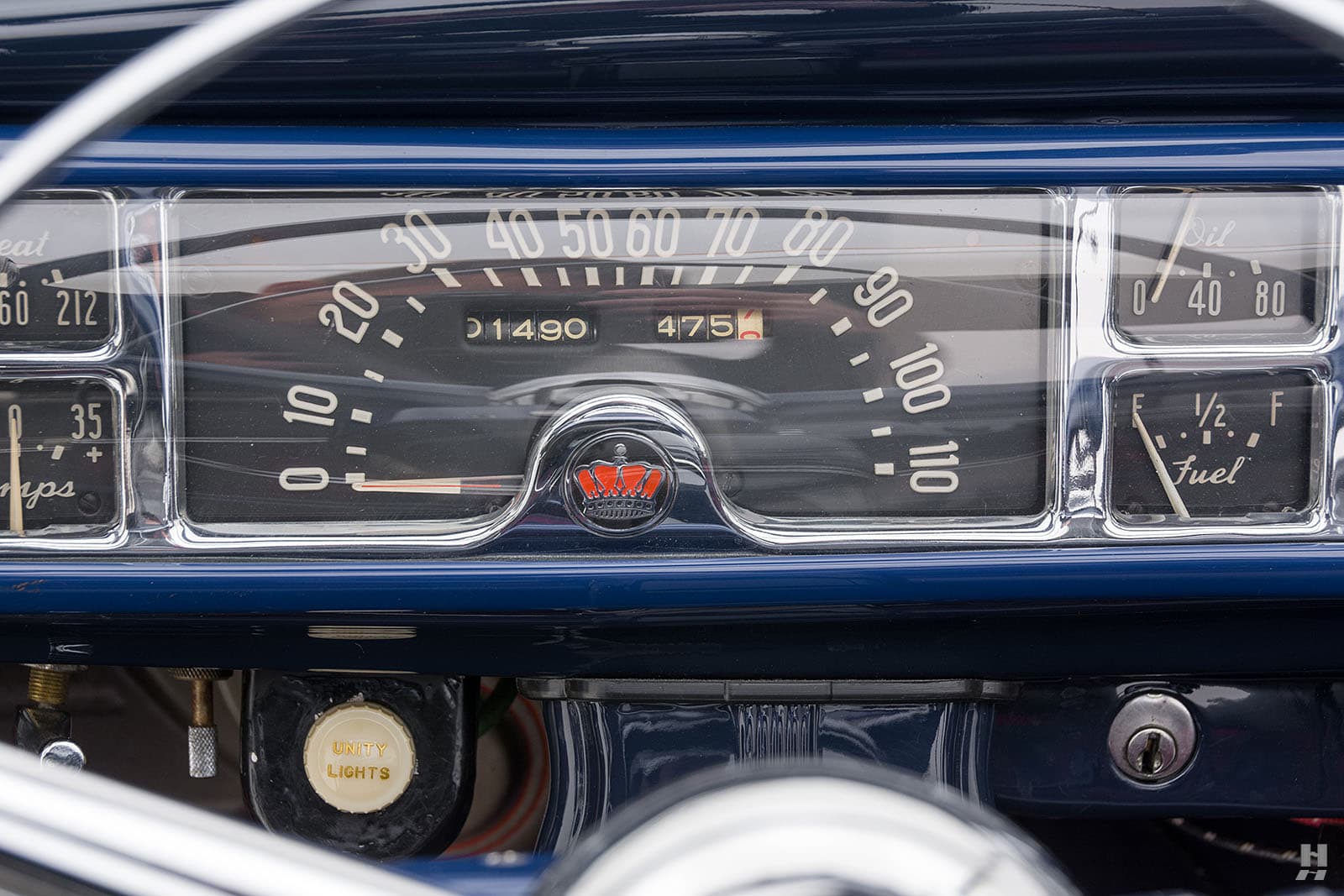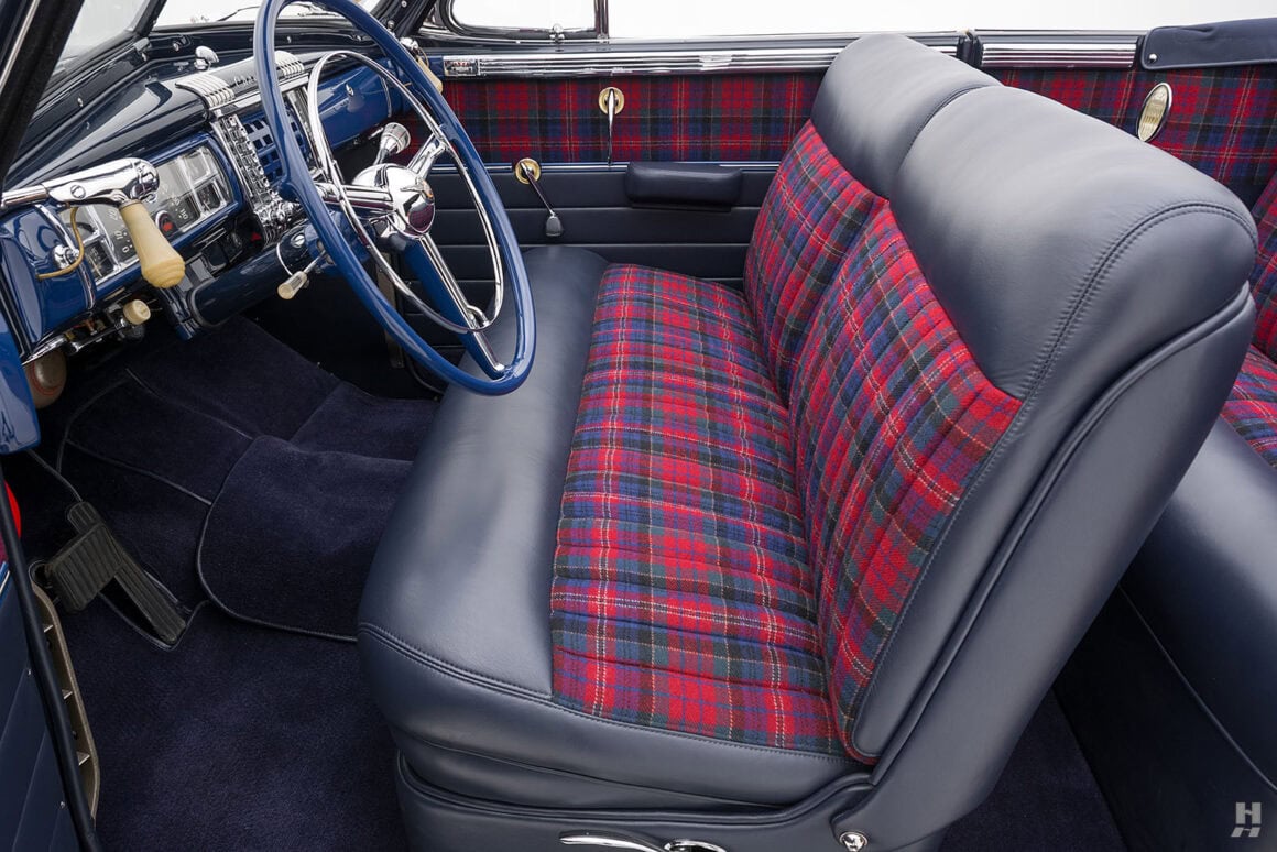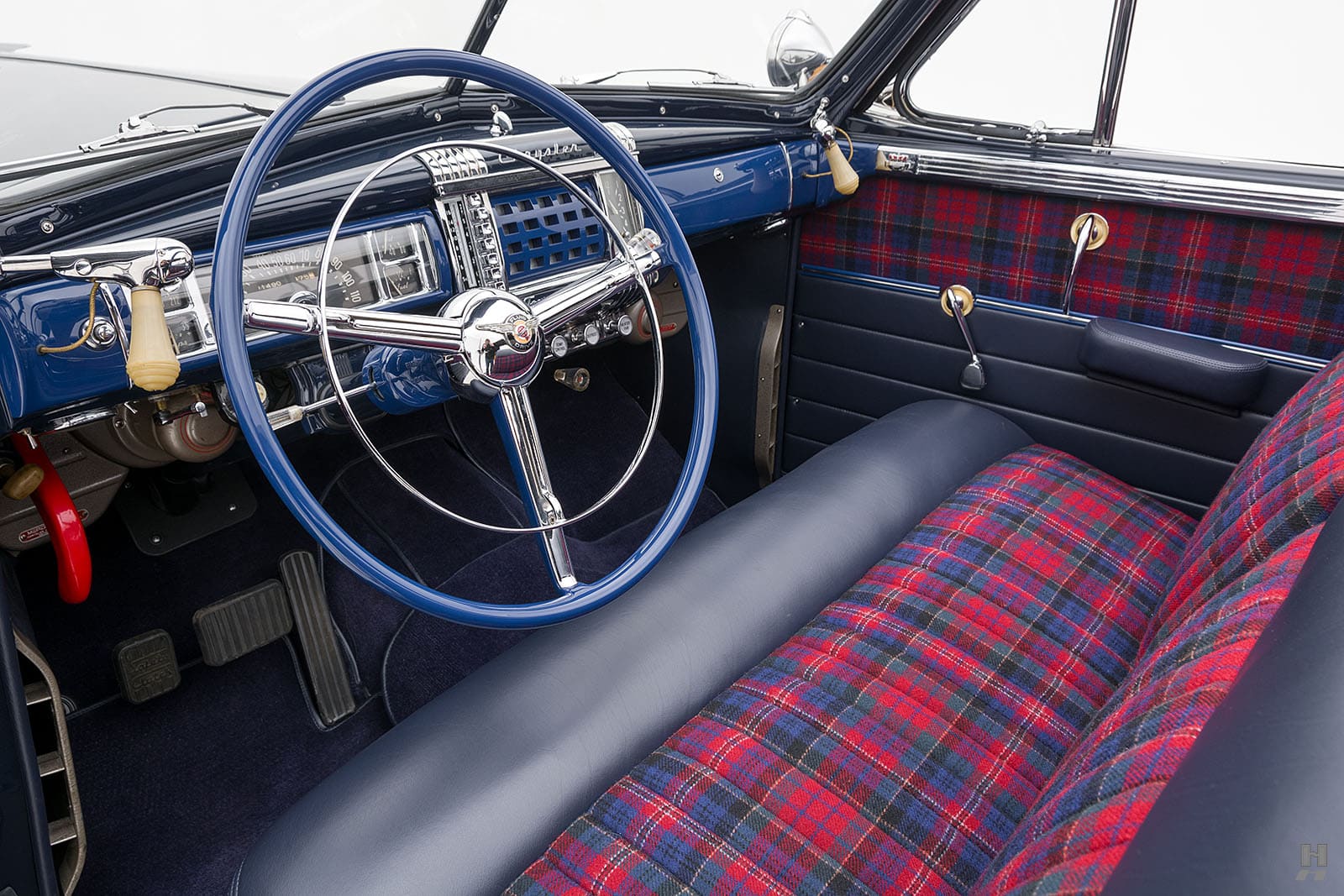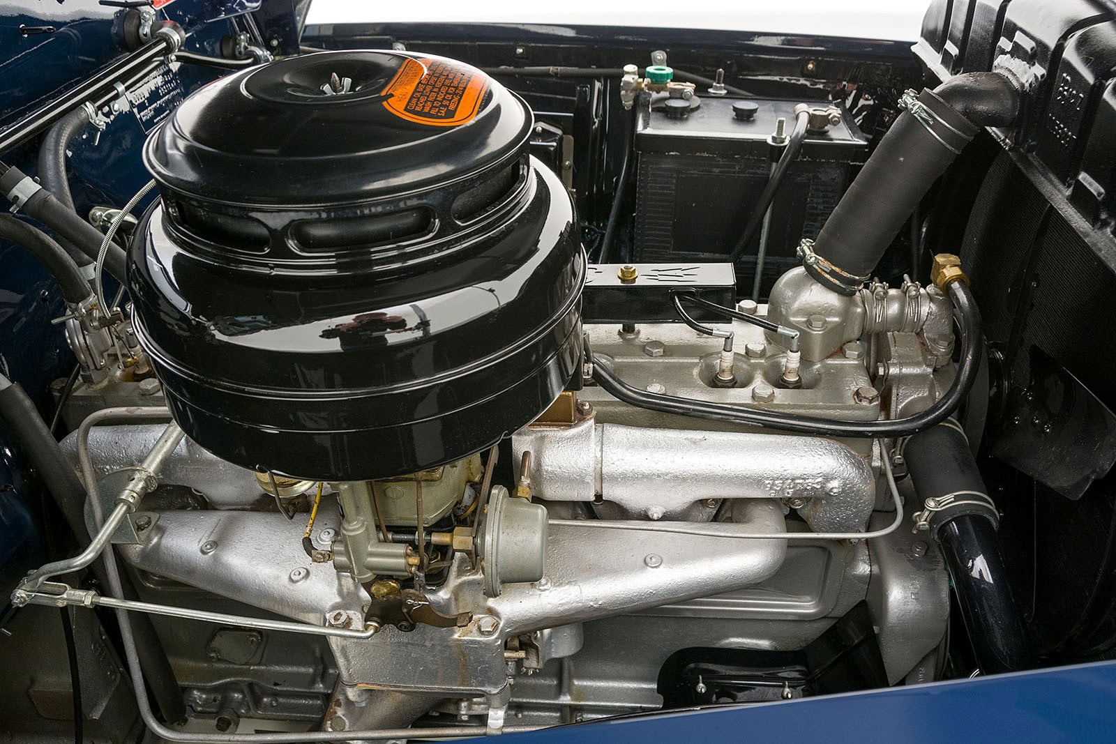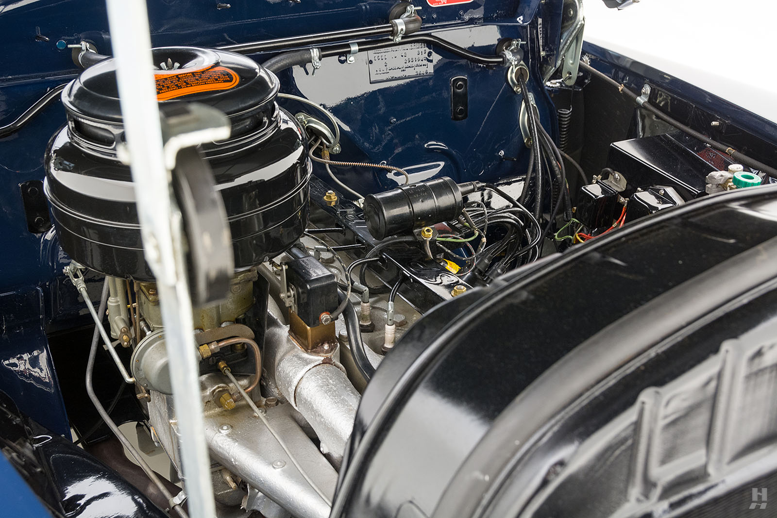 L’habitacle est une belle exposition du style Art déco tardif et du luxe du début de l’après-guerre, avec des tapis et un tableau de bord bicolore qui abrite la radio d’origine, tandis que la transmission Fluid Drive est coiffée du pommeau de levier de vitesses transparent en Lucite. La capote en toile est superbe, et un couvre-coffre assorti est inclus lorsque le toit est plié.