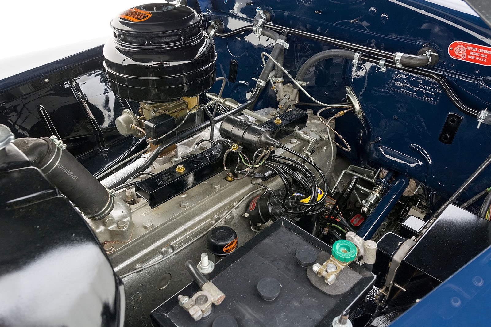 Le coffre est entièrement doublé d’une moquette rembourrée de couleur assortie et comprend une roue de secours et un cric. En soulevant le grand capot, on découvre le moteur huit cylindres en ligne à tête plate (Flathead) de 323,5ci de Chrysler. Il a été minutieusement détaillé et correctement habillé avec des raccords, du matériel, des finitions et des colliers de serrage d’époque.